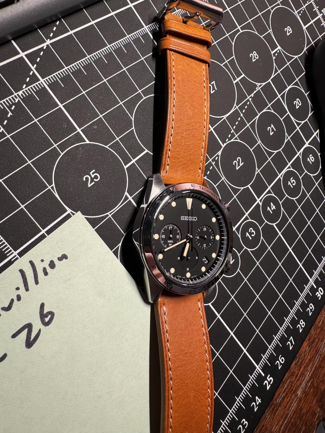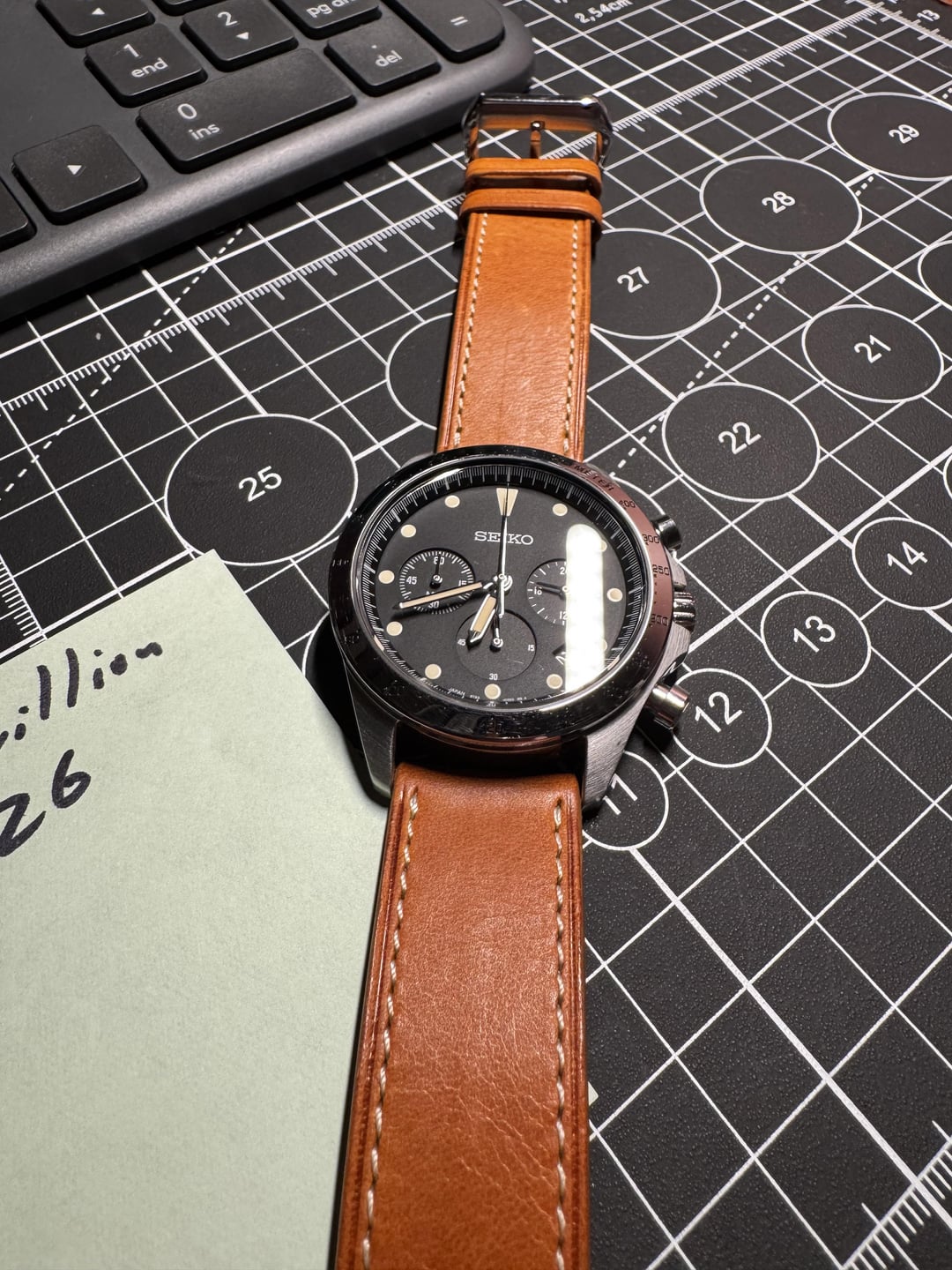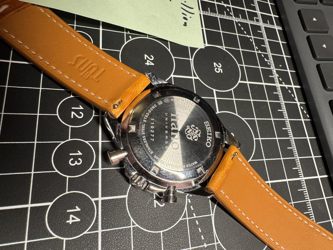 Watch: Seiko Nano Universe JDM Chrono - $320 * Reference Number: 8T63-00N0 * Condition: Good used condition with wear consistent with use, several marks on bezel and caseback, crystal is clear. Works exactly as advertised * Wrist Size: Up to 7.75in on aftermarket leather strap * Case Size: 40mm with 20mm lugs * Notes/Extras: None * Price: $320 shipped insured
