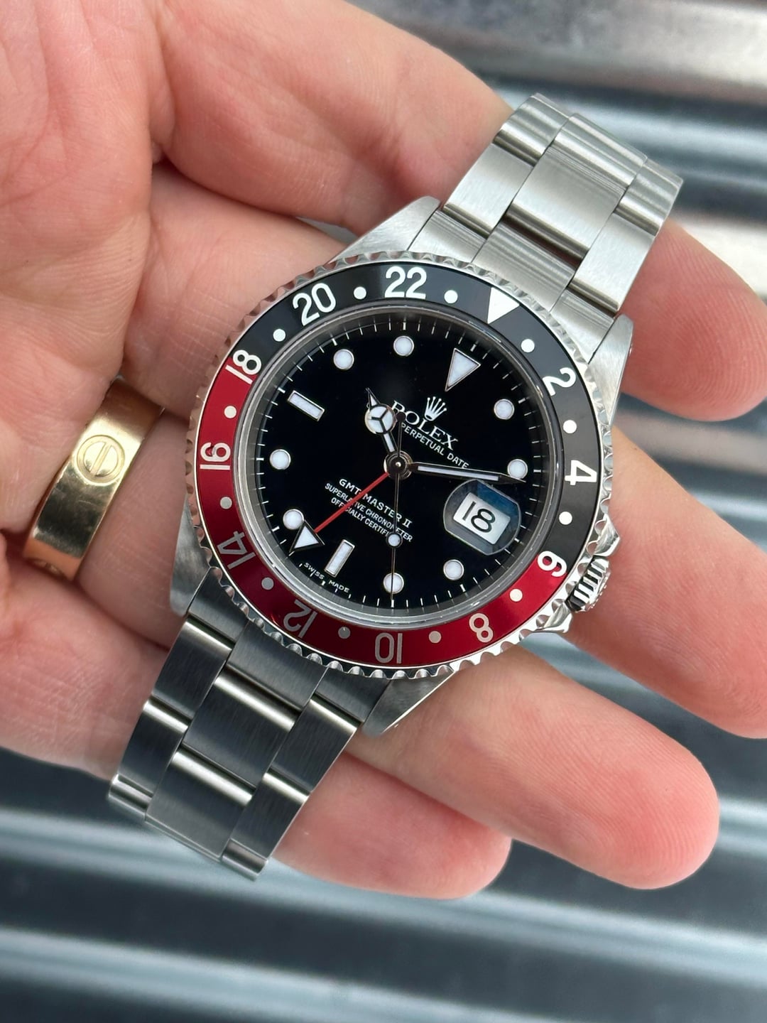 Here we have a beautiful “Coke” Rolex GMT Master II, reference 16710 from 2000. An iconic model in the red & black color way. Reference number: 16710 Serial number: P******* it Dating it to 2000 💰1️⃣1️⃣,5️⃣0️⃣0️⃣➕✈️ COMES WATCH ONLY (see second picture for everything that’s included) The watch is very good shape overall. The coke bezel is really clean for its age. Coming in at 40mm this watch fits the wrist comfortably. “Swiss Made” dial still glows nice and bright. The case is in good shape overall. It has thick lugs with sharp edges. The bracelet is nice and tight. Clean finish on the bracelet and clasp, and the coronet is very defined. 11 links on the bracelet which fits a 7.5 inch wrist. Only a light mark by 6’ o clock on the inset I’d say but not too noticeable. Still looks great. Overall a very clean GMT. 💰1️⃣1️⃣,5️⃣0️⃣0️⃣➕✈️ We accept Zelle/Wire. Shipped with fully insured overnight once payment clears, NO EXCEPTIONS. We have plenty of references across different platforms. Follow our IG for more deals: @215watches [photo album](https://imgur.com/a/YVPIds0) [time stamp](https://imgur.com/a/UPeZZJg)