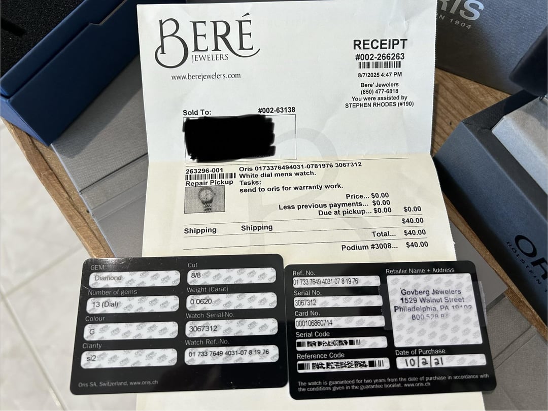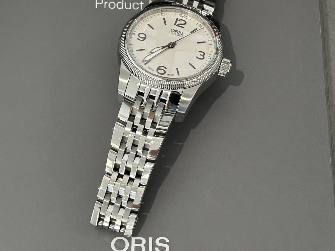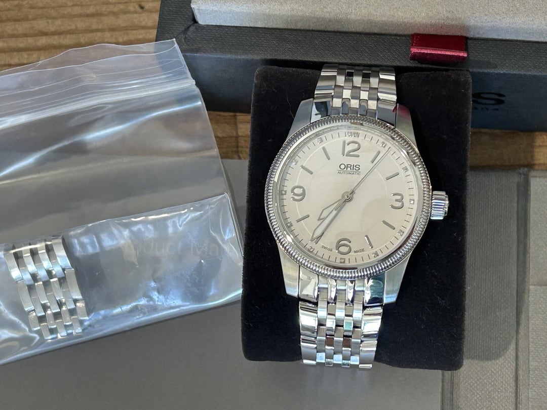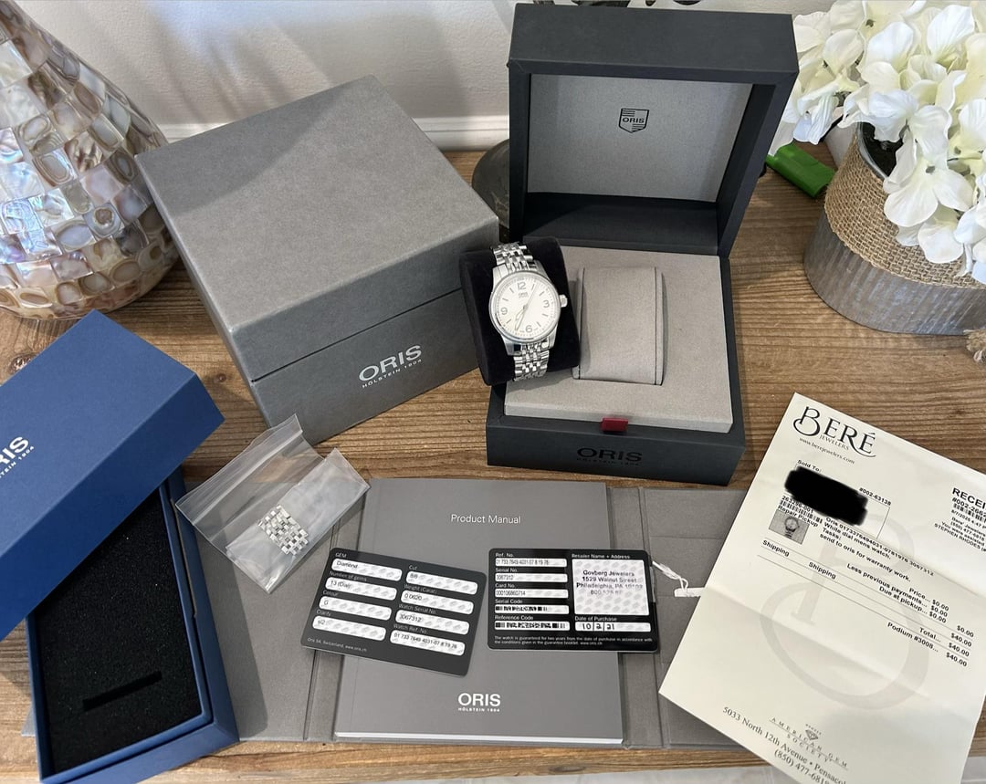 Hi Watchex - Oris Big Crown Diamonds. Ref# on card in photo. 38mm diameter case. Screw down crown. White Dial with diamond hour markers. $700 shipped includes UPS insured ground shipping, CONUS only. No trades please only looking to sell. I will take PayPal G&S with the buyer covering the fee or Zelle. Will also entertain PayPal F&F or Venmo with a positive transaction history. Comes with full kit. I’d call it very good condition. Clasp shows signs of wear and misc small wear on bracelet and case sides as seen in photos. The watch was fully serviced by Oris in August 2025 and is running great as seen on timegrapher photo. I’d be happy to send additional pictures, video, or FaceTime with the watches. Let me know if you have any questions.