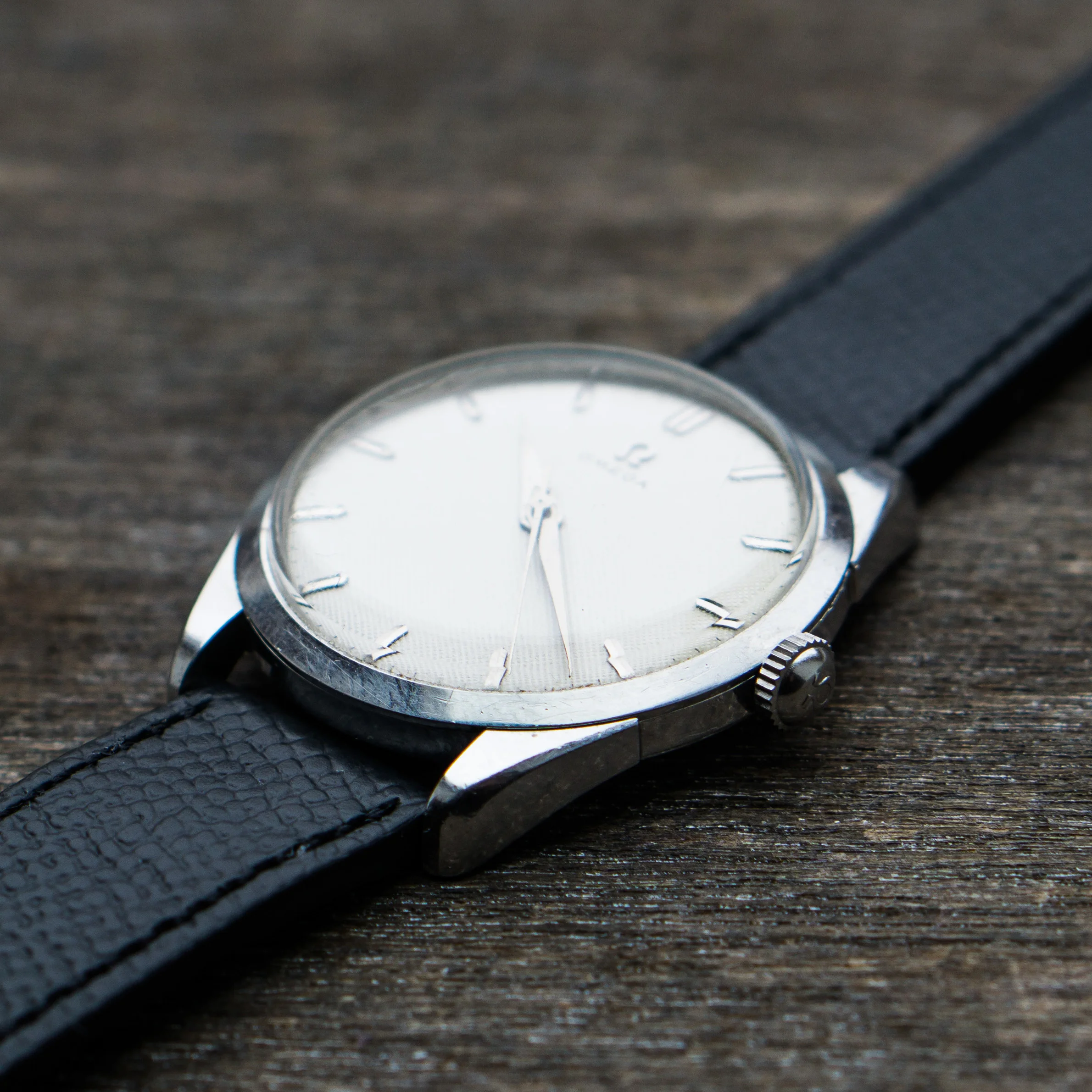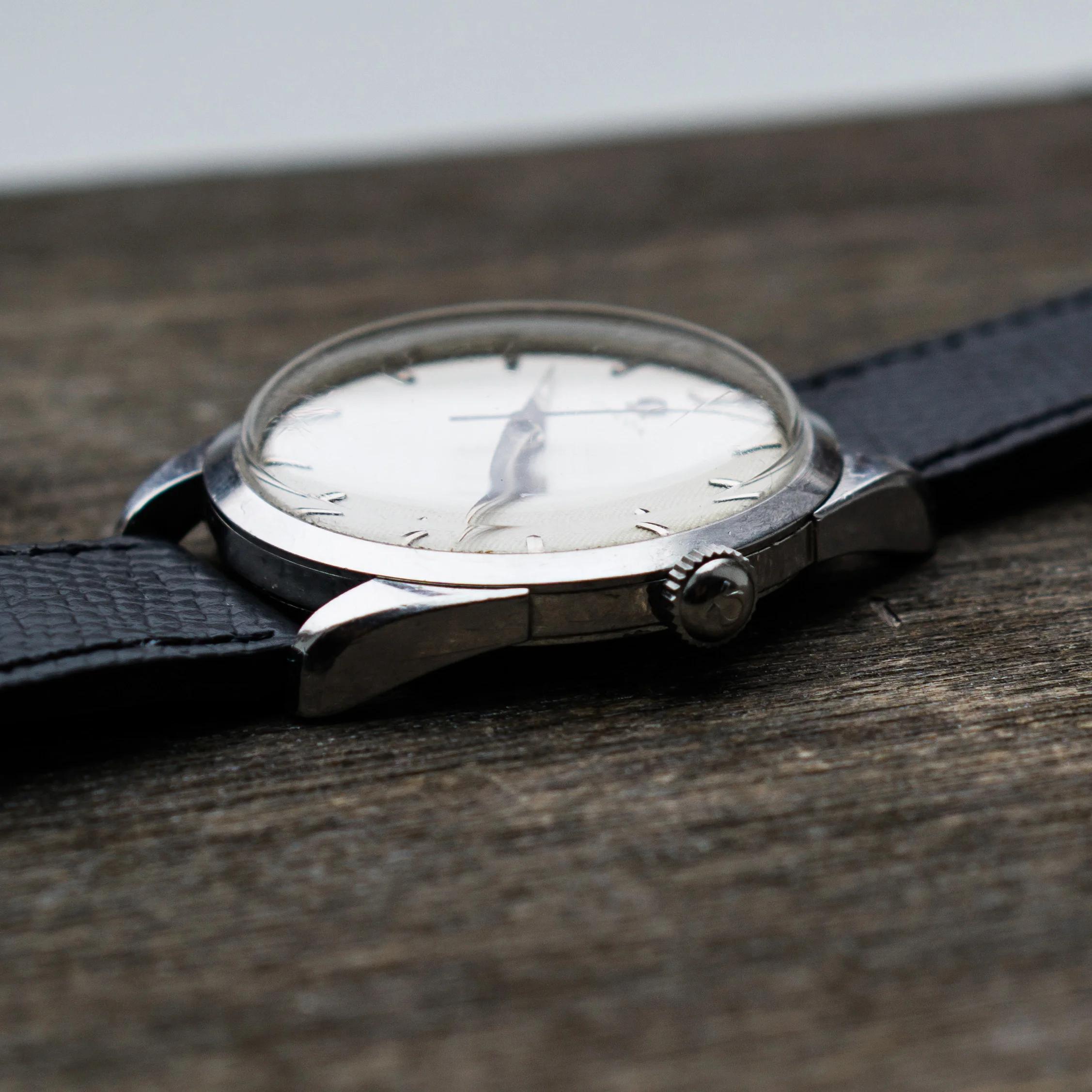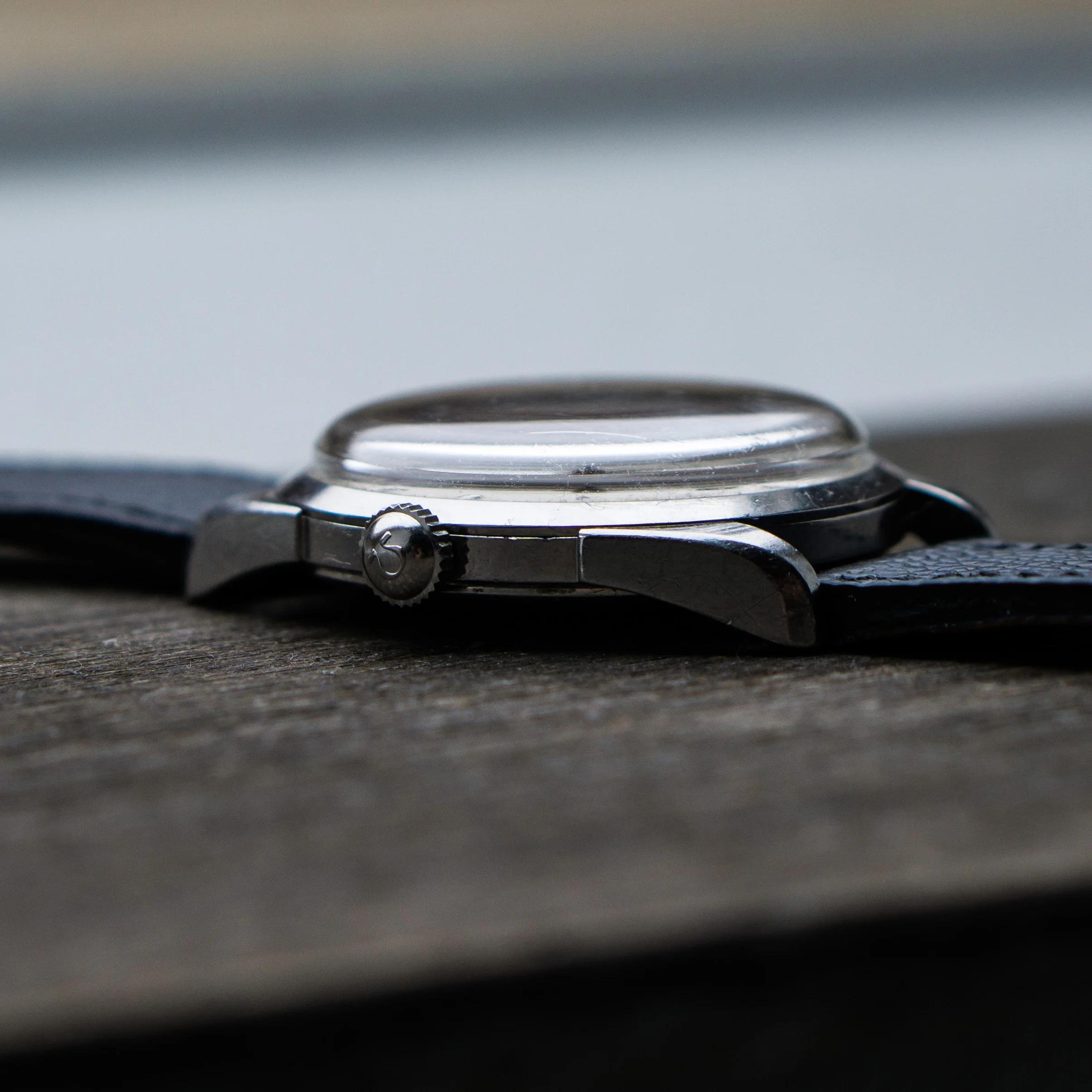 The stainless steel case is also in good, but worn condition, the size without crown is 34.5mm. The caseback looks unpolished as well. The crown is original with a period correct flatfeet Omega logo. The hands and dial are without lume and the appeal of the whole watch comes to the monochrome simplicity (imo).