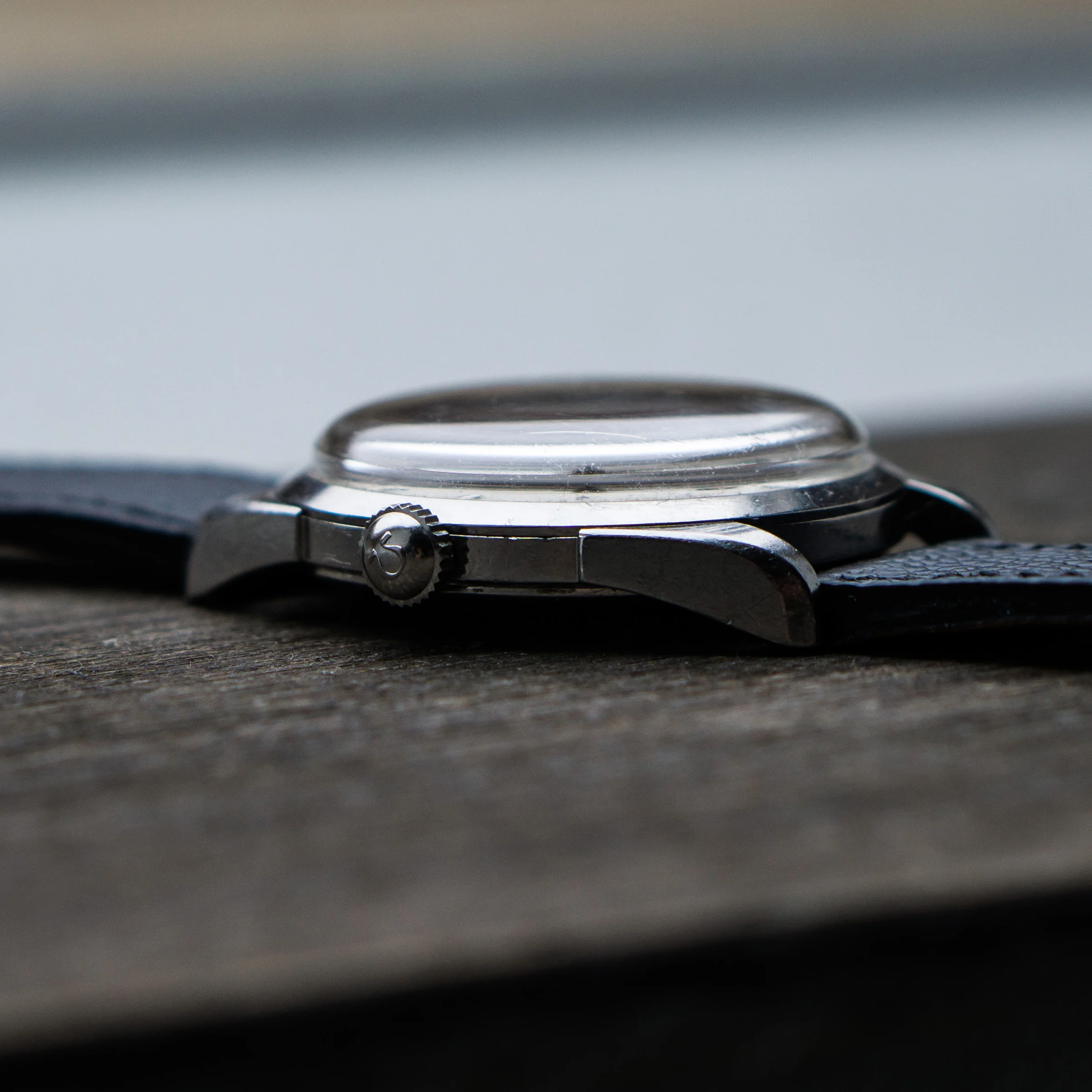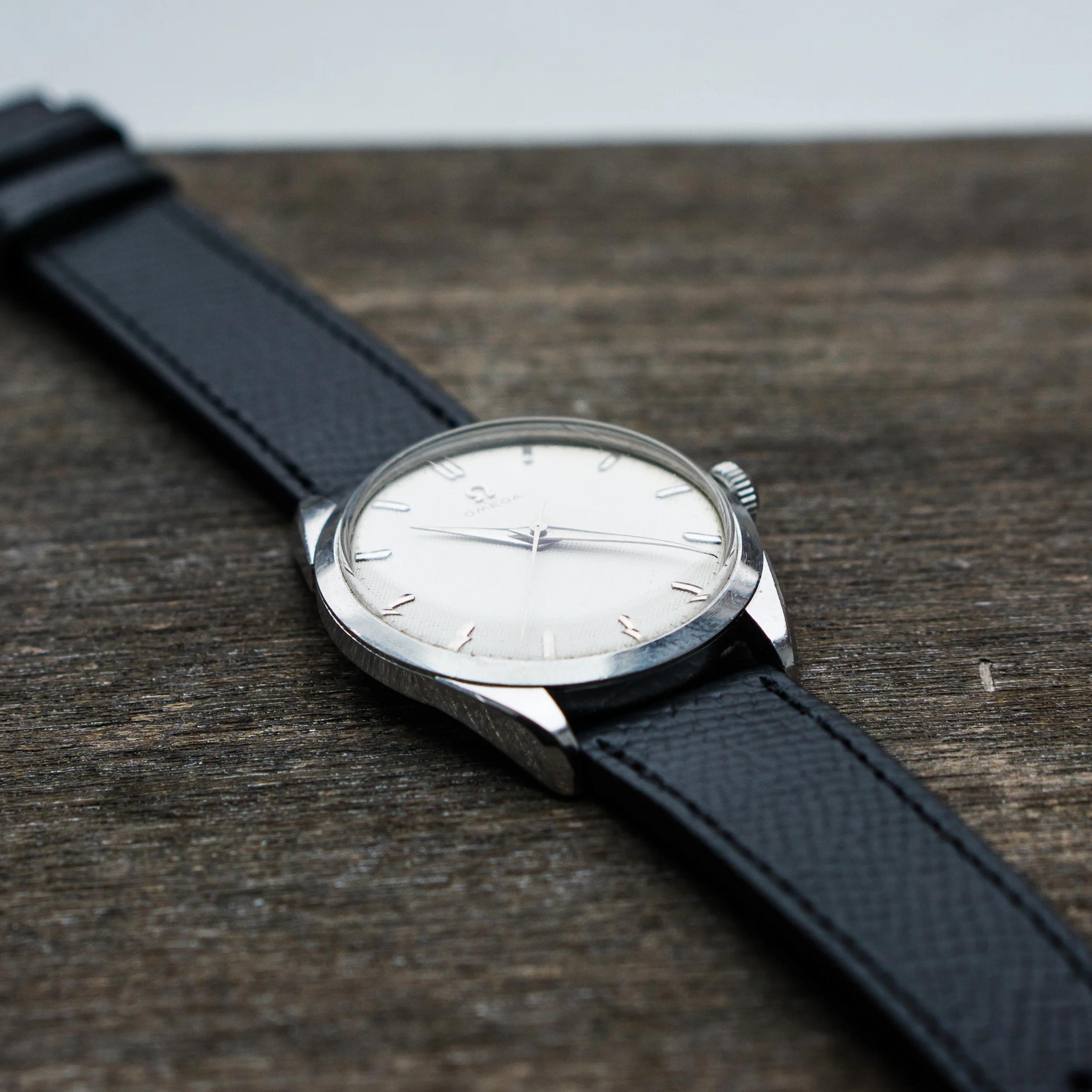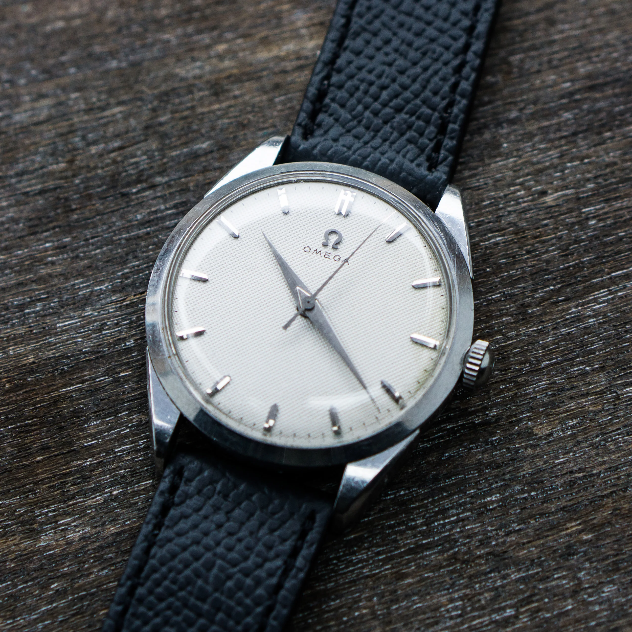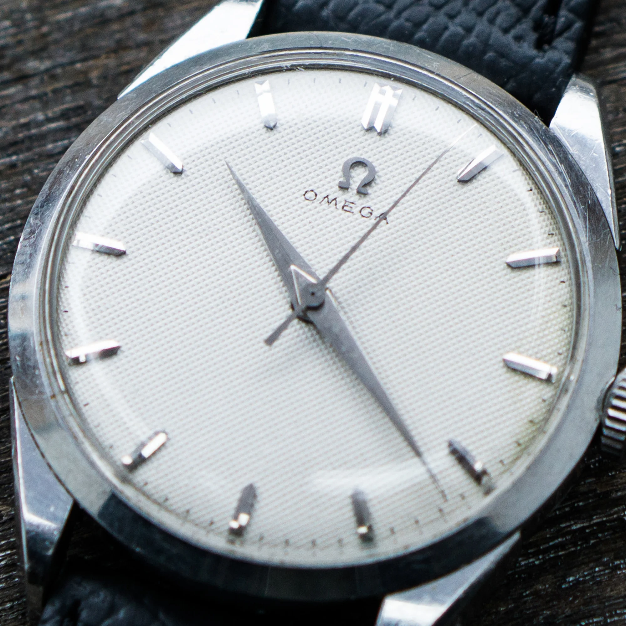 The stainless steel case is also in good, but worn condition, the size without crown is 34.5mm. The caseback looks unpolished as well. The crown is original with a period correct flatfeet Omega logo. The hands and dial are without lume and the appeal of the whole watch comes to the monochrome simplicity (imo).