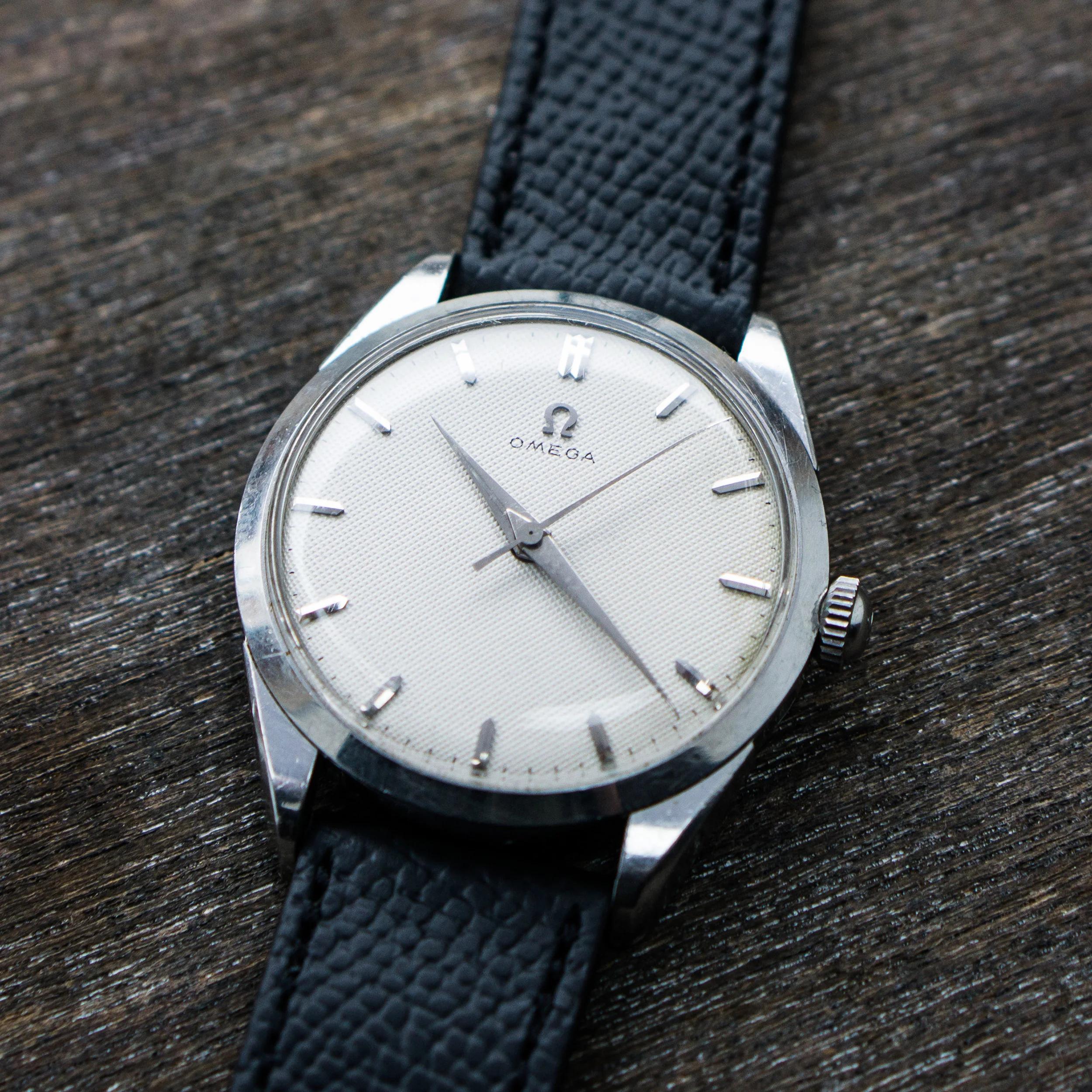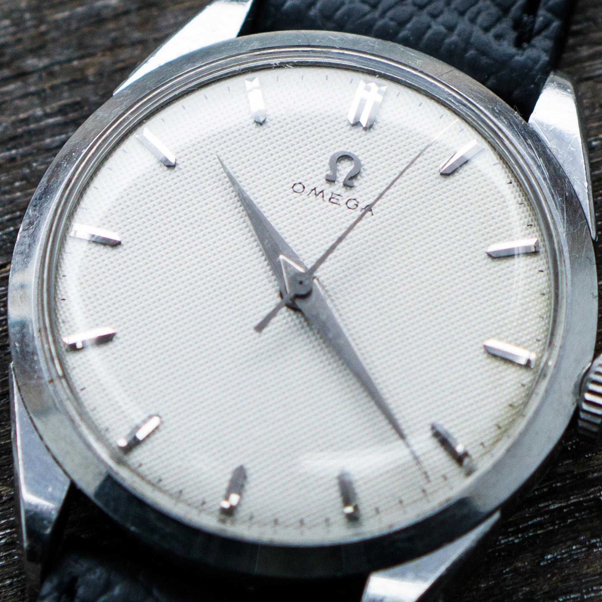 I am offering a nice, handwound Omega watch from around 1958 with a sought after honeycomb dial in white. Usally these dials have a lot of patina or are dirty. In this case the dial is in very good condition, just a touch of brownish color near the crown. But its more visible on pictures than it is in real life.