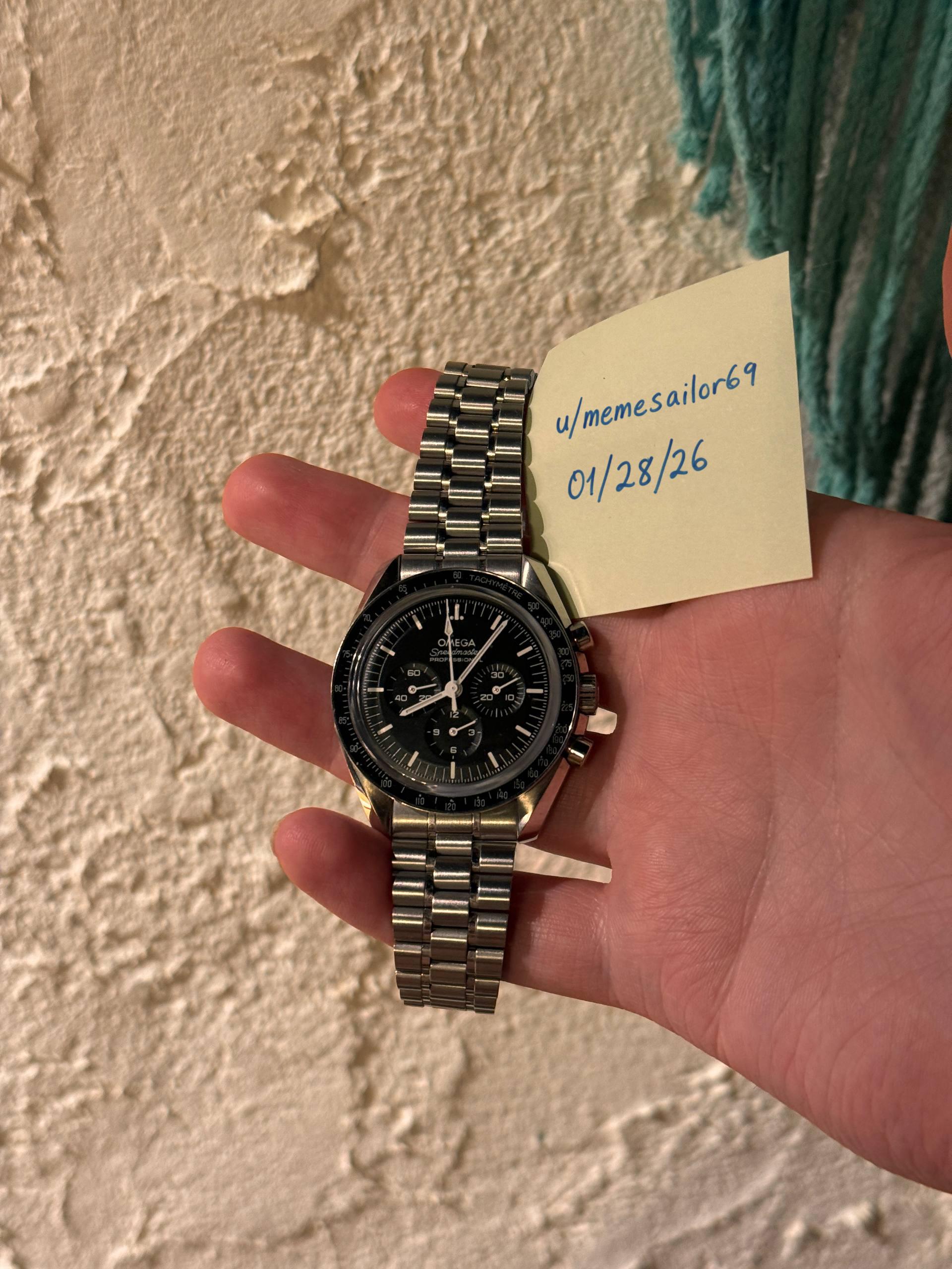 Hello all, I'm selling my Omega Speedmaster Moonwatch Professional "Sapphire Sandwich" - ref. no. 310.30.42.50.01.002. Picked up this watch in a trade a couple years ago, and I've moved away from chronographs. More of a diver kind of guy now. **FULL SET.** The watch and bracelet are free of any major scratches, scuffs, or dings, and the watch functions flawlessly. Accurate timekeeping (the 3861 movement runs perfectly), and the reset is nice and snappy on the chrono seconds hand. The bracelet is a tiny bit snug on my \~7.5" wrist, and comes with 2 extra links. Asking $5500 by Wire shipped to any of the 50 states . International shipping is available, but it would cost extra. **Please PM me if you have any more questions/need any more pictures/videos! (Custom video timestamp available)** Thanks for looking!