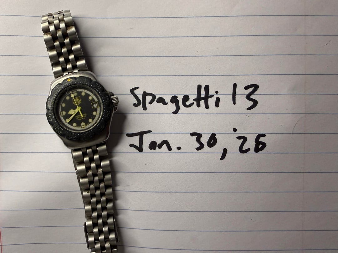 Brand: TAG Heuer Model: Formula 1 (Series 1) Reference: 376.508 Movement: Swiss Quartz (Battery Powered) Case Size: approx. 28mm (32mm including crown) Product Overview: A true icon of the 1990s, this TAG Heuer Formula 1 Ref. 376.508 is a rugged yet stylish diver-style watch. Unlike the base models of the era, this reference features a solid stainless steel case, giving it a more premium weight and durability. It features the striking black dial with high-contrast yellow hands and indices that define the early F1 aesthetic. Letting it go cheap because of the color wear on the bezel. Otherwise the case dial and bracelet are great and the watch works perfectly.