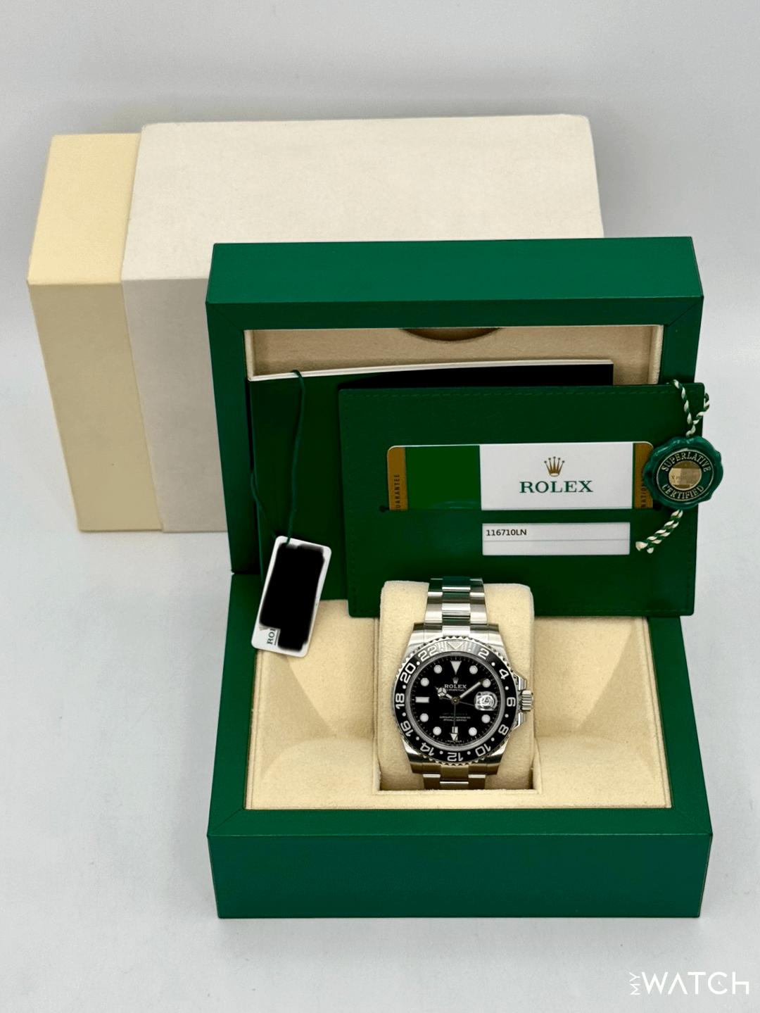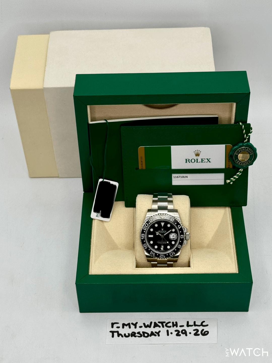 🔵**2018 Rolex GMT-Master II 40mm 116710LN Stainless Steel Black Dial** 🔵**TRADE or SELL us your luxury watch, all brands considered. Message me details.** **Includes the following:** **✔️Original Rolex Double Boxed** **✔️Box and Papers - Yes** **✔️Warranty card dated 2018** **✔️Manual and Warranty booklets** **✔️Green and White Hang Tags included** **✔️Size: 8.0inch wrist (Full Links)** **✔️Watch is in excellent overall condition. Please see photos for details.** **✔️**[**Trades**](https://mywatchllc.com/pages/sell-rolex-watch) **welcome** Business Name: **My Watch LLC** LOCATION: Oak Park, Michigan ✔️[MyWatchLLC.com](http://mywatchllc.com/) for current inventory ✔️Google Business Listing [https://g.co/kgs/Cmd6FPW](https://g.co/kgs/Cmd6FPW) ✔️Business Hours M-F 9-6 ✔️Facetime/Video chat/calls welcome to view the watch interested. ✔️Contact: 248-422-0909 via text or call for quickest response. 🟢TERMS: Visit [MyWatchLLC.Com](http://mywatchllc.com/) for payments accepted 🟢REFERENCES/REVIEWS: We are well reviewed on all platforms from google, trust pilot, rolexforums, additionally we have 300+ reference in multiple FaceBook watch groups, reference checks welcome. 🟢SHIPPING: If you are not local, we offer Fully Insured FedEx overnight shipping in the USA for a fee. International shipping available. [https://mywatchllc.com/products/2018-rolex-gmt-master-ii-40mm-116710ln-stainless-steel-black-dial-8](https://mywatchllc.com/products/2018-rolex-gmt-master-ii-40mm-116710ln-stainless-steel-black-dial-8)