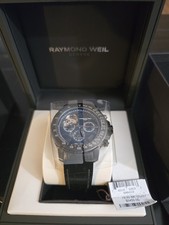 A Raymond Weil GMT Automatic diver watch with a stunning textured Black dial in great condition. The red color on second hand matches with gmt hand, bezel pip and text on dial. Creative design, makes it a conversation piece. Robust unique shaped case. Very solid build quality. The build quality is very high end overall. Signed crown. Sapphire crystal. Date function. Amazing condition, ready to be used as a daily driver. Movement has been serviced. Great time keeping. Comes with an aftermarket grey textured rubber strap, unsigned buckle. Pairs well with the watch. There’s a tiny scratch on left side of the bezel before “18” as seen on picture. This model is seldom seen and a great collectible. Only Watch. Overall a great piece at a good price. PRICE: $499 USD via Paypal, Wise, Crypto. FREE 5 day DHL shipping worldwide. I have a good number of exchanges here for a safe transaction. Check my Instagram: [https://instagram.com/hour.lust](https://instagram.com/hour.lust) * Reference Number: 3800-ST-05207 * Case size: 44 mm (without crown) * Lug to lug: 53 mm * Thickness: 13 mm * Lug width: 22 mm * Movement: Automatic Pics: [https://imgur.com/a/wu4Nn33](https://imgur.com/a/wu4Nn33) TS: [https://imgur.com/a/Wadnnfa](https://imgur.com/a/Wadnnfa)