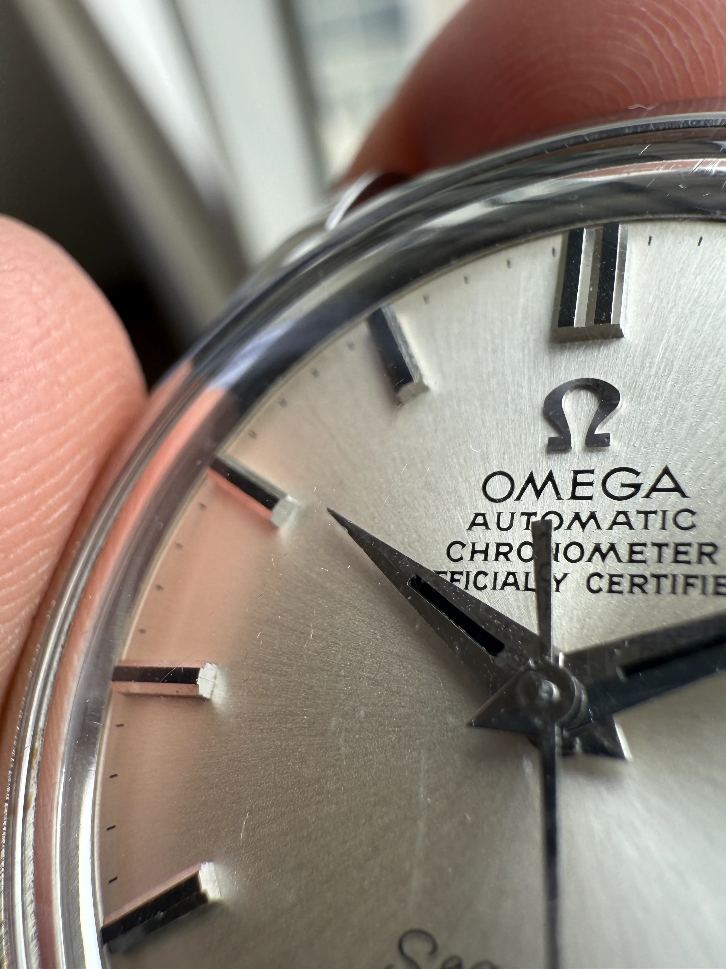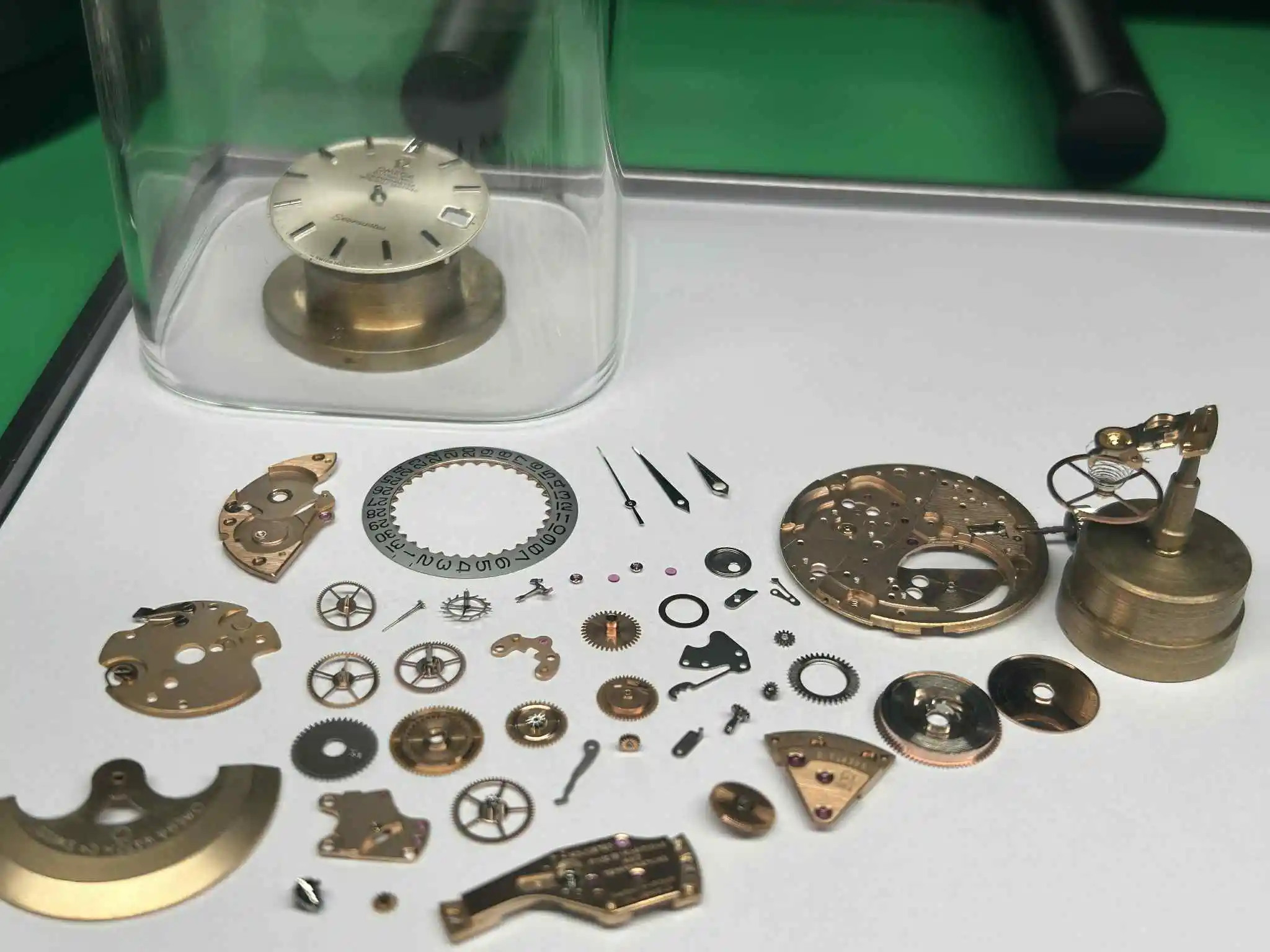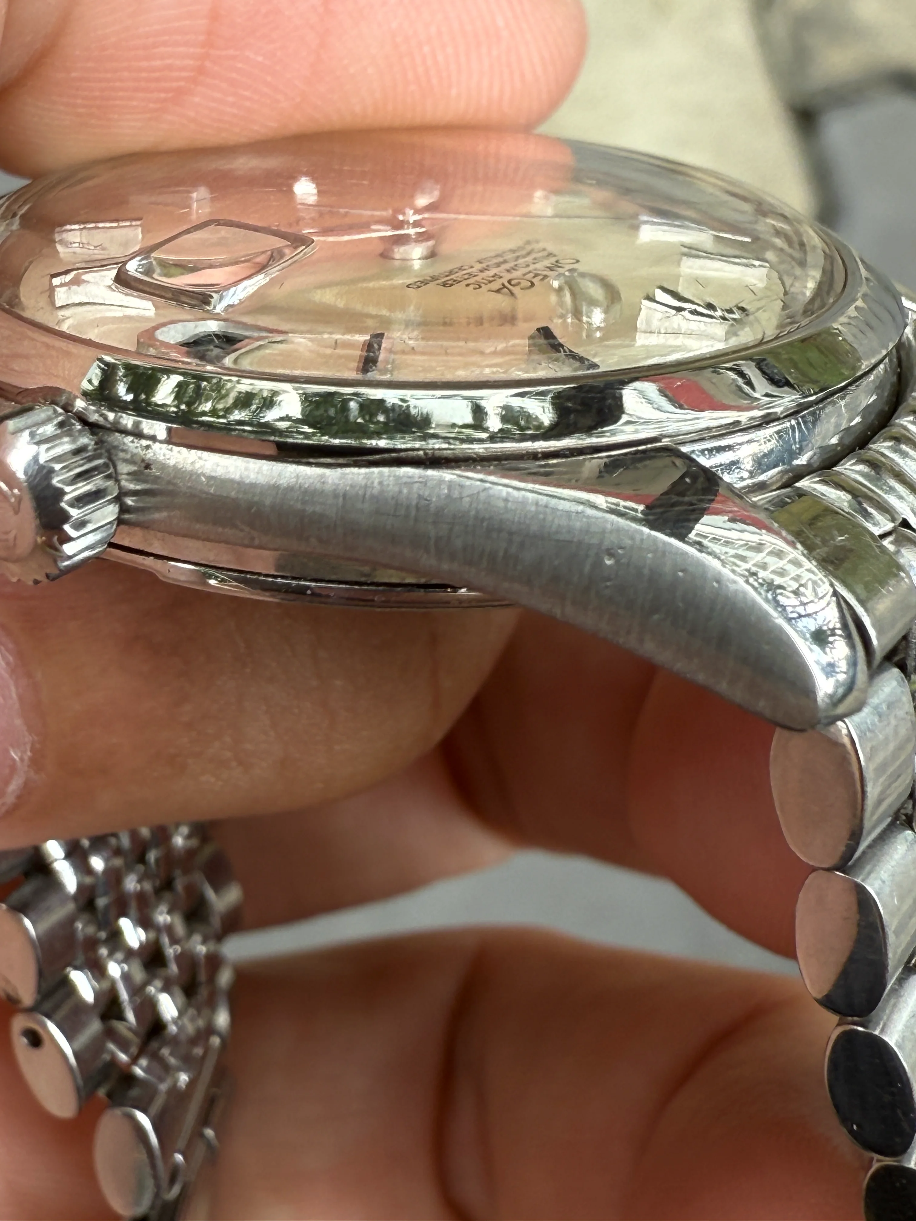 - Glass: Original with Omega logo, magnifying window at 3’.