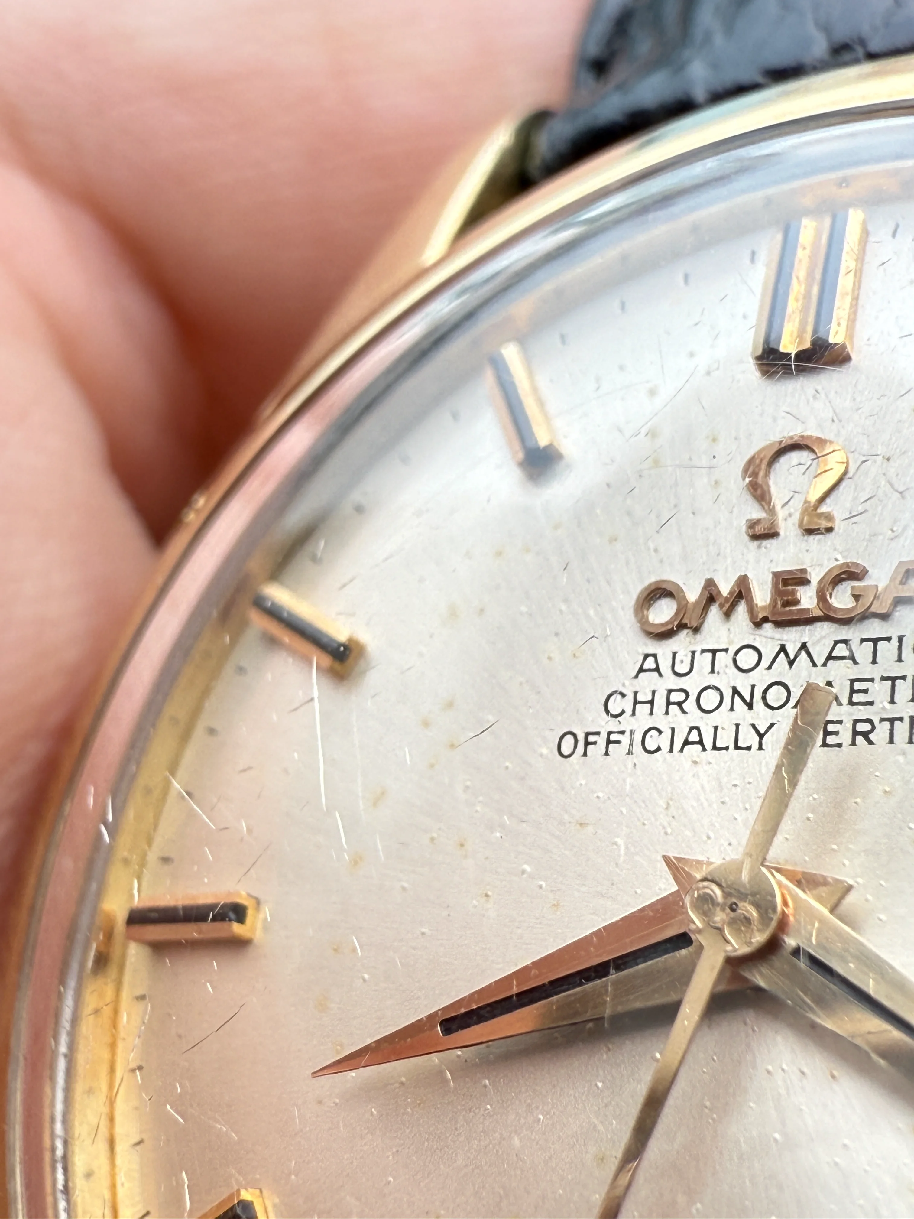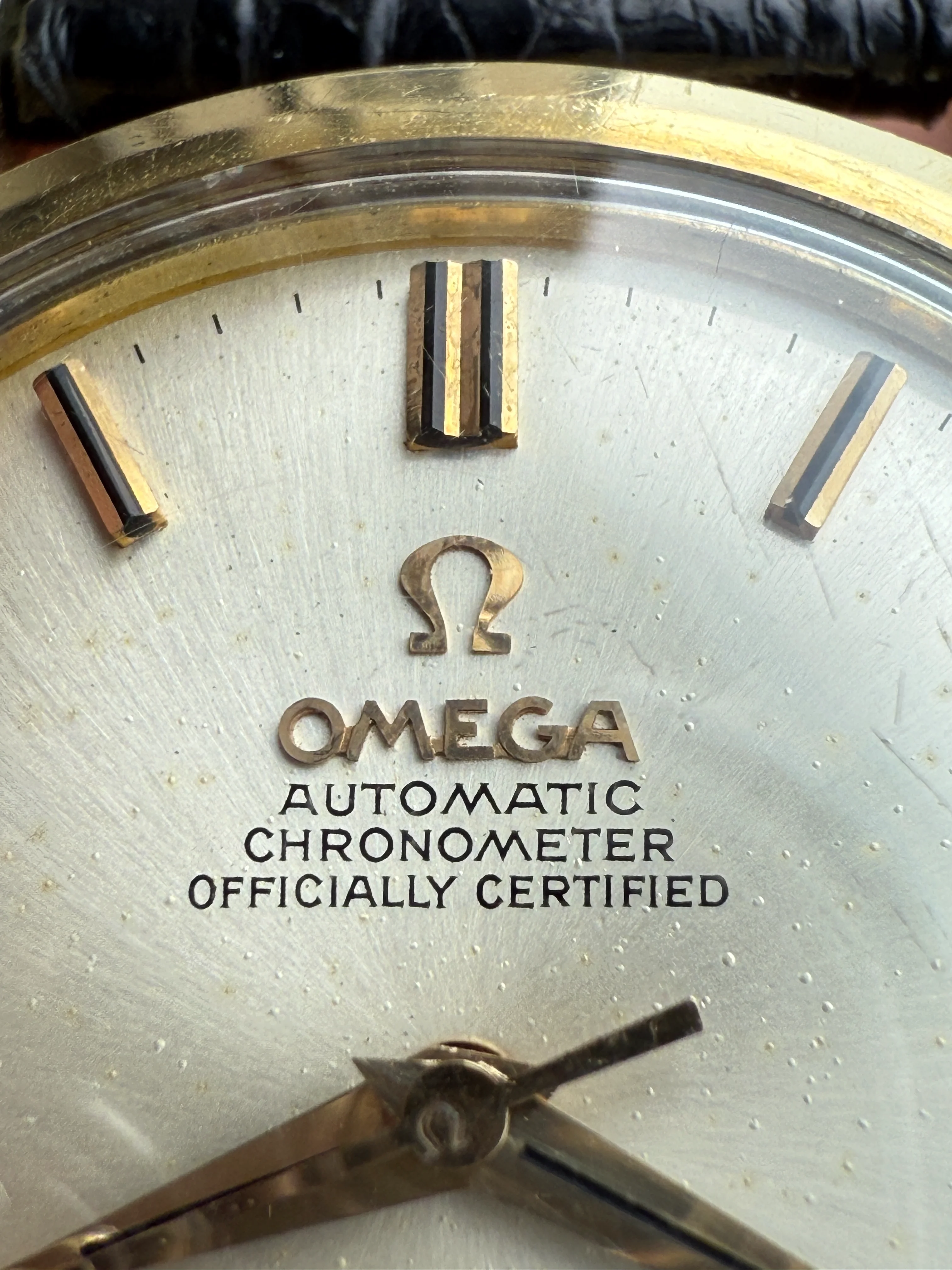 - Dial: Original white aged dial with evenly distributed small spots, applied Omega logo, onyx inserted hour markers, dauphine hands, faceted date-aperture frame at 3; prints, hands and hour markers are all good.