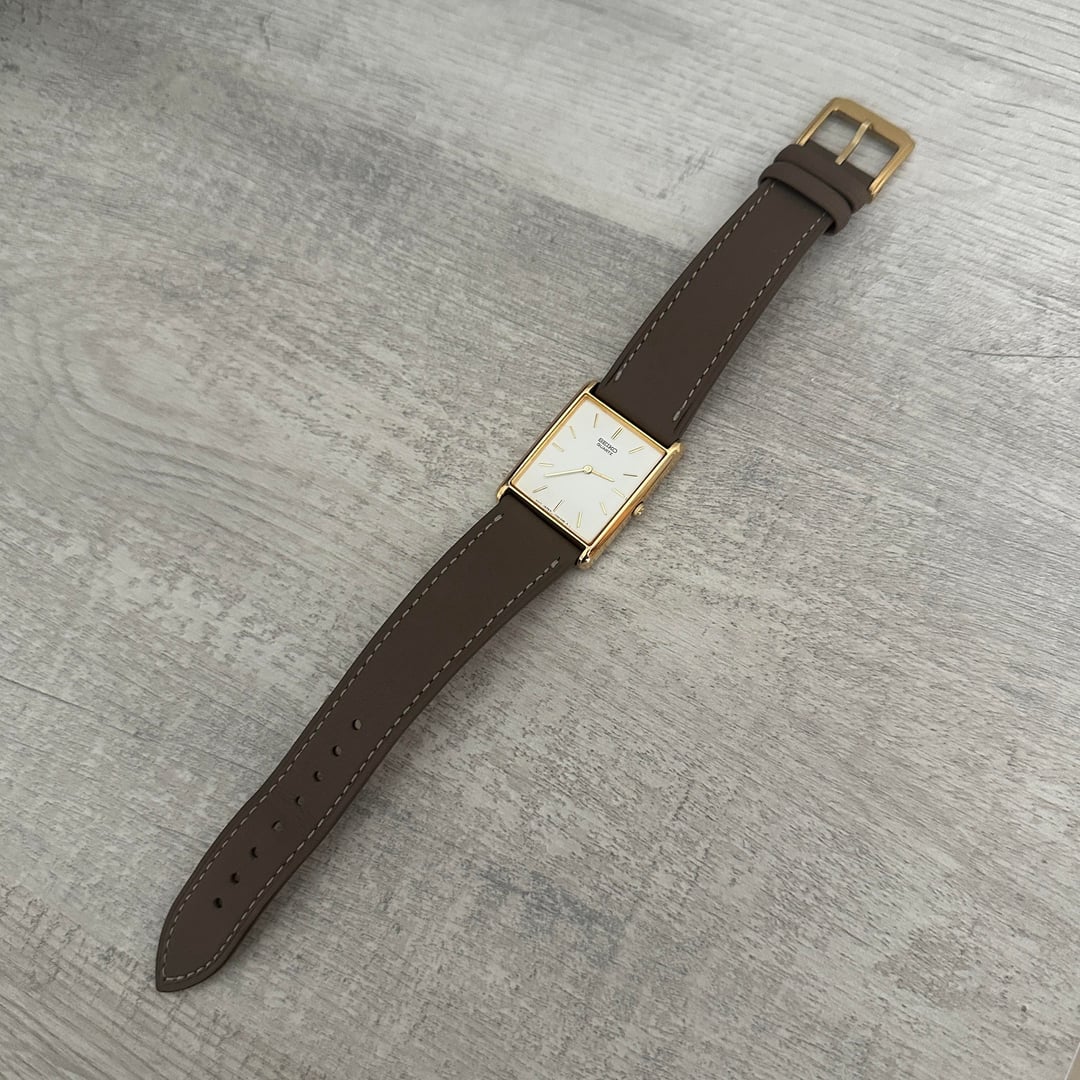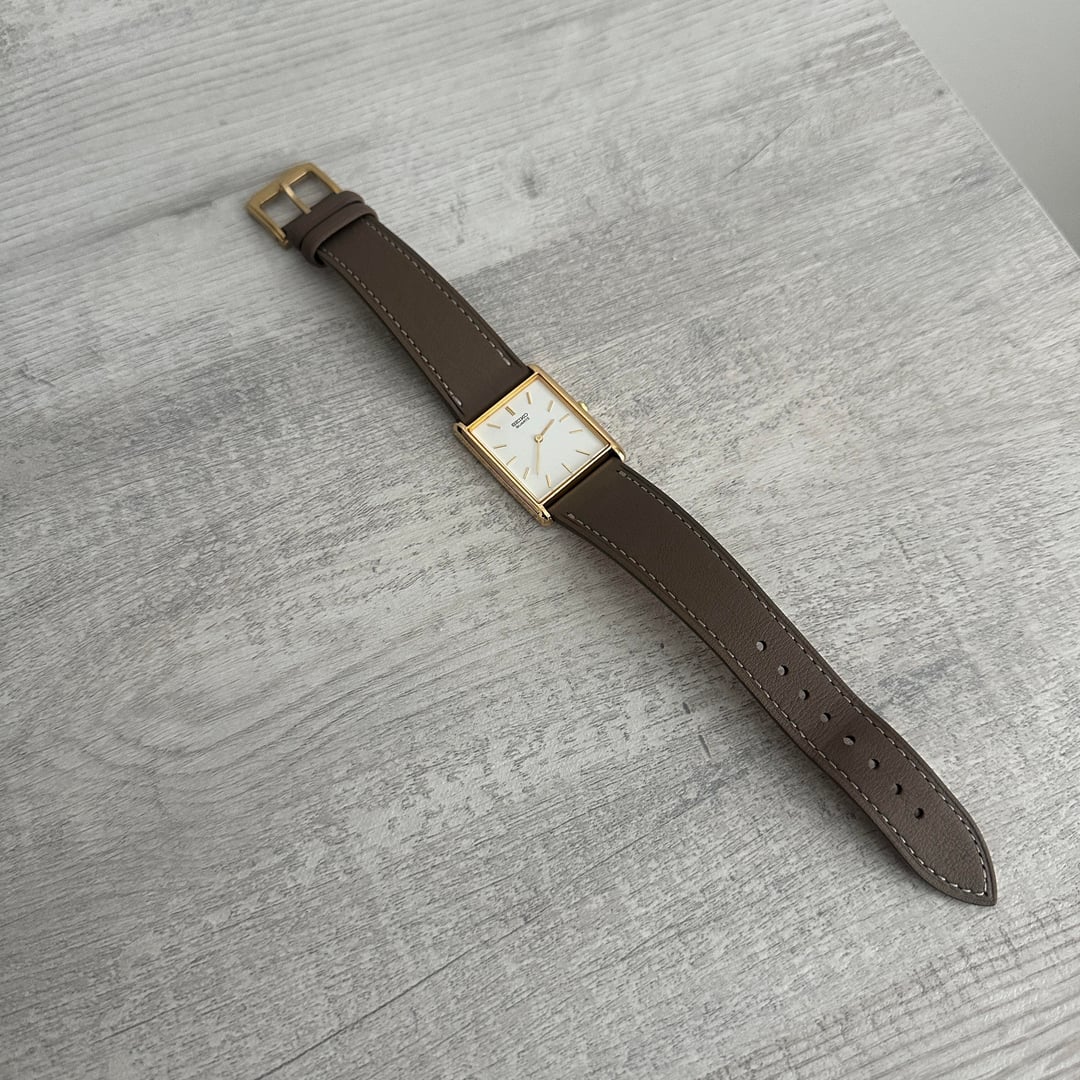 Selling my vintage 70s Seiko Tank. Reference V700-5K30. In good condition with some wear on the case and a small scratch on the crystal near 10 o’clock. The gold plating is all in tact! Comes on a Wristbuddys Taupe strap with a gold buckle. Price: $95 including shipping to CONUS Payment: Zelle or PayPal Friends & Family Thank you for looking!