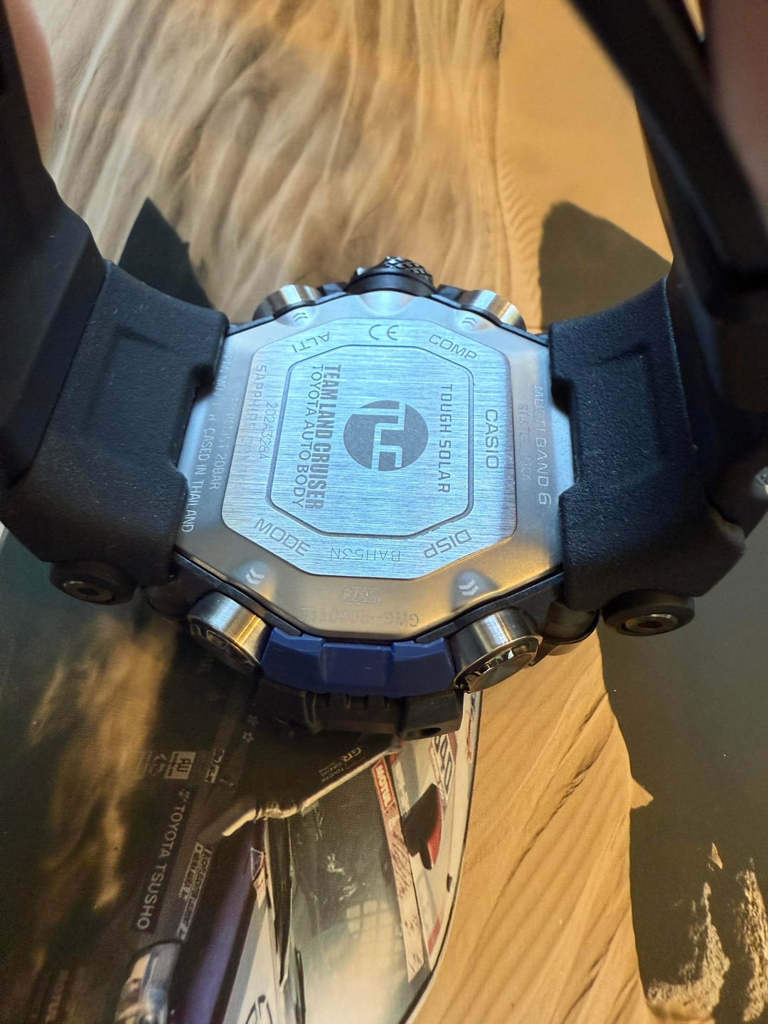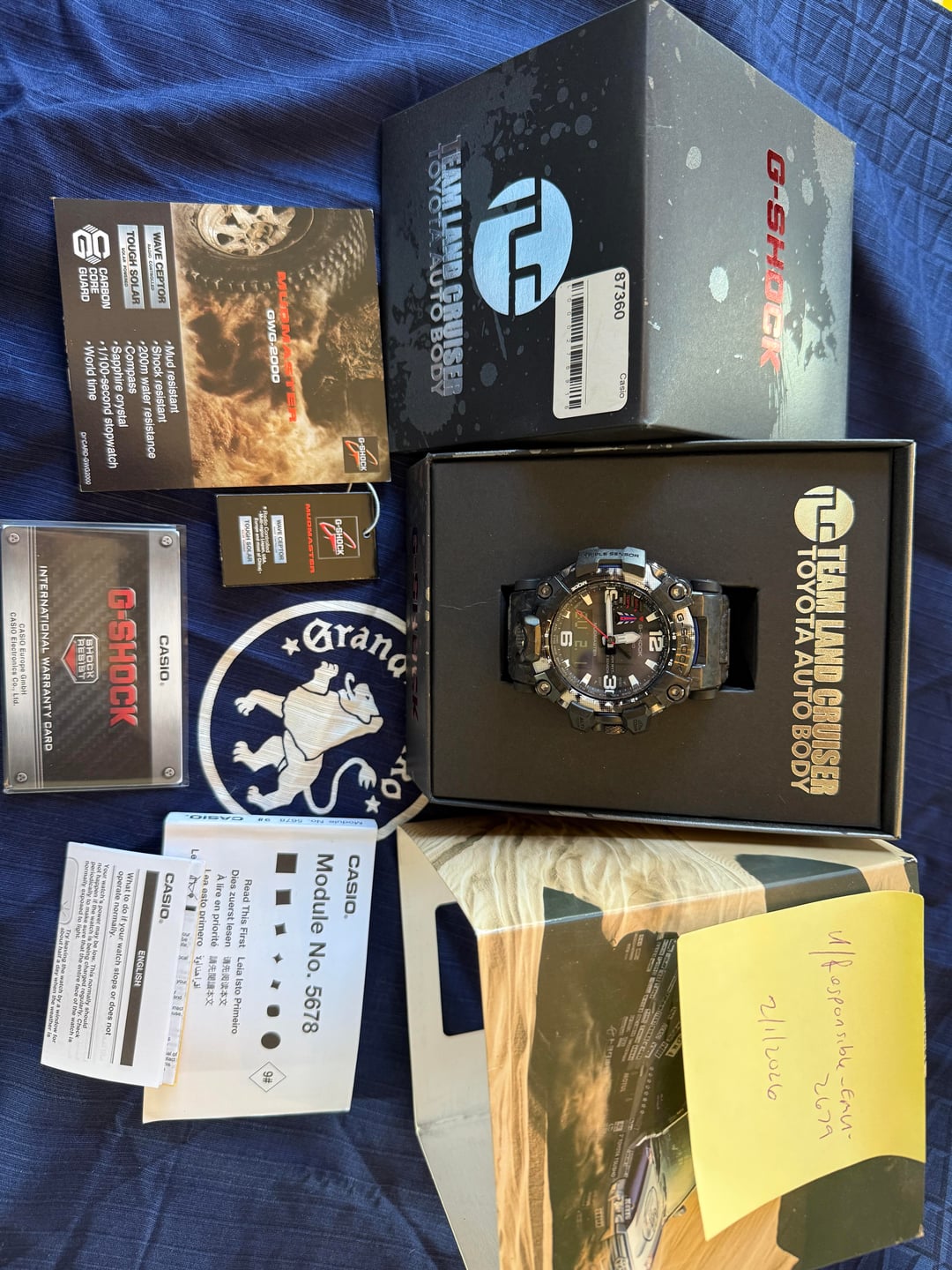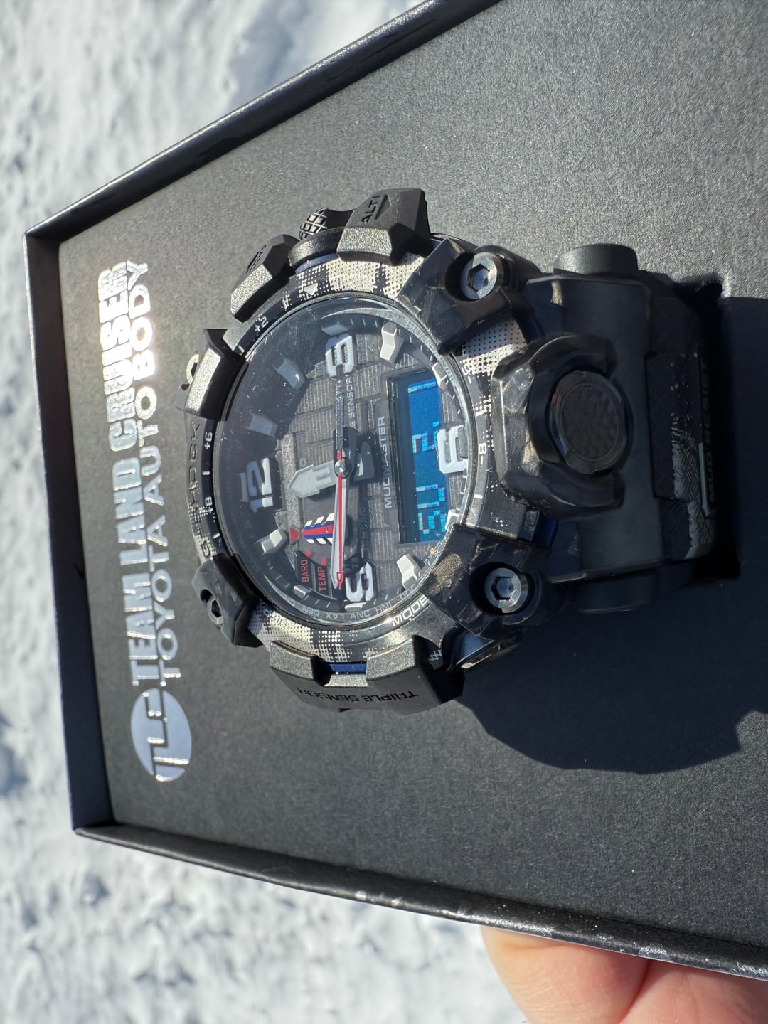 [WTS] GWG-2000TLC-1AER Limited Edition Japan Only BRAND NEW In New Condition - Comes as a complete set. Made in collaboration with Toyota Land Cruiser. Check photos for condition and what’s included. USD Price: $950 Shipped in US / No Trades Please PP, Venmo, Wire or Zelle accepted Nickname: Mudmaster Collection: None Special Edition: Team Land Cruiser Toyota Limited Edition: No Color Band: Camouflage Color Bezel: Camouflage Color Watchface: Black Color Display: Black Timekeeping: Analog / Digital Display: Negative LCD Type: LCD Light Type: Super Illuminator Band: Resin Bezel: Metal Glass: Sapphire Glass Battery: CTL1616F Battery Life: Rechargeable Weight: Unknown Size (HxWxT): 61.2 x 54.4 x 16.1 mm From Casio: Bold, fearless, and ready for anything! A very special collaboration between G-SHOCK and the Toyota Auto Body Team Land Cruiser inspired by this veteran of the toughest race in the world, the Dakar Rally. Built to withstand all the mud and dust your adventures can bring, the G-SHOCK MUDMASTER is the ideal canvas for a collaboration with a car this tough. Add in forged carbon bezel components and a carbon core guard structure for a smaller, lighter watch, and you’re ready to take on the harshest of terrain. Designed to evoke the Land Cruiser after an intense day speeding across the desert, the band features a mud and sand splatter pattern. Laser engraving on the black ion-plated stainless steel bezel and buckle carry the motif even further. Accents like the blue, white, and red team colours and the logo on the band and case back pay tribute to the toughness of this machine, always ready to take on the most challenging of environments. Team Land Cruiser, Toyota Auto Body Team Land Cruiser at Toyota Auto Body Co., Ltd., a Toyota Group manufacturer of minivans, commercial vehicles, and SUVs, has participated in the Dakar Rally every year since 1995.