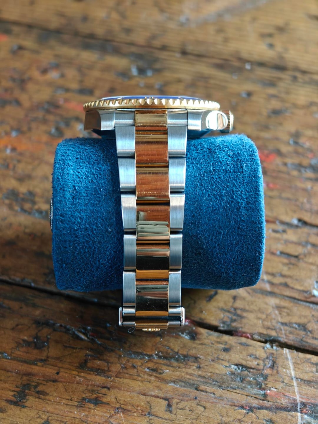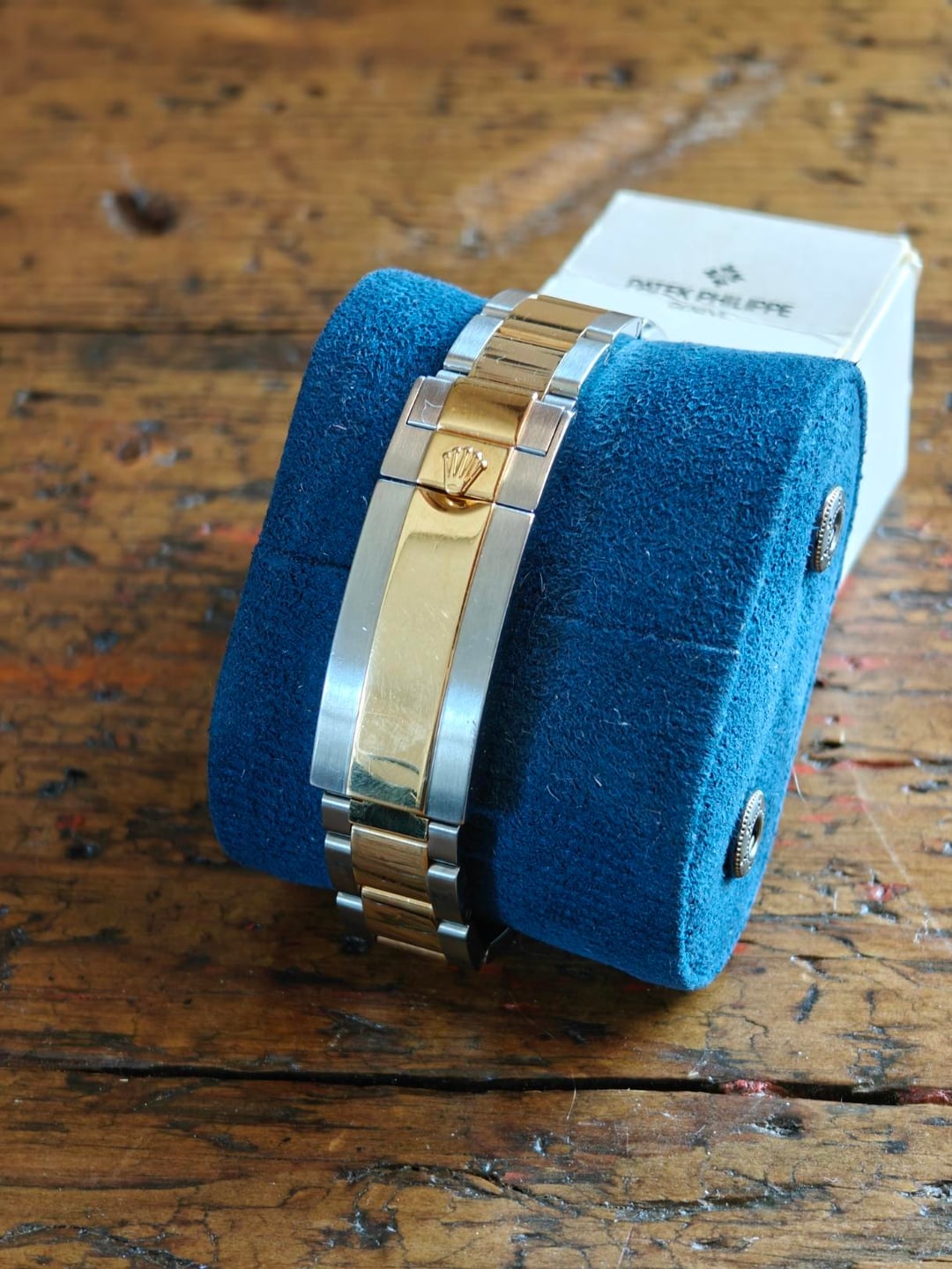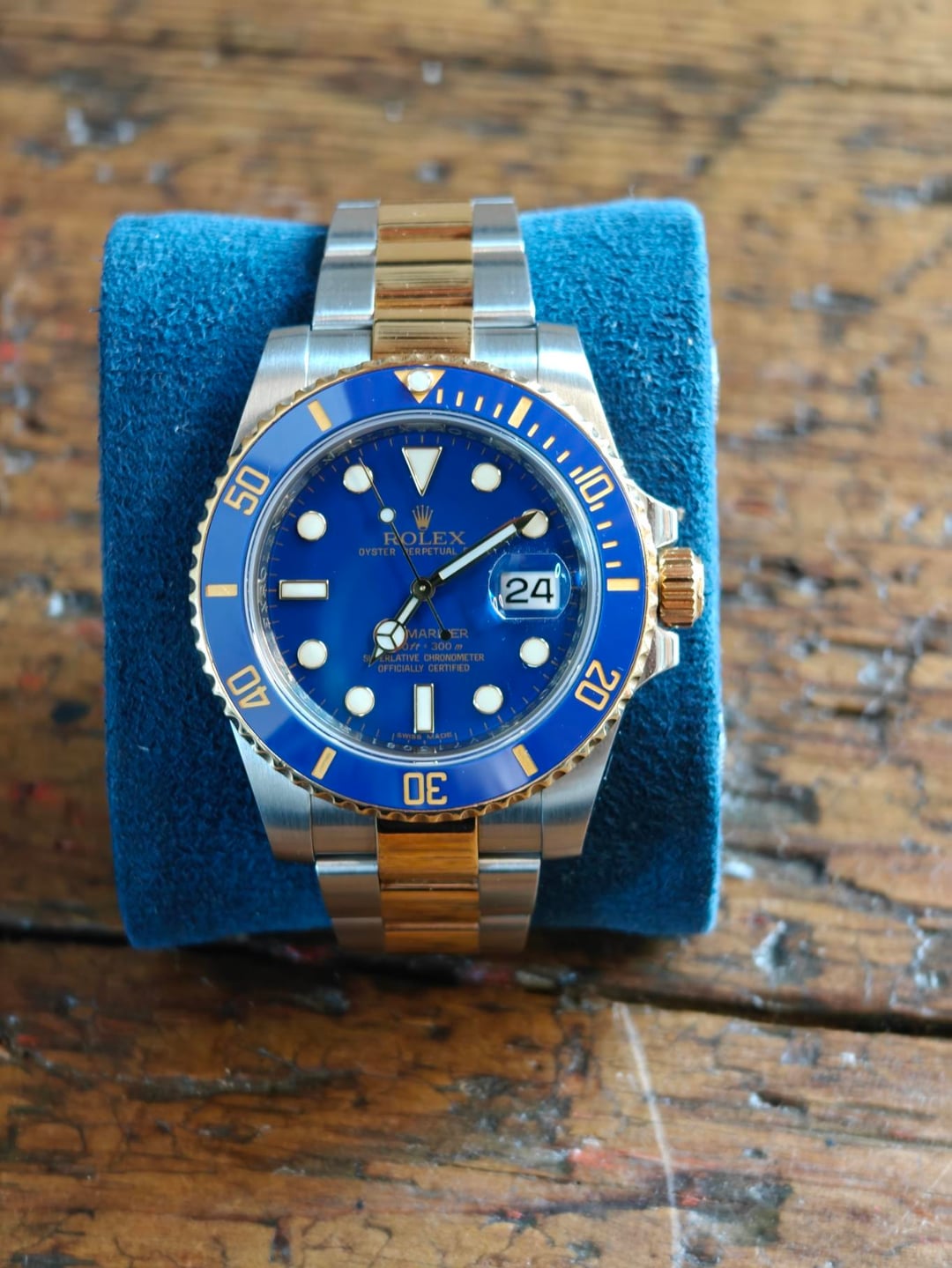 Up for sale is a **Rolex Submariner 116613LB**, the iconic **“Bluesy”** in the desirable **flat‑blue dial** configuration. This is the earlier, richer blue tone collectors prefer over the later sunburst versions — bold, saturated, and unmistakably classic. This example includes the **original 2010 card** *and* a **2020 Rolex Service Center (RSC) Warranty Card**. A quick note for buyers: the **RSC card** is issued directly by Rolex after a factory service. It confirms the watch was serviced by an authorized Rolex facility and carries a Rolex‑backed post‑service warranty. It’s one of the strongest forms of provenance and peace of mind you can have on a modern RLX. The watch has **10 links**, fits 7-7.25in wrist, and could take a polish for perfection — but I prefer to leave pieces **unpolished** so the buyer can decide. Running well and ready for daily wear. 📐 **Specs**: – Ref. 116613LB – “Flat Blue” dial – 40mm stainless steel & 18k yellow gold case – Blue Cerachrom bezel – Oyster bracelet with 10 links – 2010 card – 2020 Rolex Service Center warranty card – Unpolished (buyer’s choice) – Running well 📦 **Terms**: – **14,300 shipped & fully insured** – Wire, Zelle, or **credit card (+4.5% fee)** – Trades welcome — RLX, AP, VC, Omega, IWC, Panerai, etc. – Plenty of references available – Located in Massachusetts – Happy to provide timestamped pics or video call to confirm condition 🔥 A clean, unpolished “Flat Blue” Bluesy with both the original card and a 2020 RSC warranty card — strong provenance, classic look, and priced to move. 📲 Follow along for more drops: **Instagram: @ajkwatches** | **Website:** **ajkwatches.com** DM with intent or comment below. Serious offers only. #Rolex #Submariner #116613LB #Bluesy #FlatBlue #TwoTone #RLXFlex #TradesWelcome