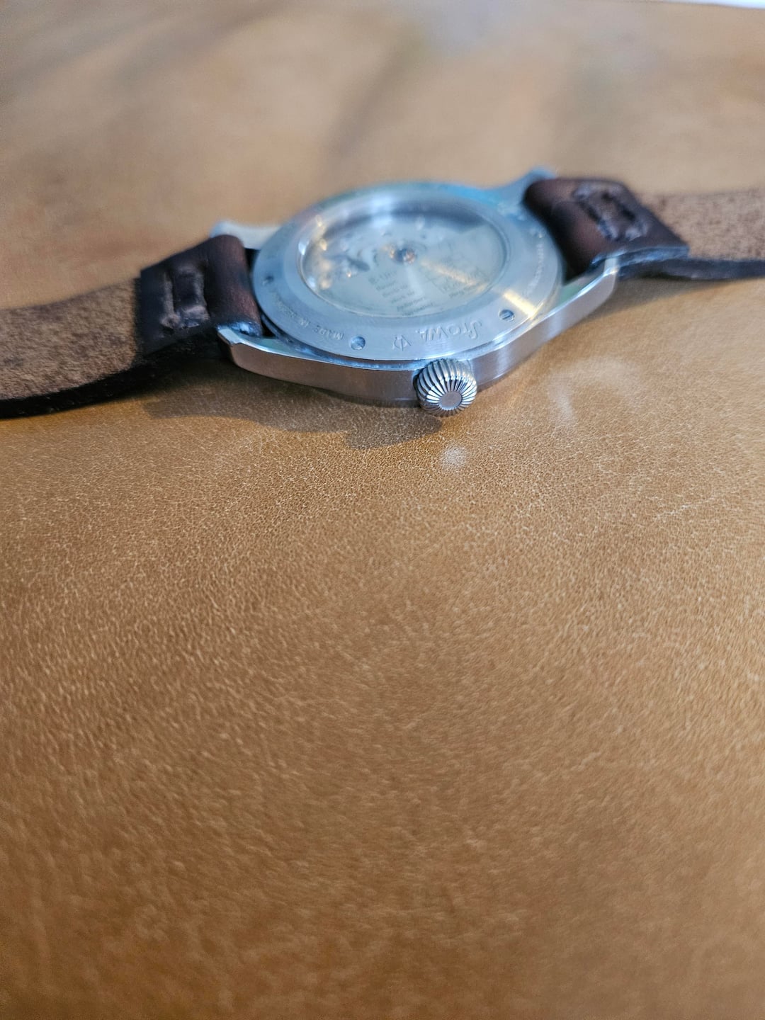 Selling the Stowa Flieger. Great lume and simple clean dial. The lugs have some visible imperfections. Not deep cuts but noticeable. It's Automatic and can be manually wound. The box has seen better days, but it's a classic Watch. I'm in USA and looking for $500.