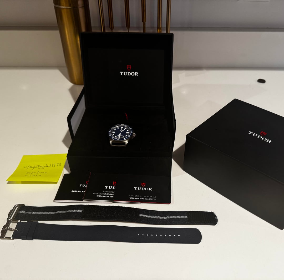 **\[WTS\] Tudor Pelagos FXD Marine Nationale - Like New with Original Stickers** FULL KIT! - Warranty Card Dated 12/03/25 (M/D/Y), Instruction Booklet (German), Guarantee Booklet, Inner and Outer Box, Rubber Strap **Overview:** Up for sale is a nearly new Marine Nationale Pelagos FXD. Case still has protective stickers on the side and bottom. Watch is a full kit and is working great. Warranty is active until 12/2030 and checks out on Tudor Watch ID! Note - no hang tag or white box sleeve included. I just purchased this from this sub but have decided to go in a different direction. **Specs:** Reference - M25707B/25-0001 Calibre - MT5602 Size - 42mm / 12.75mm thick / 52mm lug to lug Material - Titanium Power Reserve - 70 hours WR - 200M Both Straps Included Location - Ohio Valley **Price - $3300 Shipped and Insured to US** Payment - Venmo, PayPal, Bank Wire - add 5% for protection Solid references available from the community!