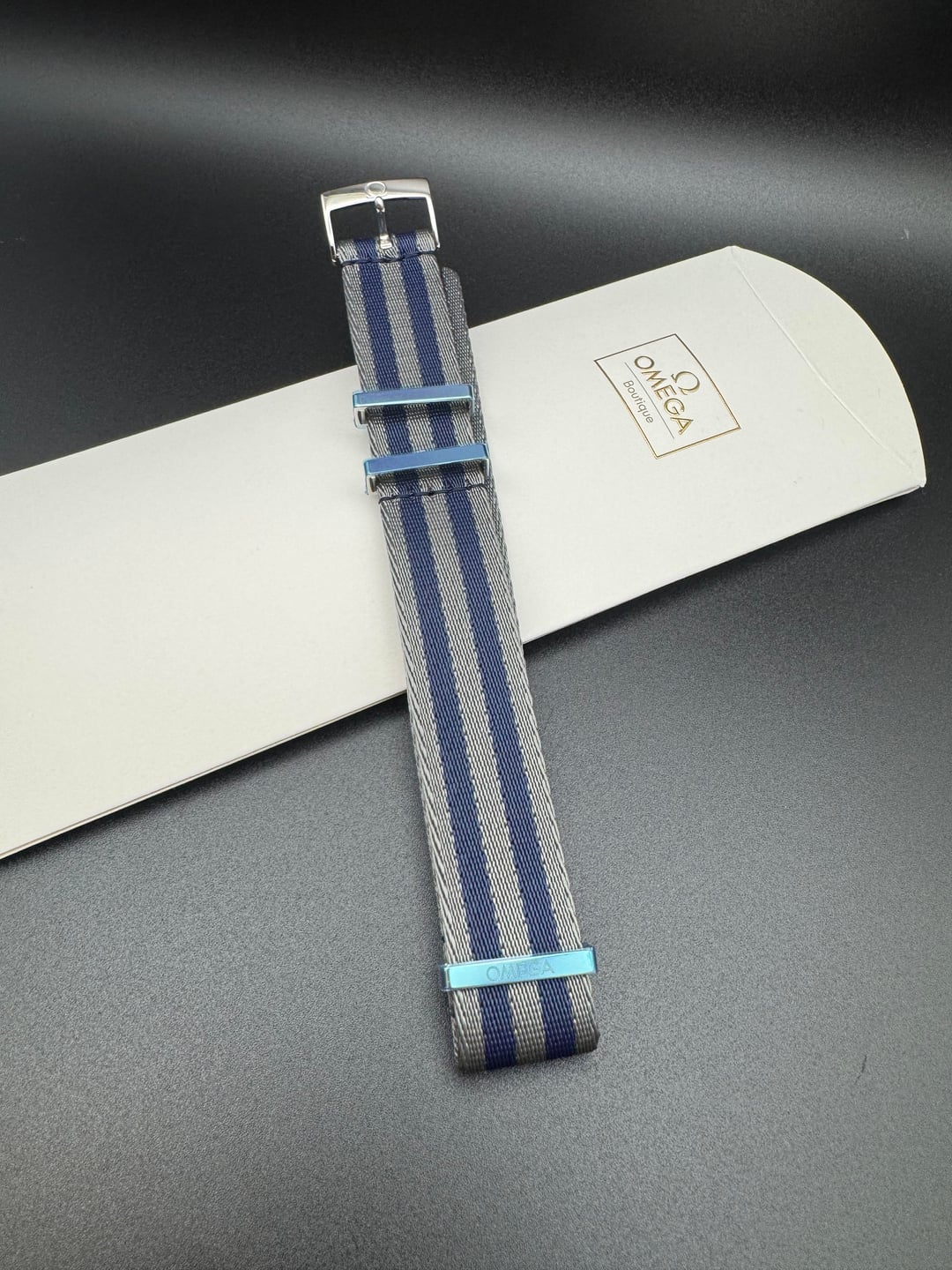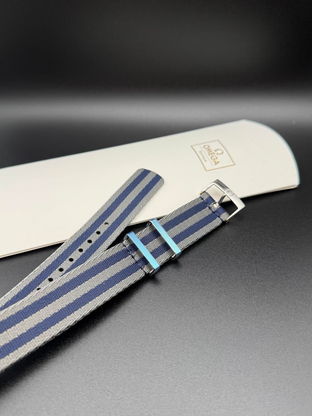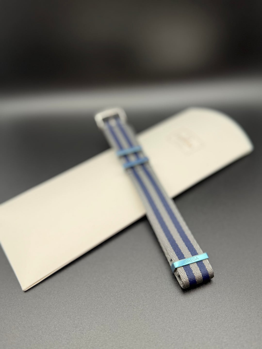 Details: • Brand: Omega • Reference: 031CWZ007884 • Width: Fits 19mm–20mm lugs • Material: Polyamide NATO • Colorway: Grey & Blue • Condition: New