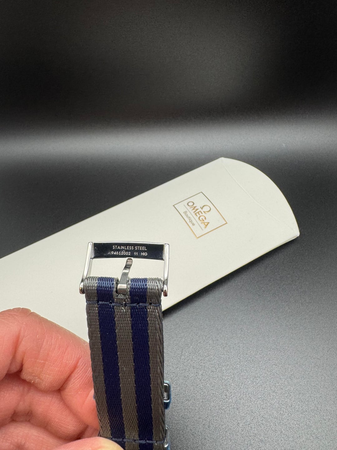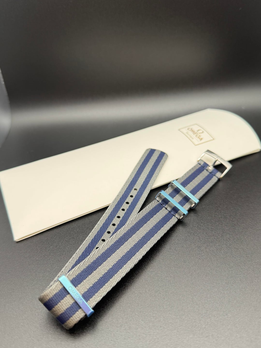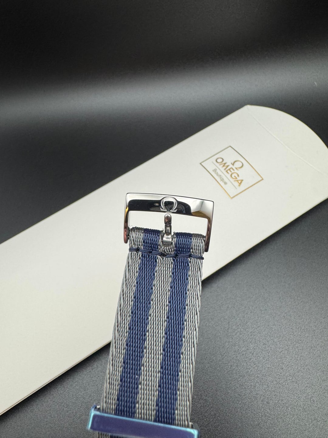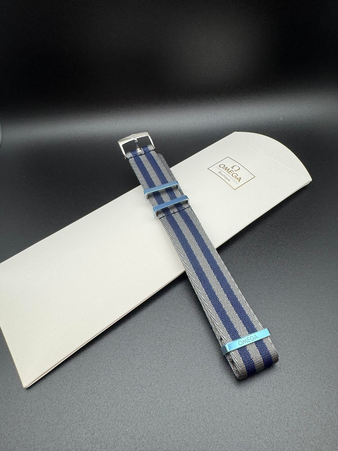 Details: • Brand: Omega • Reference: 031CWZ007884 • Width: Fits 19mm–20mm lugs • Material: Polyamide NATO • Colorway: Grey & Blue • Condition: New