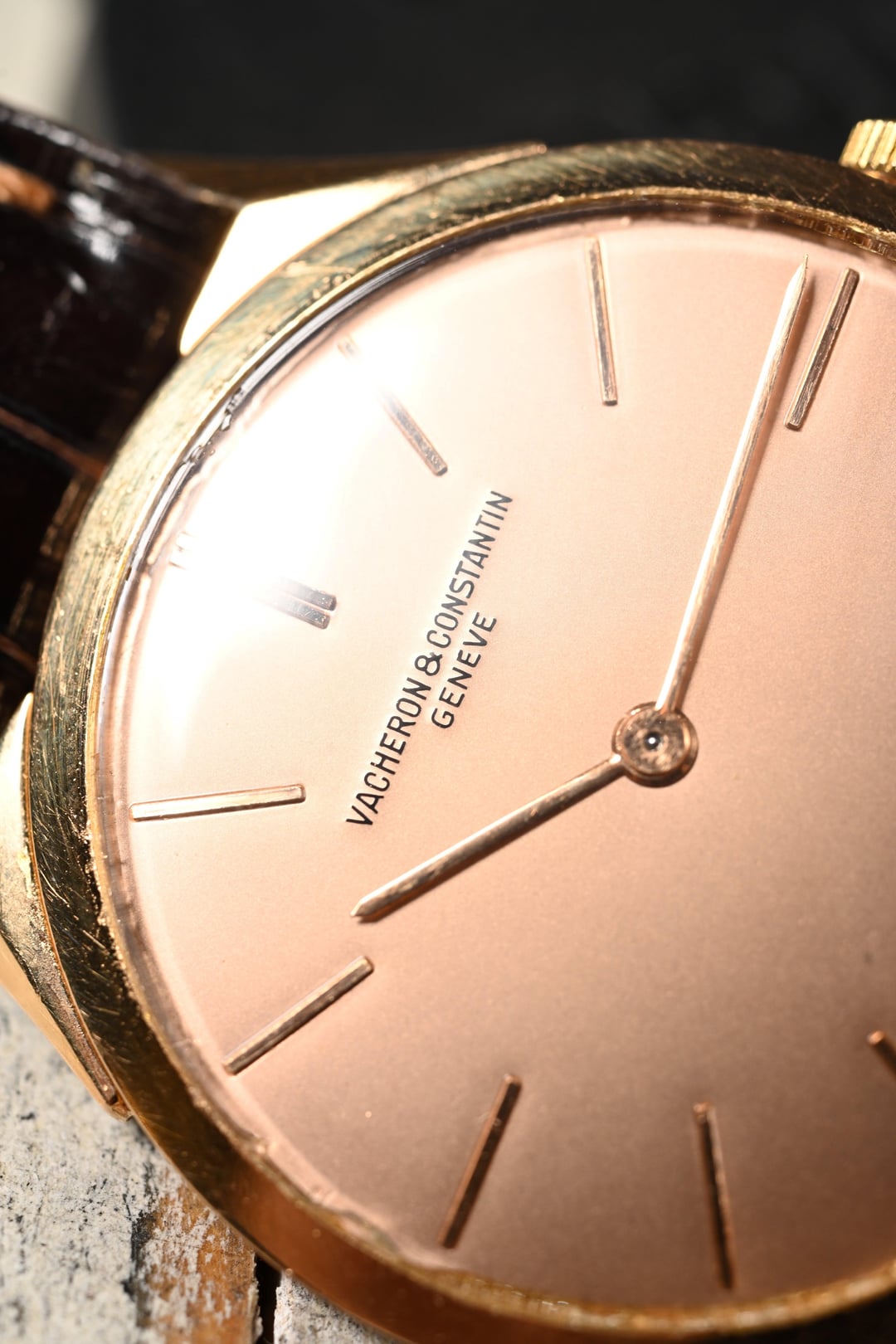 Some watches are purchased by customers as a commemoration in celebration for a life milestone. Others are commissioned by the very Maison themselves to celebrate. In 1955, Vacheron & Constantin was busy celebrating there already 200 years of operation. The fatted calf? The reference 6099. Unveiled to the world, it was the first watch to come completely equipped with the brand new ultrathin caliber 1003 - a movement still in production today. In fact, the summit of watchmaking has been using the caliber for so long that it has been affordable the opportunity to reinterpret its original creations. In 2010, Vacheron & Constantin launched the Historiques Ultra-fine 1955. At just 4.10mm it was at the time the worlds thinnest watch. Its true, other manually wound calibers are thinner but none so reliable The case manufacturer for the 6099 was Eggly & Cie who were produced cases from the mid thirties to approximately the end of the 20th century. They manufactured high-end cases for the likes of Patek Phillipe, Vacheron & Constantin and Audemars Piguet. They specialized in eccentric styles and designs included the Calatrava 2407 dubbed "Sea Turtle." They were also noted for going on to produce Vacherons famed corne de vaches. We are pleased to offer a very special pink on pink example of a 6099. The enamel dial remains all original and demonstrates no signs of cleaning. It will come serviced with a 1 year warranty for $3,999 including shipment. ABOUT THIS WATCH: MANUFACTURER: Vacheron & Constantin REFERENCE: 6099 YEAR: 1956 SERIAL: 517346 CASE: The 32mm solid 18kt pink gold case is in good shape. The case has been previously polished in the past. The case back still illustrates the original brushed finishing. The hallmarks both inside and outside of the case are present and accounted for. The case and case back are serialized and matching confirming they were originally assembled and paired at Vacheron. DIAL: An original pink enamel dial complete with raised enamel "Vacheron & Constantin Geneve" Signature. The raised signature is completely intact and pronounced. The dial exhibits no signs of cleaning. There is one very faint, small dot near the 6 o'clock hour marker than can be seen during certain lighting and viewing angles. MOVEMENT: Vacheron ultra thin manually wound caliber 1003. The caliber is a Jaeger Lecoultre ebauche that has remained in continuous production since its original release in 1955. The movement recently returned from service and will be warrantied for one year dating from completion of service. BRACELET: The watch will not come on the pictured strap. We have a variety of strap choices available that can be discussed with future owner. ACCESSORIES: None. BOX/PAPERS: No. WARRANTY: One year warranty dated from the completion of service. BANK WIRE/ZELLE PRICE: $3,999 shipped. Timestamp: last photo