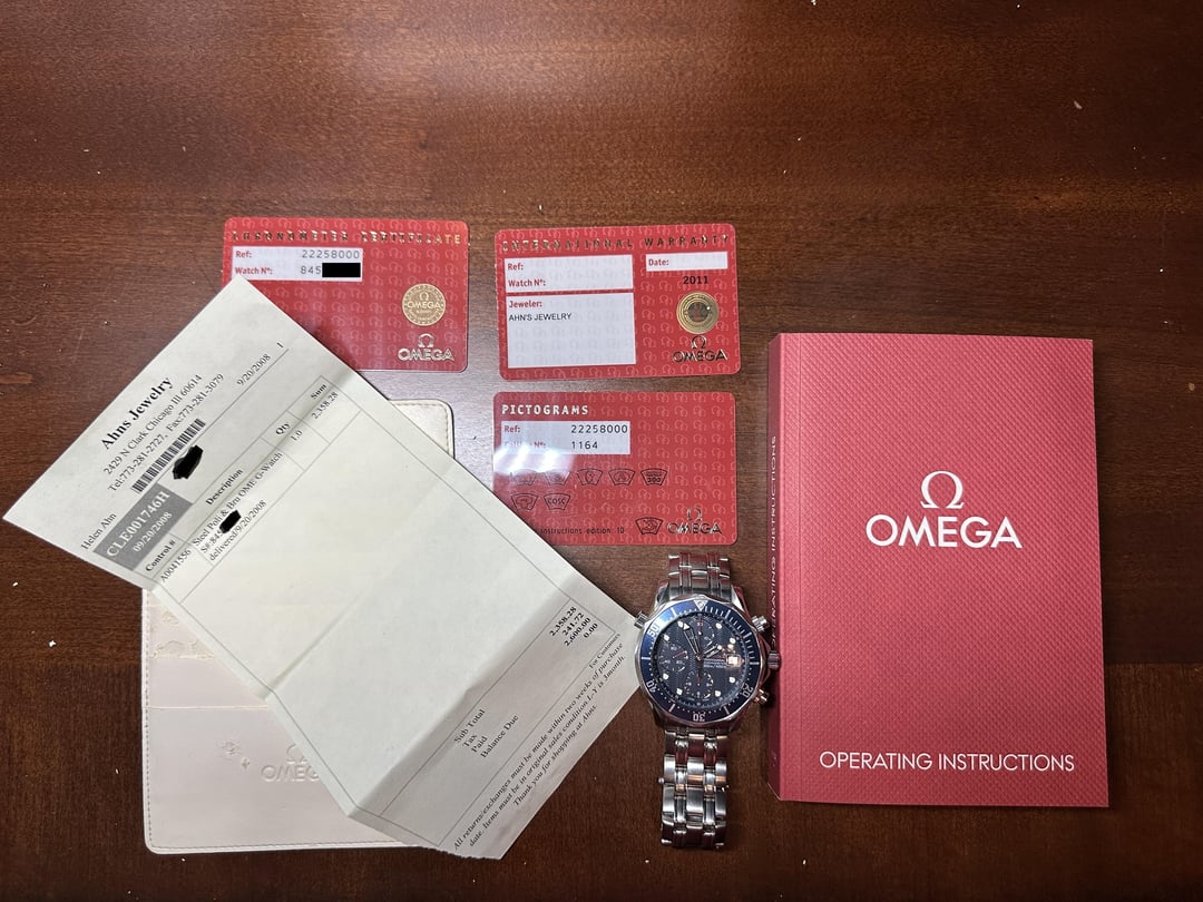 PRICE: $2950 FIRM (including FedEx/UPS direct signature required shipping within Continental US. No non-US buyers). Price hagglers will not be responded to. Includes original box and papers (including original September 2008 purchase receipt from AD, I am the original owner) All original bracelet sizing links included I am a long-time Omega watch collector, and this watch was my first ever Omega that I purchased new from a Chicago AD back in the summer of 2008. As much as it kills me to sell it, I simply never wear it with other Omegas I wear regularly, and it should go to somebody who is able to enjoy it more than I am able to. Crystal is in perfect condition, watch is in great condition with normal use patina (minor tiny nicks/scratches/wear as shown in pictures which I’m sure you could polish out if you wanted), keeps time accurately with no issues. Watch was serviced in April of 2019 by Nesbit’s, and I have barely worn it since (less than 10 times if I had to guess). I tried to take as many pictures as possible, but please let me know if you’d like additional pics and I’m happy to post them. Detailed specs: [https://www.omegawatches.com/en-us/watch-omega-seamaster-diver-300m-chronograph-41-5-mm-22258000](https://www.omegawatches.com/en-us/watch-omega-seamaster-diver-300m-chronograph-41-5-mm-22258000) blue “wave” dial 3 o’clock date window 30-minute, 12-hour, small seconds dials Unidirectional rotating bezel 41.5mm stainless steel case Helium escape valve Omega Calibre 1164 automatic movement 44 hour power reserve 20mm between lugs 41.5mm case diameter Domed anti-reflective sapphire crystal 300m water resistance 216g weight