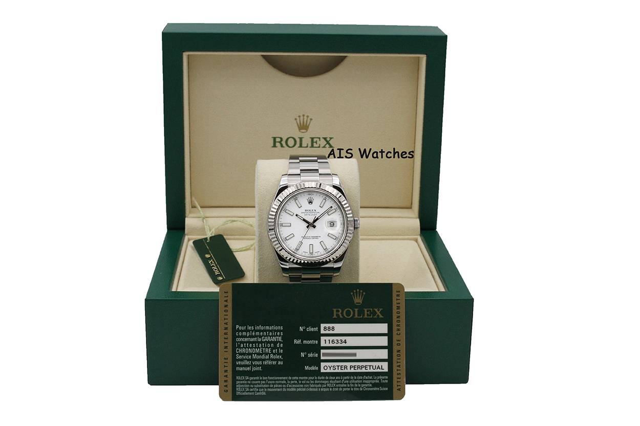 Up for sale is a Classic Rolex Datejust II 41MM 116334 White Stick Dial Stainless Steel Stainless Steel with 18K WG Fluted Bezel Box & Papers. The timepiece is in excellent condition.