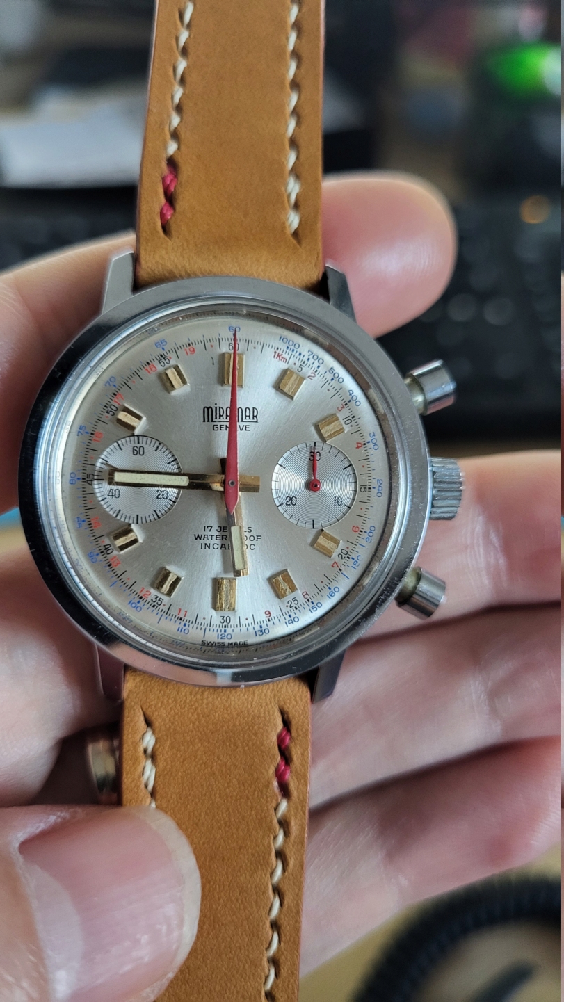 Je vends mon chronographe Miramar. Il a été ré-emboité ce qui explique le boitier en état neuf. Boitier 100% acier et non chromé comme à l'époque. (Plus solide)