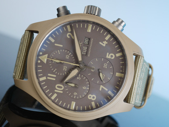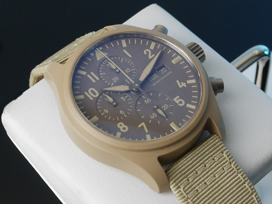 This specific IWC is known as the Mojave Desert, due to its tan ceramic case and military style concept.