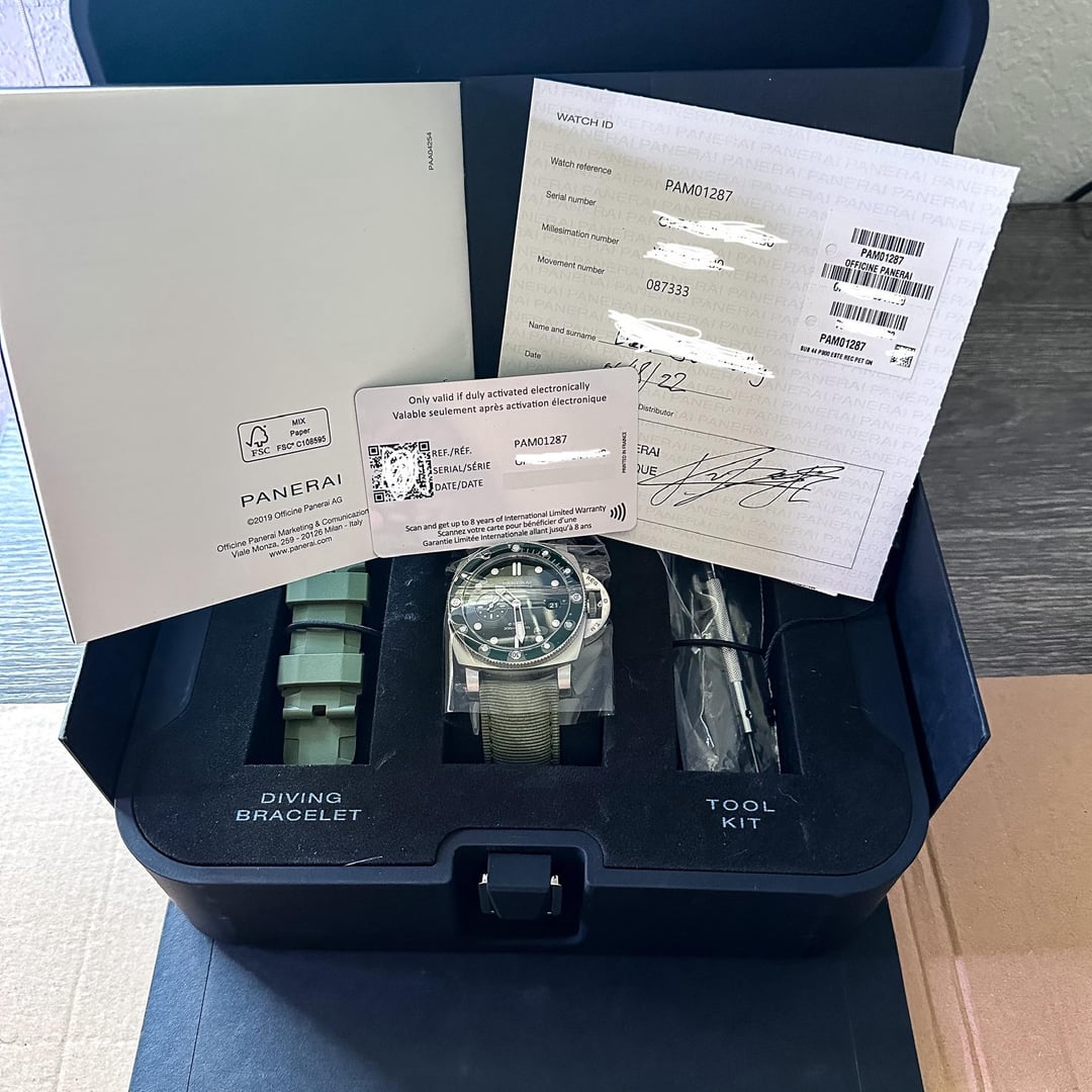 Up for sale is an exceptional new reference from Panerai featuring a stunning green dial and bezel. This timepiece beautifully catches the light and embodies the essence of a true Submersible, with its 44mm 1950s-style case in a refined satin finish. All with an MSRP of over $11.6k before taxes! - Reference: PAM 01287 | PAM 1287 - 44mm stainless steel case - Calibre P.900, 72 hour reserve This watch presents in mint condition with no signs of wear along any parts of the case, bezel or clasp. This timepiece comes alongside: Watch, double box set, 2022 warranty card, manual, PAM rubber dive strap, extra PAM nylon strap, tags, and tool. The warranty is valid until 6/2030 Asking - $8,350 Fully insured overnight shipping included in the US. Located in WPB, FL for local pick-up. I ensure a seamless process, providing trusted references within the watch community for your peace of mind. Feel free to reach out with any questions. Thanks for looking!