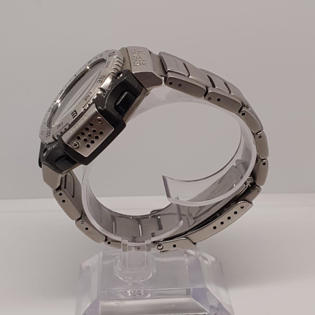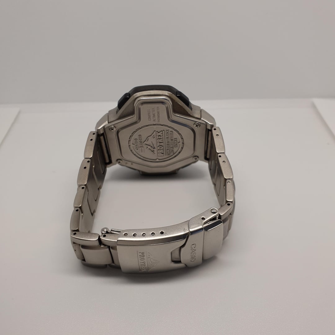 For sale is this vintage Casio ProTrek PRT-1400 Titanium model made in Japan and only sold in Japan from 1999. This model was top of the range when it was released in 1999 and was a Japan-only model that improved on the previous model with the ability to read and record altitudes of up to 6000m for the most dedicated climbers and hikers. This model features a titanium bracelet and parts of the watch head are also titanium. Coincidentally the module number is also 1999 which is a neat little easter egg. Features include: \- Temperature Sensor \- Air Pressure Sensor (in hPa/mb) \- Compass- Asymmetrical case and bracelet design \- AM/PM or 24h time \- Day of week \- Date \- Month \- Year \- Seconds counter around the edge of screen \- Barometric Pressure Trend graph (predicts weather) \- Dual screen with dot matrix \- 5 daily alarms \- Hourly Chime \- Stopwatch chronograph with split time \- Barometric pressure trend graph (predicts weather) \- Altitude readings/graph \- 50x recordable/recallable data slots \- 5x Recordable compass readings \- Altitude alarm (chimes when you reach a desired altitude and shows progress in the seconds counter around the edge of screen) \- 100m water resistance \- Auto EL backlight This is a rare piece that you will not find easily especially in this condition. Condition is very good 8.5/10 with only very minor visible wear to the polished part of the bezel and minor wear on the rest of the watch specifically watch back and parts of the bracelet (see pic to make sure you're satisfied) Dimensions are 39mm bezel, 50mm wide, 49mm lug to lug, 20mm lug width, 15mm thickness Due to the links available, it can only accommodate up to roughly an 18cm wrist, otherwise you can attach your own strap. Bought in Japan. As this is a vintage product I cannot guarantee its water resistance. Extra Photos and Video (& time stamp): [https://flic.kr/s/aHBqjBXaQ7](https://flic.kr/s/aHBqjBXaQ7) $239 (Paypal plus Goods and Services) including tracked international shipping Item Location: Japan