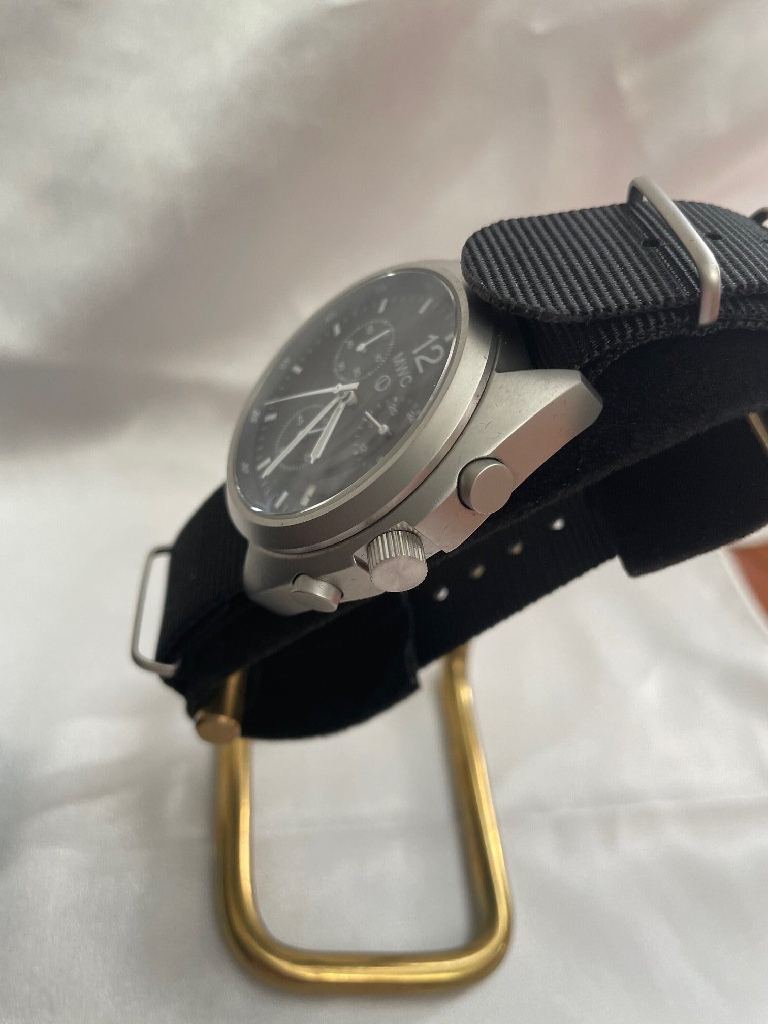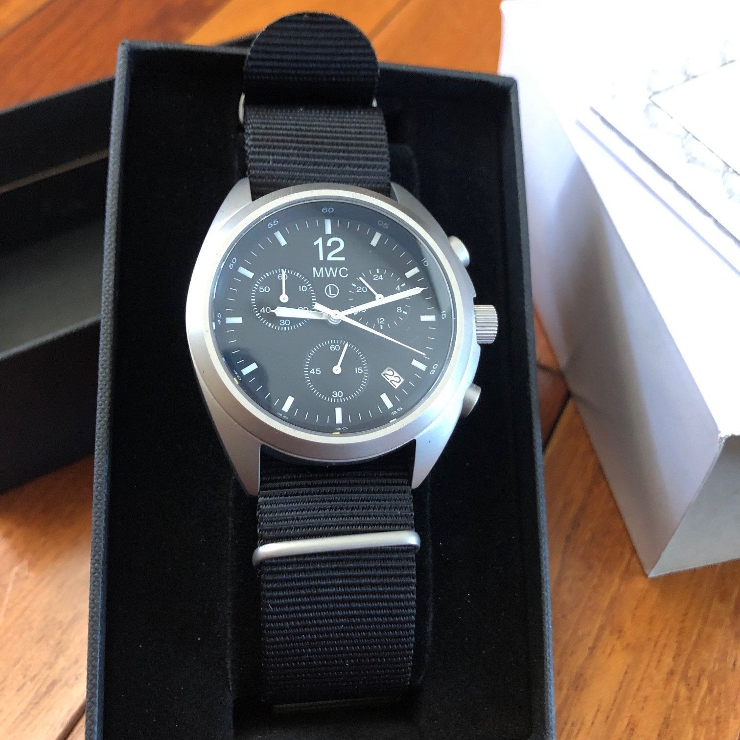 "The MWC NATO chronograph in stainless steel case is based on the same basic specification used by several other manufacturers of NATO chronographs but with a number of detail improvements to improve operation and visibility. Although the watch is made to a specification which is specifically designed to meet the needs of military aircrews it is also ideal for both airline and GA pilots. The actual case size is 45.5mm and the chronograph uses a high-performance VK68 hybrid movement."