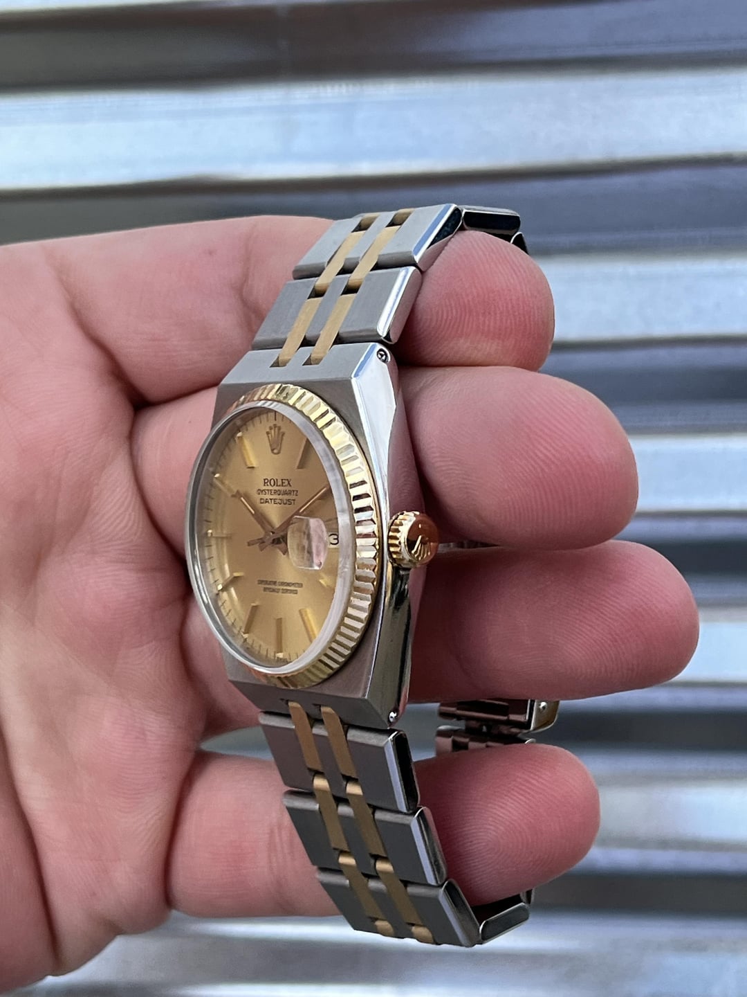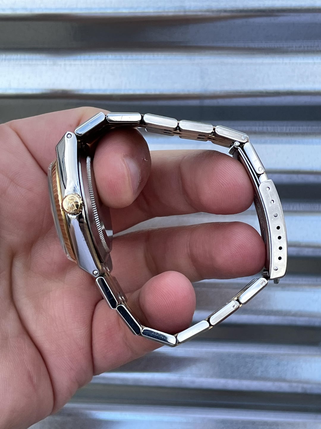 Here’s a two-tone 36mm Rolex 0ysterquartz Datejust Reference 17013 in very nice condition. Reference number: 17013 Case: 36mm Serial number: 8.1***** serial which dates this watch to 1984 COMES WITH WATCH ONLY 💰4️⃣5️⃣0️⃣0️⃣+ ✈️ The watch is in overall very good pre-owned condition - see pics for details. The 36mm case is super sharp with crispy chamfers. The gold bezel is in good shape. Still crispy. The bracelet is in really good shape too. The finish on the bracelet is clean. Brushed satin finish straight through, with the high polish sides and with that 45 bevel, which is very pronounced on this. The bracelet is also tight and not stretched. Fits a big wrist also with 12 links (about 7.5” wrist). Overall nice OQ. Two tone, champagne dial, fluted bezel, and in good shape, despite it being 40 years old. 💰4️⃣5️⃣0️⃣0️⃣➕✈️ I accept Zelle/Wire. Fully insured shipping once payment clears, no exceptions. I have plenty of references across Facebook groups as well as Reddit feedback. Follow me on IG for more deals: @215watches Thank you for your time! [photo album](https://imgur.com/a/XyOXS5y) [time stamp](https://imgur.com/a/ioIHOun)