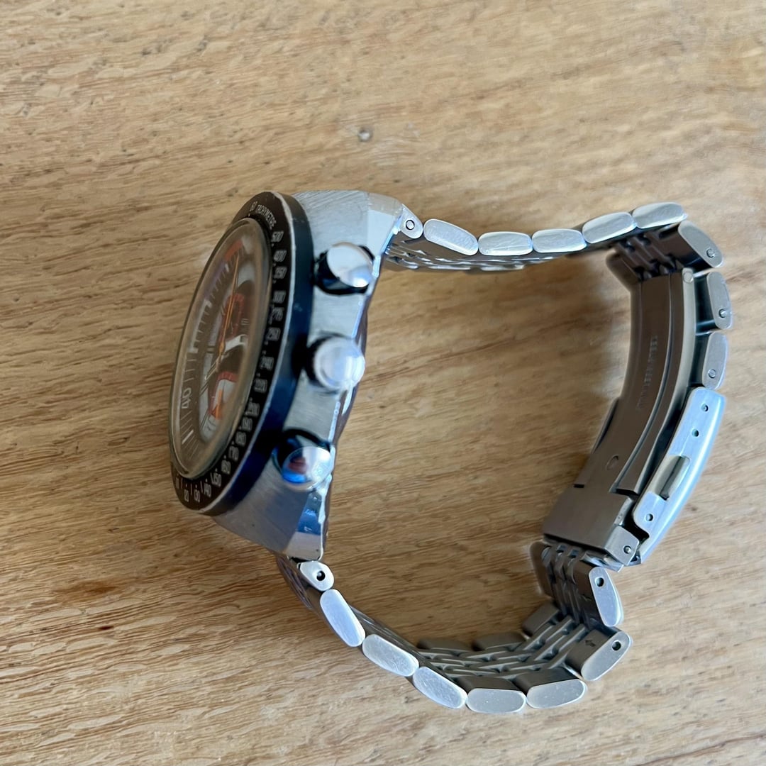 Globus (made by Sicura) chronograph 1970’s USD$ 280 Rare and quirky find. That’s what appealed to me but it didn’t suit on the wrist so catch and release. I like big watches and this one is a 45mm case, but the smaller lug-lug and bezel size makes it wear a lot smaller than it looks in my view. This probably works for most people. In good condition for age, does not appear to have been worn much. The colours are very crisp and bright, orange hands are almost fluorescent. Minor wear on the case and bezel. Lume appears to be tritium, no good anymore. Acrylic crystal. Keeps good time. Chronograph functions however the sweep seconds does not always reset to 12. Other than that this watch is all good. On a 22mm BOR bracelet, sized 7.5in at the moment. I have spare links. I also have the original red and blue NATO it came with. EB 8420 manual wind movement Lower (yes lower) pusher is start stop Middle crown is winding setting Top pusher reset Left crown is rotating inner ring Case width 45mm Lug to lug 42mm Bezel 40mm Thickness 15mm (inc crystal) Lug width 18mm Shipping at your cost. $15USD worldwide to most places. I have sale history here and elsewhere. PM me.