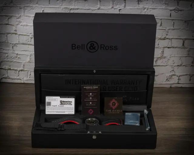This Bell & Ross BlackTrack was sparingly worn and looks practically new. It comes with its complete original set, including inner/outer box, manual, warranty card, strap tools, and both the OEM black and red calfskin strap & black synthetic strap. The other white box sleeve has a couple tears in it but the actual box itself is fine.