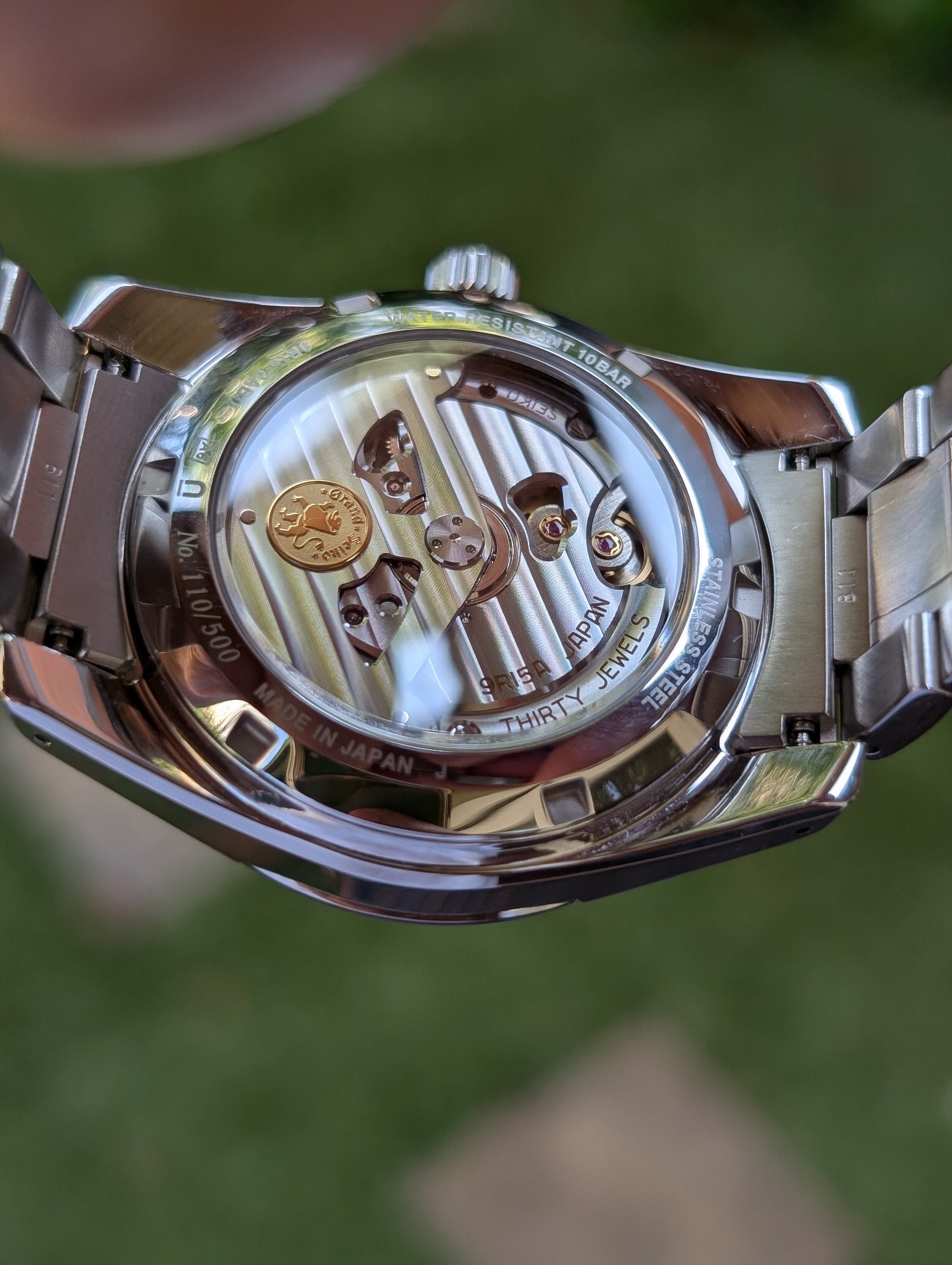 Sbga103 spring drive with the uprated 9r15 movement seen with golden medallion which indicates higher accuracy than normal spring drive +/- 0.5 seconds per day.