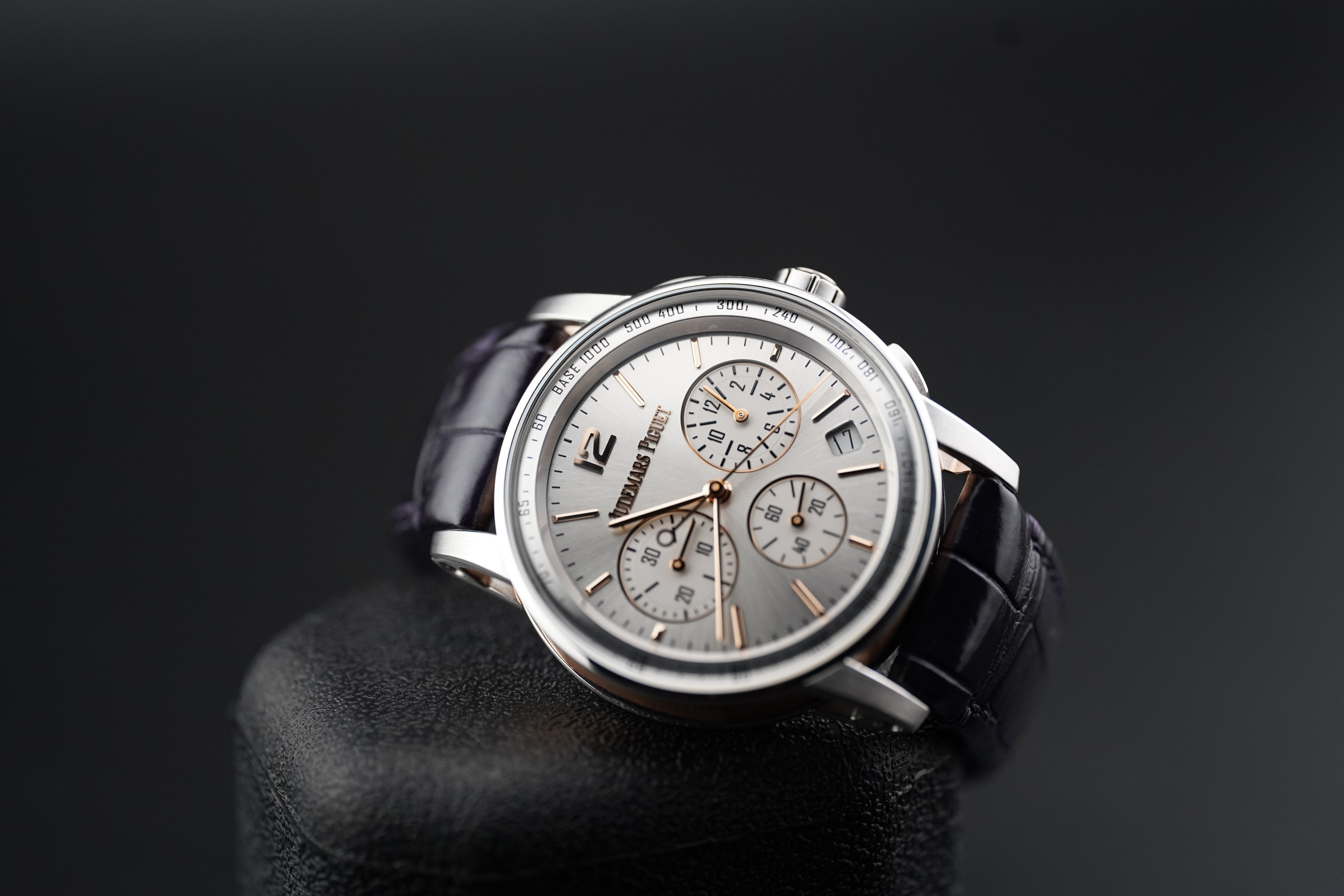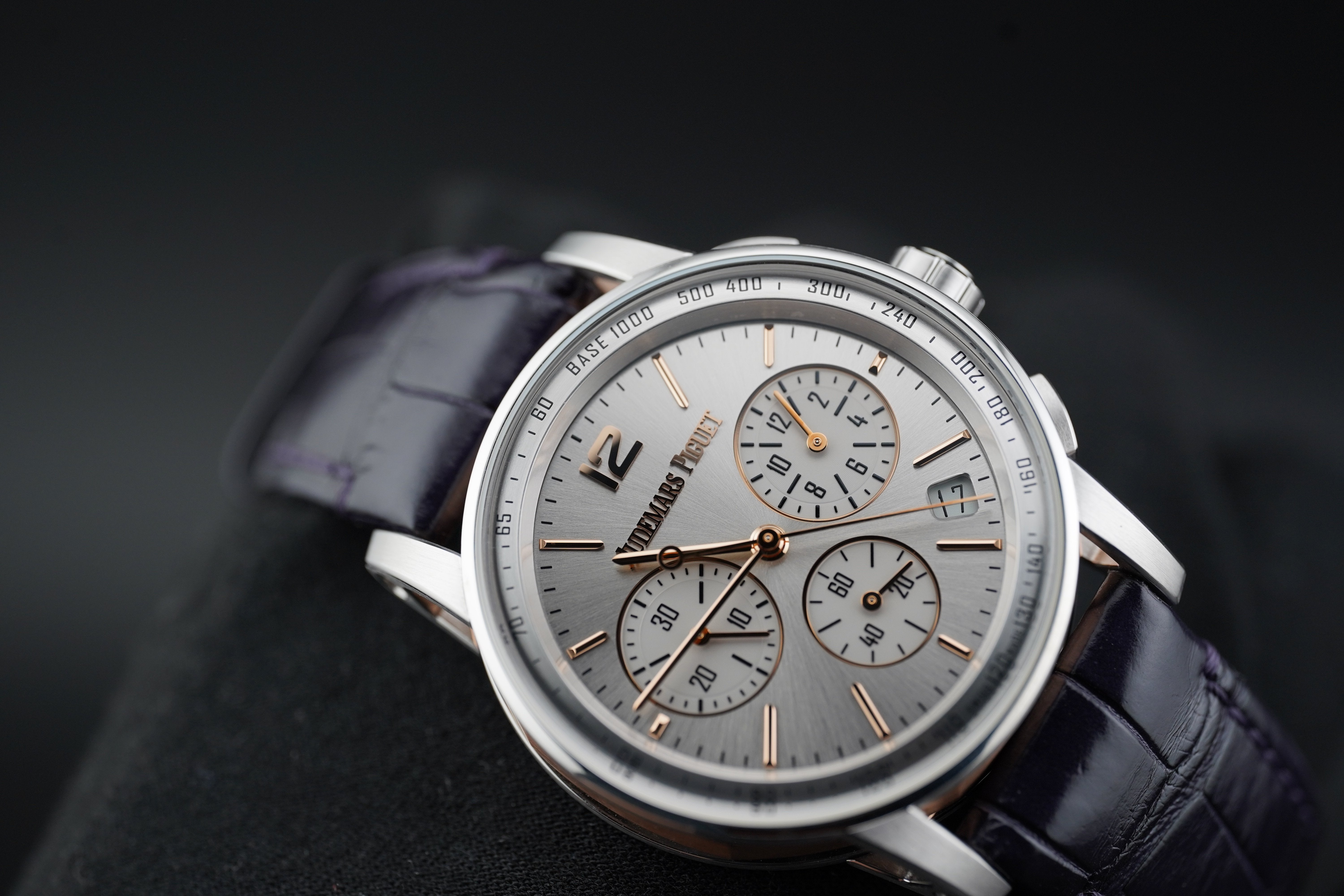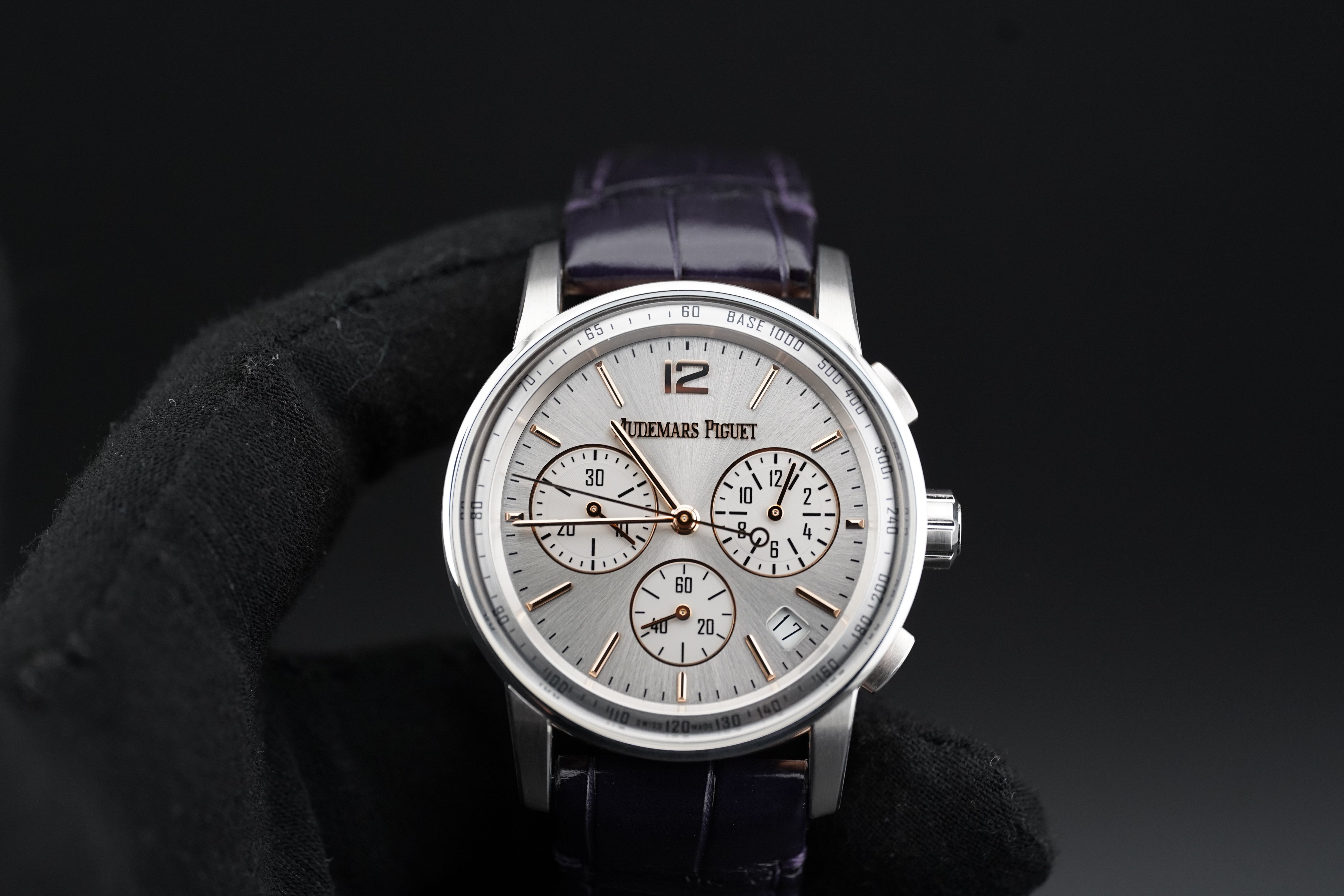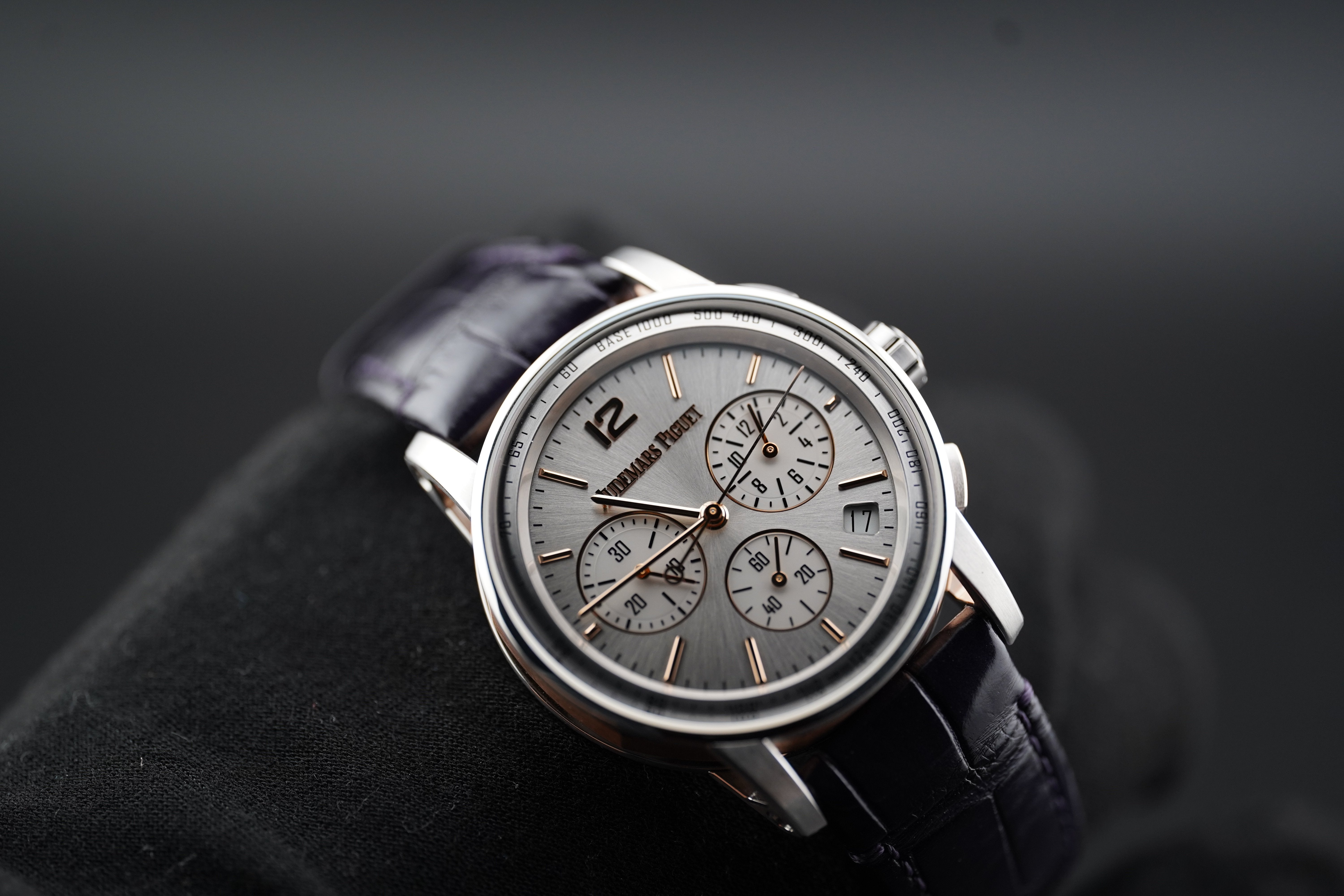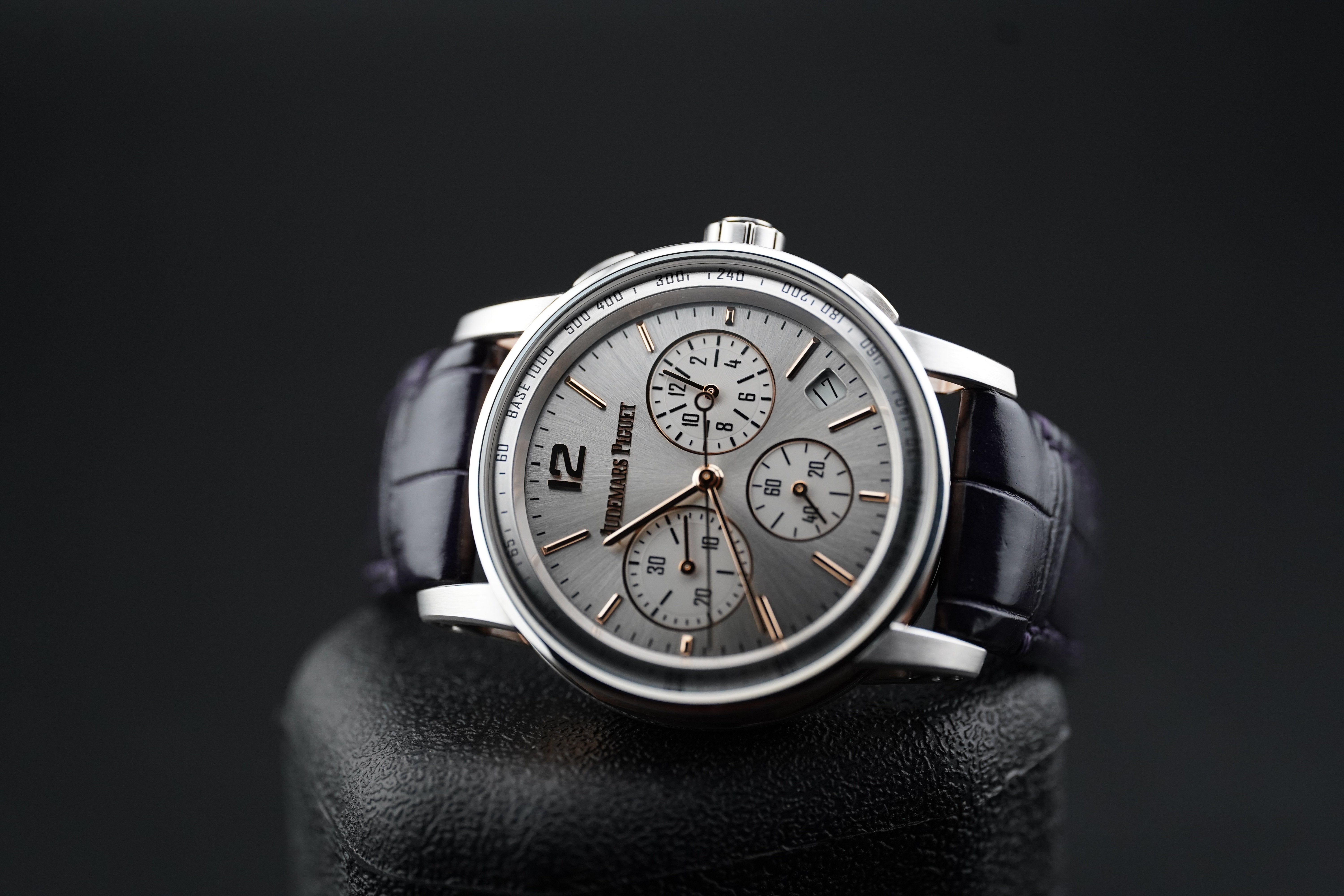 Dial: Sunburst Grey Lacquered with Pink Gold Applied Hour-Markers and Hands