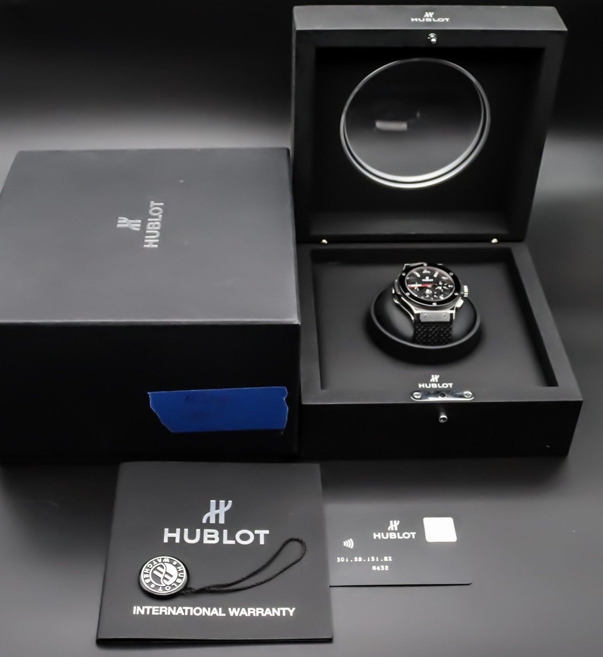 The watch comes with everything pictured. It comes with the outer and inner Hublot boxes, warranty card, & tag.
