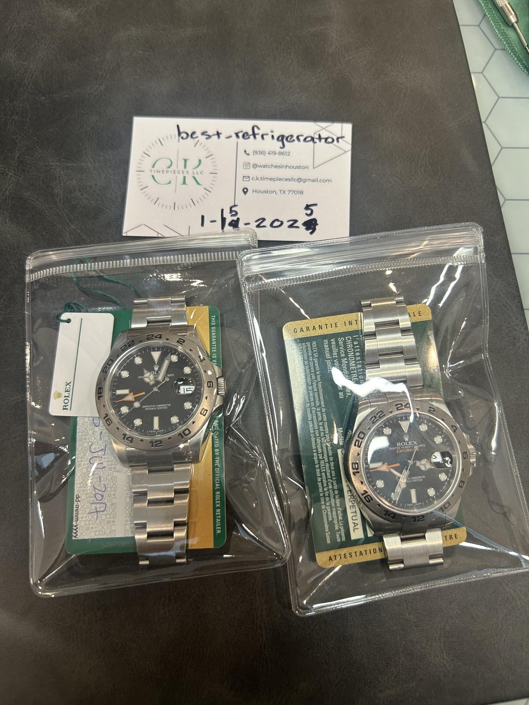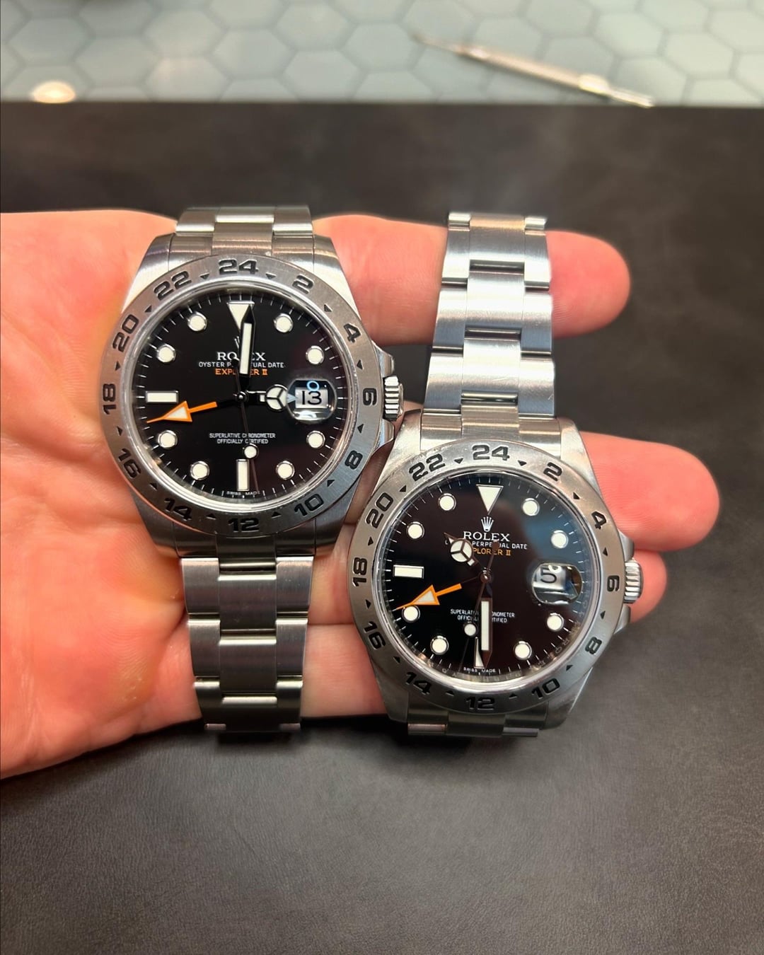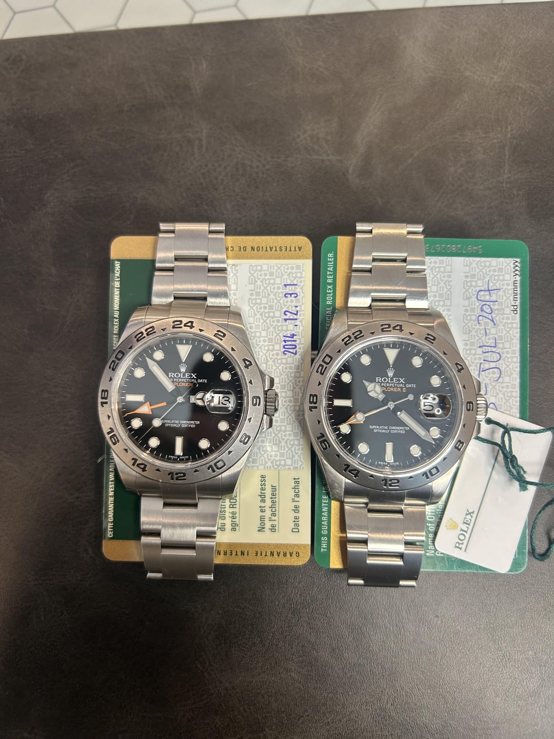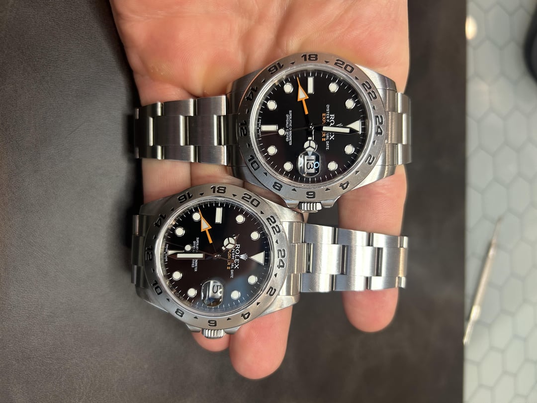 Have two black Explorer 2s available: 2017 Includes watch, warranty card and white tag. 11 links Watch is pre owned and shows some signs of wear. I can send better pics on request. The bezel has some flea bites as well as the clasp. And there are normal hairline scratches throughout. $7,800 2014 Includes watch and warranty card. 11 links Watch is pre owned but overall great shape. Can send more pics on request $7,550 Watches can be polished if needed also Located in Houston Tx Prices include overnight fully insured shipping Thanks for looking!