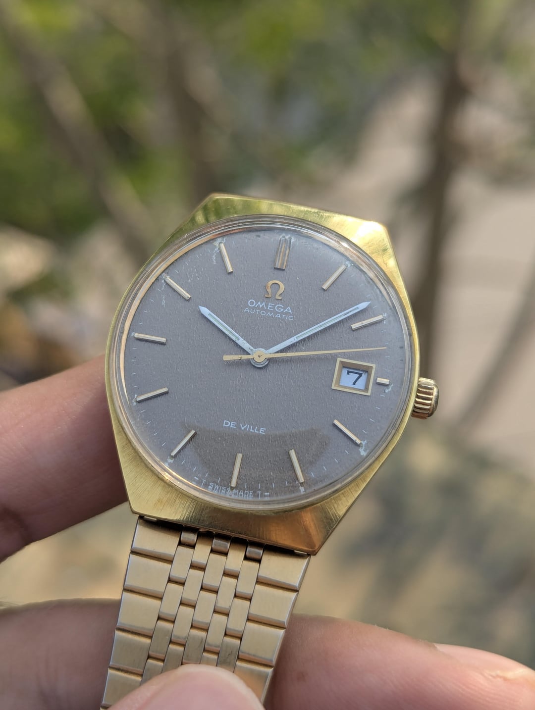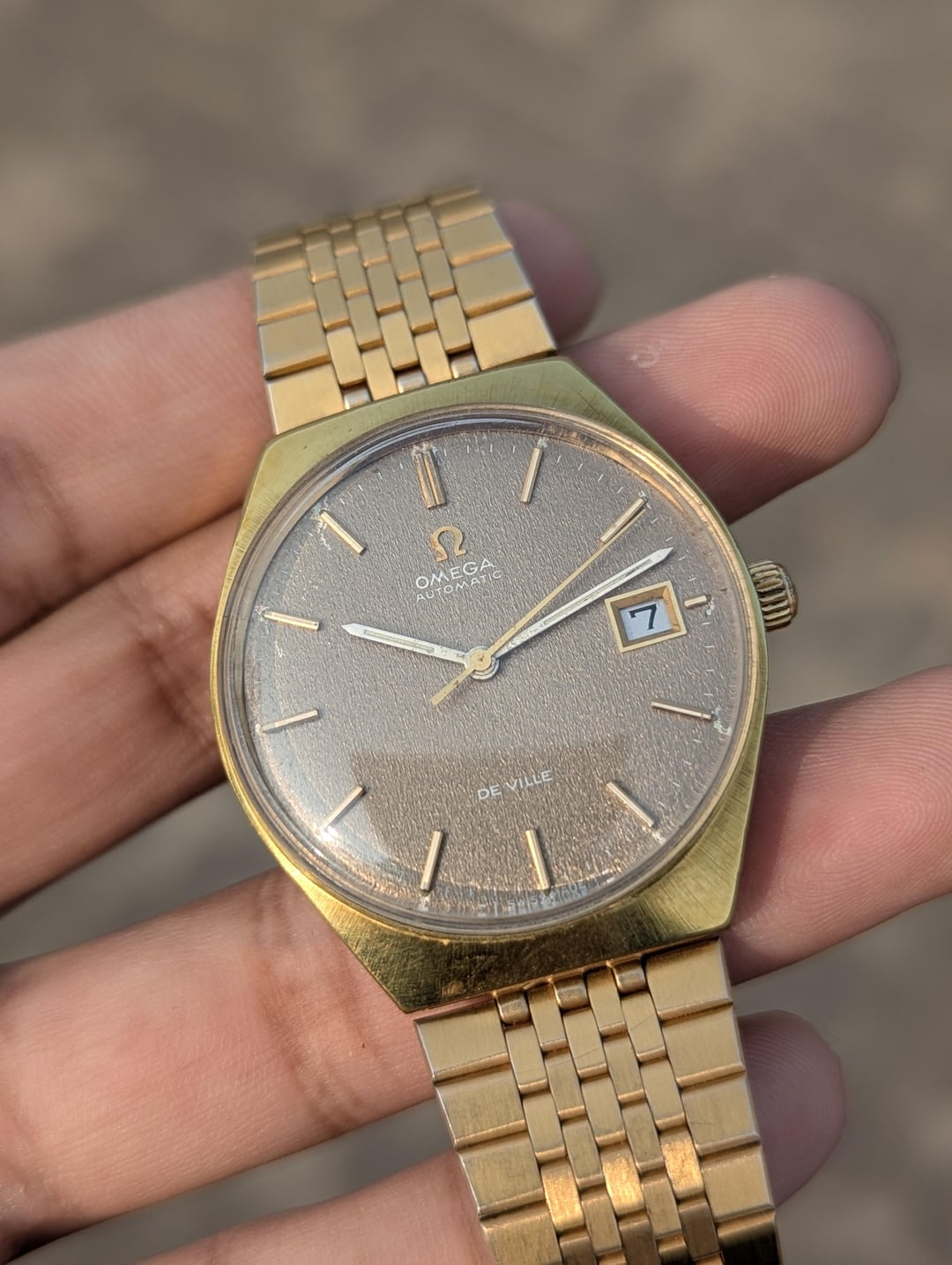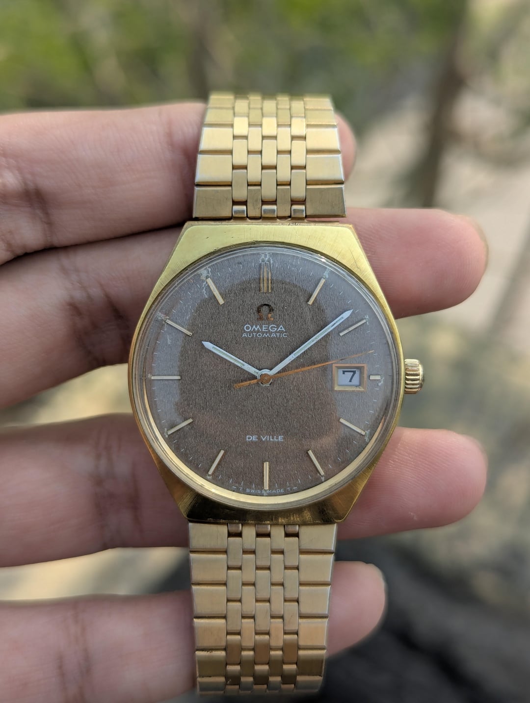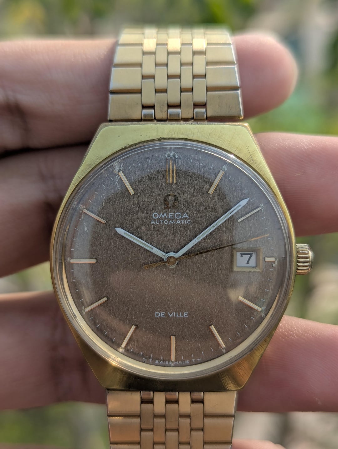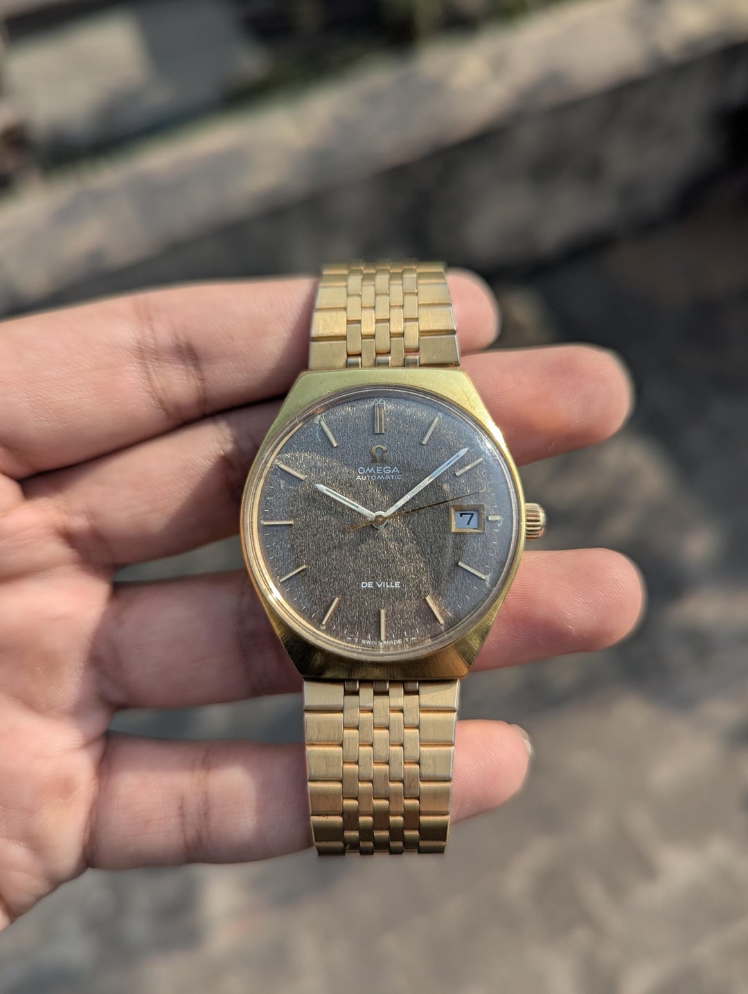 [WTS] Vintage Omega De Ville Automatic – 166.051 – Rare Textured Brown Dial –––––– $700 USD Only!!! ♦I have the special pleasure to present to you a watch with a rich history, an Omega de Ville, automatic movement cal 1002, manufactured in 1970, ref 166.051. Description: In the early 1960s, Omega enjoyed a notable period, launching their famous trilogy of instrument watches—the Omega Speedmaster, the Omega Seamaster, and the Omega Railmaster—in 1957. At the same time, they served as the official timekeepers for the Rome Olympics in 1960. In this era, the Omega 'De Ville' made its debut, initially as part of the Seamaster series and later evolving into the 'Seamaster De Ville'. The presented example is rare, having an original factory "star dust" dial called Stardust in impeccable condition, the case opening is done from the front. Applied hour markers and hands are original luminescent white. 35mm diameter case, 40 micron gold plated, in good condition Original crown signed Omega. Thank you. ⬜Features ♦Analog Display ♦Stainless Steel ♦Mineral Crystal ♦Date Indicator ♦Automatic Movt ♦Swiss Made ⬜ Measurements ♦ Case Size: 34mm ♦ Case Size with Crown: 37mm ♦ Lug To Lug: 38mm ♦ End Link Width: 18mm ♦ Bracelet Length: 7 Inches ⬜Condition: Good Vintage Condition. WORKS GREAT 10/10. Serviced a couple months ago and not polished, keeps good time. Has some minor scratches as comes with time. The dial also has some damage on the indices. Please review the images provided. No Original box and papers. 🔹Please COMMENT FIRST before sending me a pm or chat. 🔹Custom Timestamp Pictures will be given if requested. 🔹Payment Method: PayPal F&F Only 🔹Feel Free to ask any questions in the comments or pm. 🔹Ships Internationally by UPS.