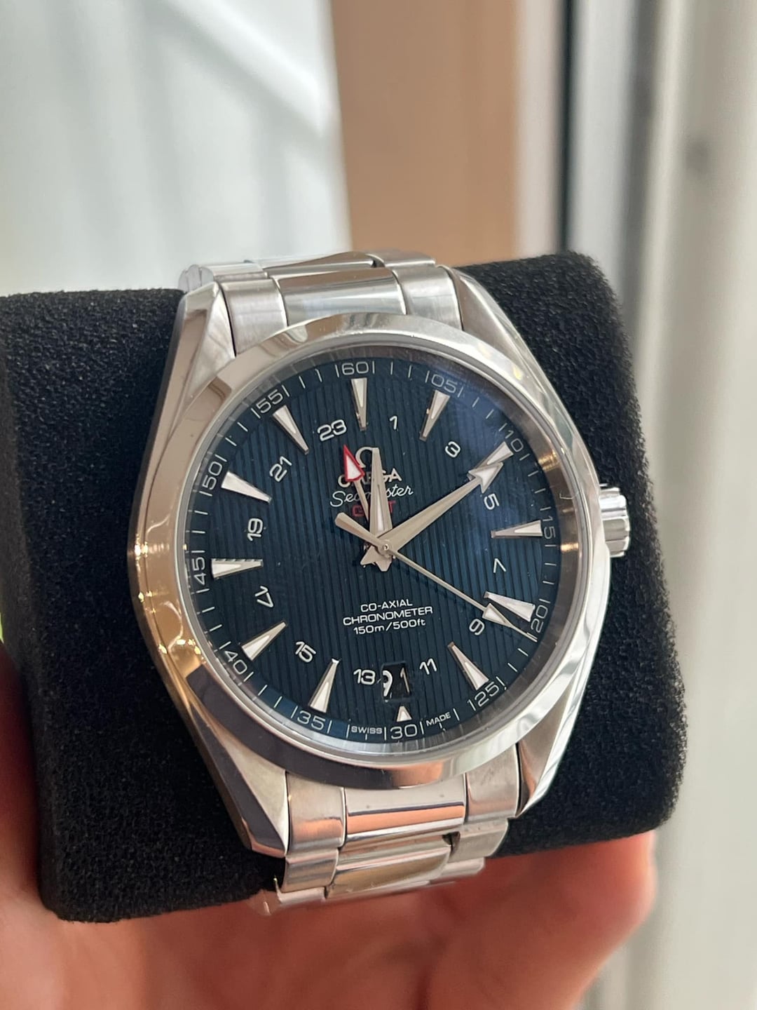 This classic yet robust timepiece represents a tribute to OMEGA’s rich maritime heritage. The dramatic and easily-recognisable dial design of the OMEGA Seamaster Aqua Terra 150M collection recalls the wooden decks of luxury sailboats. This model features a blue dial decorated with the Teak Concept pattern and a date window at the 6 o’clock position. In addition to central hour, minute and seconds hands, there is also a GMT hand that completes one rotation around the dial every 24 hours. A scratch-resistant sapphire crystal protects this unique dial. The bezel is mounted on a 43 mm stainless steel case on a stainless steel bracelet. This certified chronometer is powered by the OMEGA Co-Axial calibre 8605 which can be seen through the transparent caseback. Watch is in very good pre-owned condition with minor signs of wear. Box & papers included. Asking: $4,200 shipping included. I ship FedEx priority overnight and insured. Open to all forms of vetting and will never turn down a FaceTime or video call.