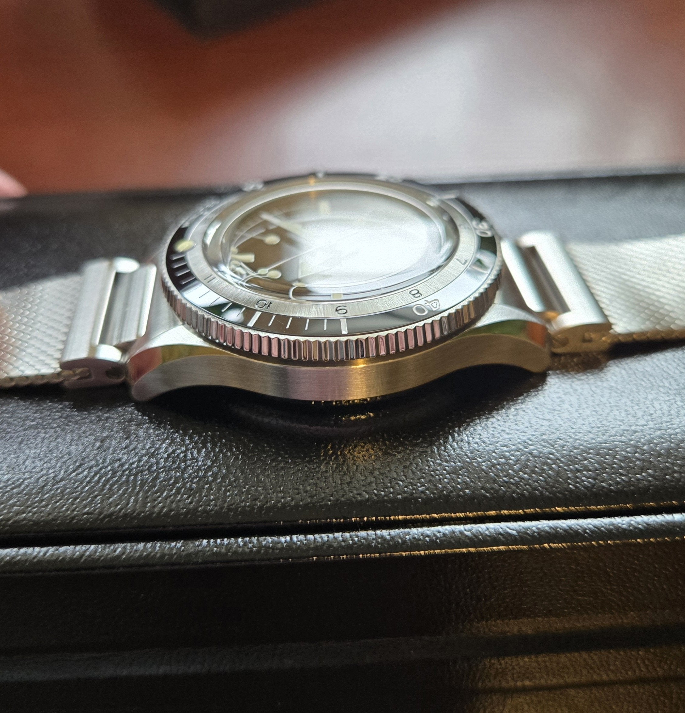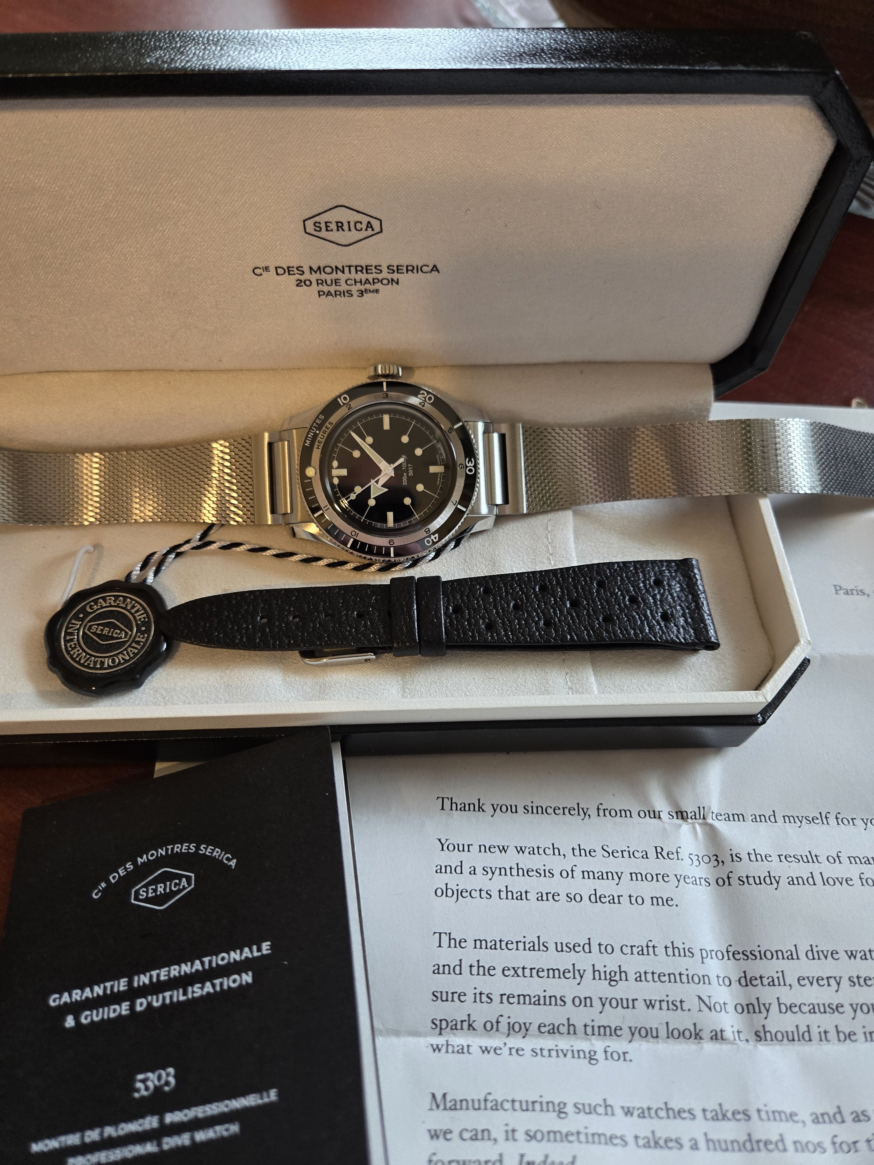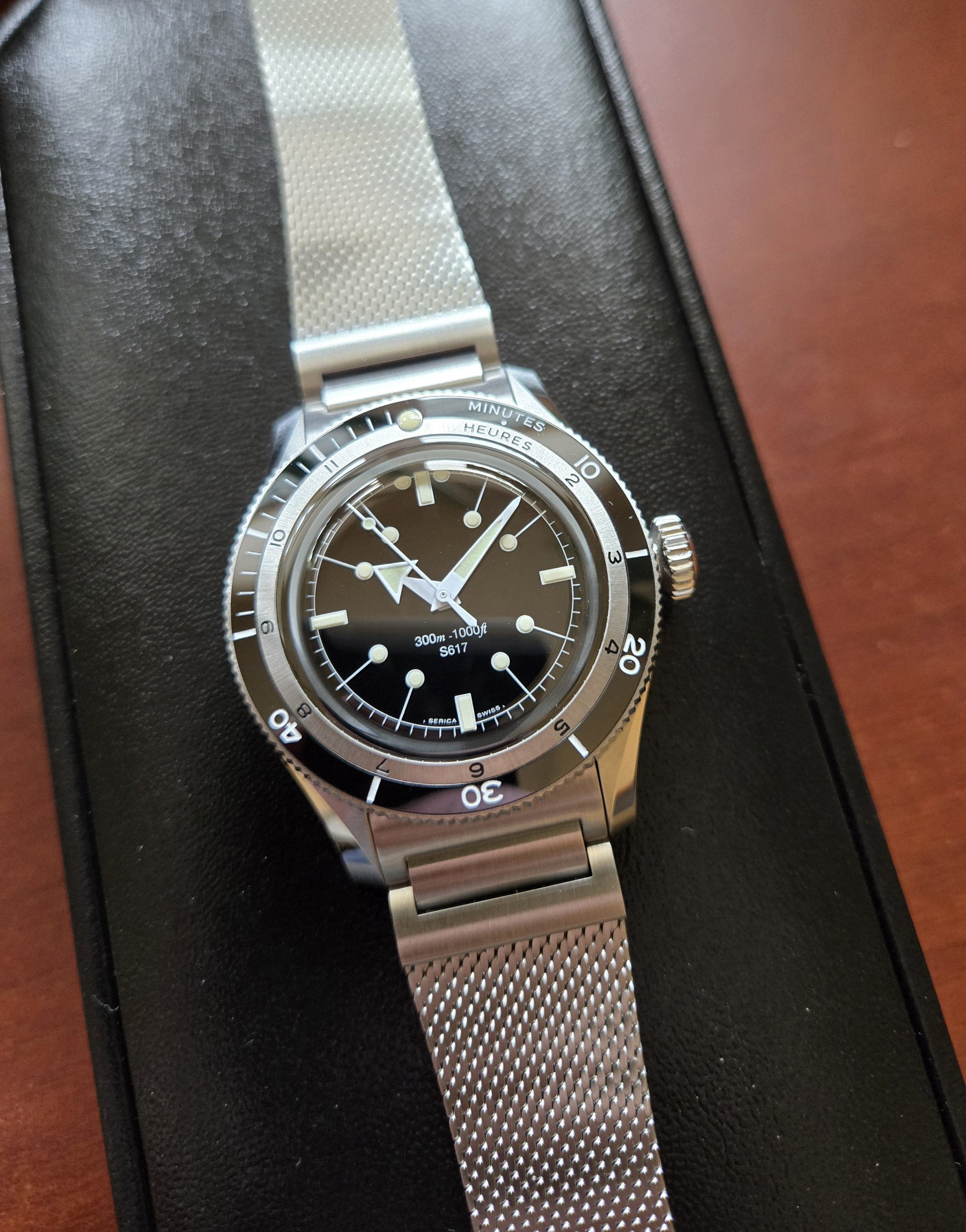FS is my Serica 5303 diver. I'm the 2nd owner, originally purchased direct from Serica in November 2021. Crown was replaced by Serica per their recommendation, works perfectly now. Mint condition. Diameter 39mm, thickness 12.2mm, lug-to-lug 46.5mm, lug width 20mm, water resistant to 300m. This is the original, non COSC diver, but the Soprod movement runs within COSC specs. Super smooth bezel action. The Milanese bracelet is gorgeous and very comfortable. Original owner also purchased a black leather rally strap from Serica, although it appears to be a Joseph Bonnie strap, which is a good thing. Includes box/papers as received from Serica. $850 shipped in the US. Sorry, but not looking for trades. Prefer Zelle, but willing to discuss other payment methods with established members. Thanks for looking.