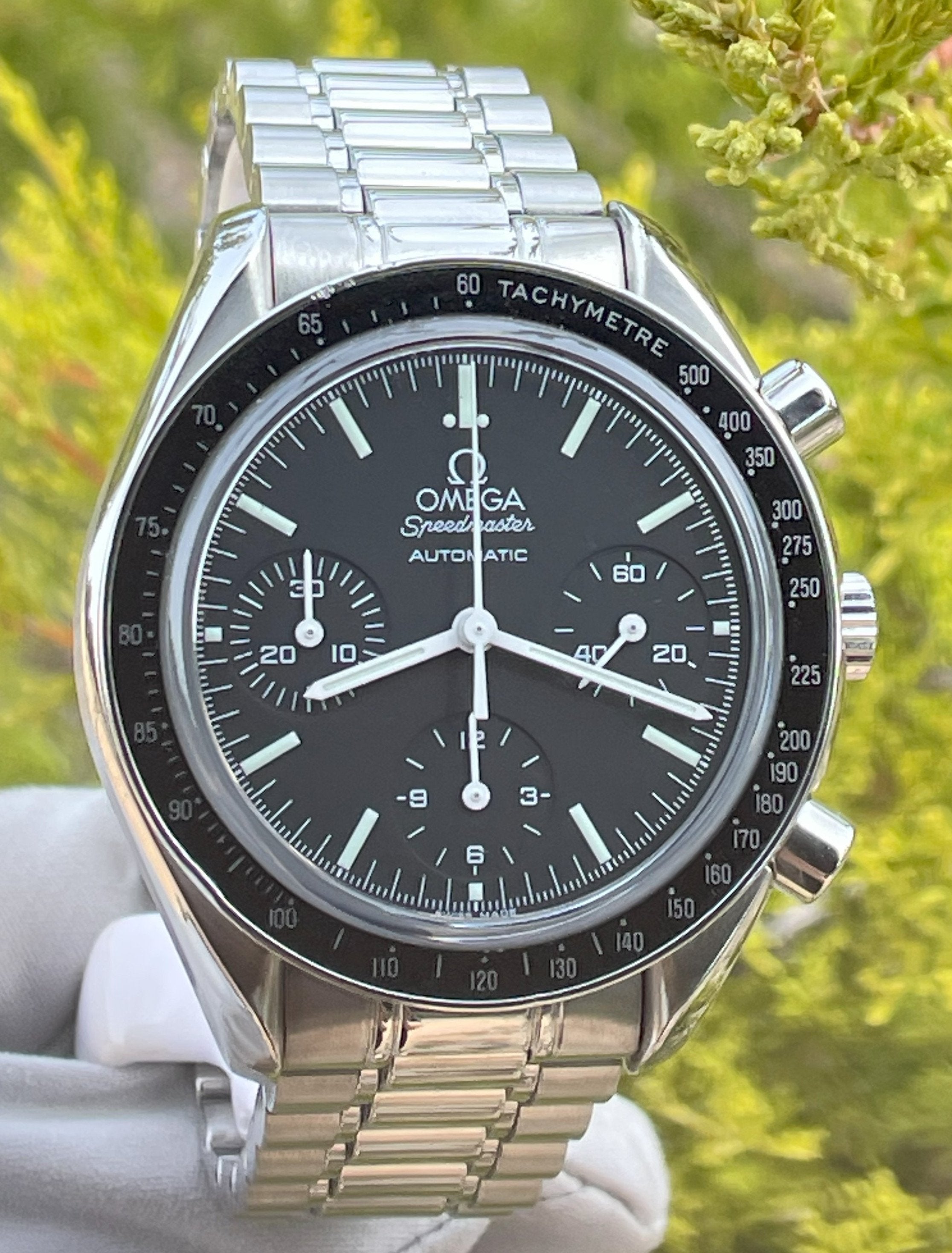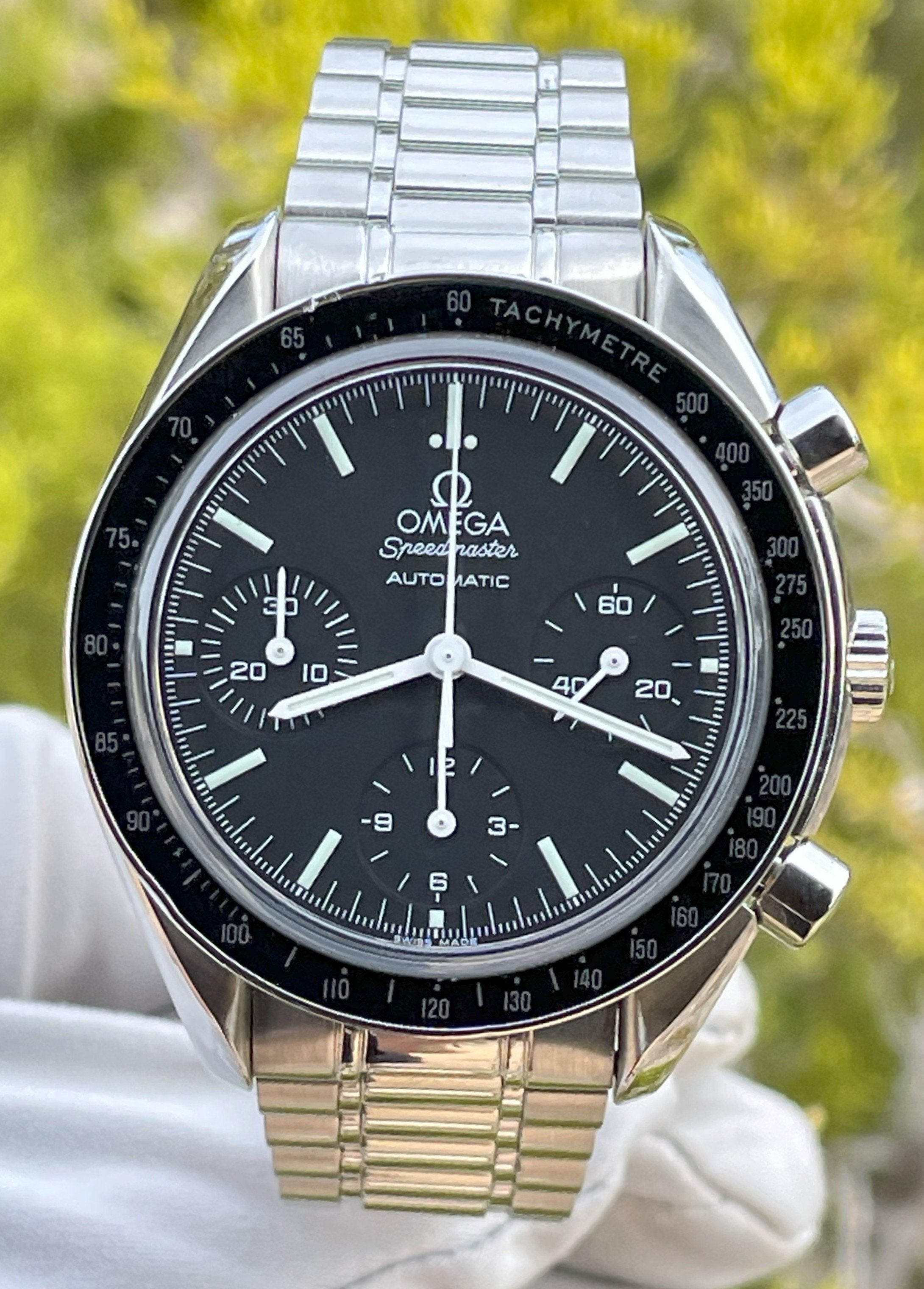 Beautiful pre-owned Omega Speedy Reduced 3510.50.00 in excellent condition as pictured. This stunning 39mm piece features a beautiful black dial and matching bezel. This is mounted on a stainless steel bracelet, which will fit up to a 6.75 inch wrist. This comes in a travel case with insurance appraisal. Unfortunately, the original boxes, manual, and warranty cards were misplaced. All pictures are of the actual item being sold. (5308)