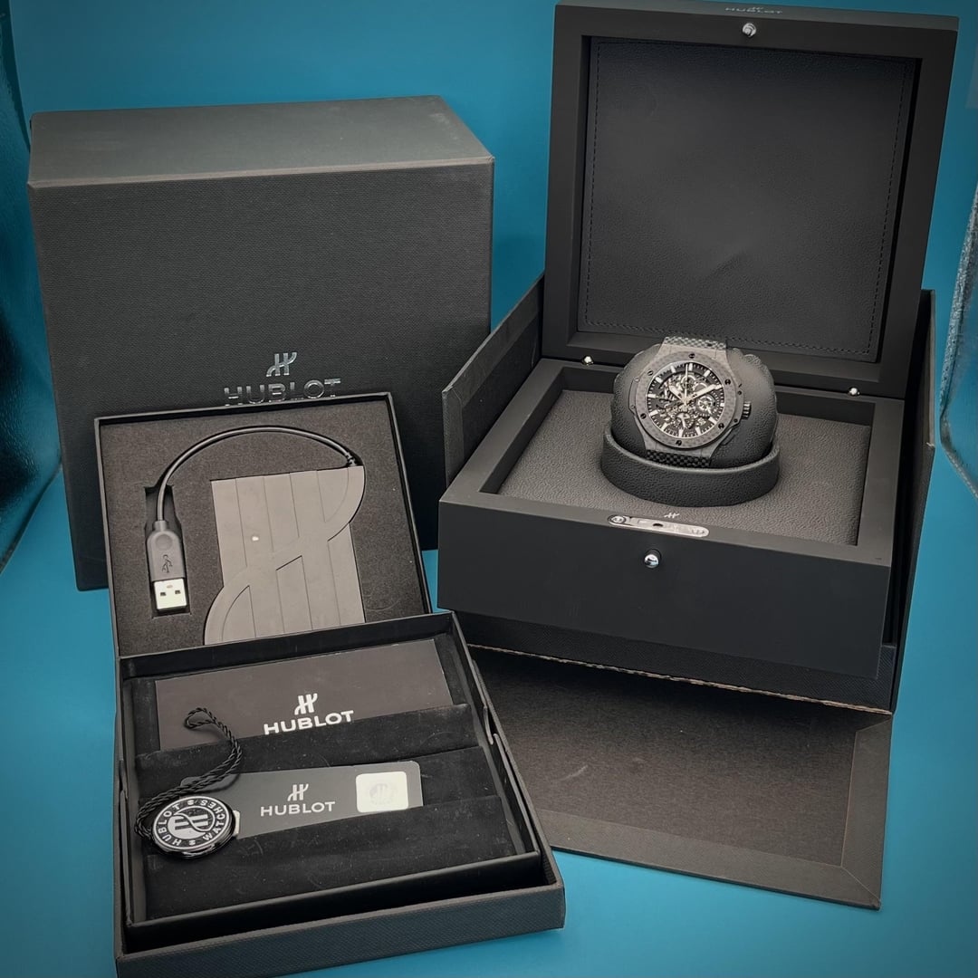 \*\*\*DEAL\*\*\* Cheapest Big Bang Aero Bang Carbon Fiber one in the world. With its ultra-light case and boisterous presence, this skeleton dial pops off of the wrist with assertive ubiquity. The watch is in good condition with some signs of wear on the bezel, with notable signs of its unique weathered past on the bezel at 5 o'clock and 11 o'clock. Strap, clasp, and case are all in very good condition. PRICE: **$7,798** \+ label SHIPPING: We ship fully insured FedEx Priority overnight. I'm happy to provide plenty of references on multiple platforms as well as free to jump on facetime to introduce myself, my company, the watch, and to make sure that this timepiece is the right one for you. PAYMENT: We accept Zelle or bank wire as payment. COMES WITH: \- Watch \- Outer and inner boxes \- International Warranty card and instruction disc. \- Hublot instruction manual \- Hang tag Timepieces are an incredible accoutrement to our lifestyles, so I strive to accurately display all of my watches' exact condition in my photos/videos and pride myself in being very customer service oriented. My goal is to have 100% positive and smooth transactions, so please feel free to reach out if you have any questions, and thanks so much for checking out my listing!