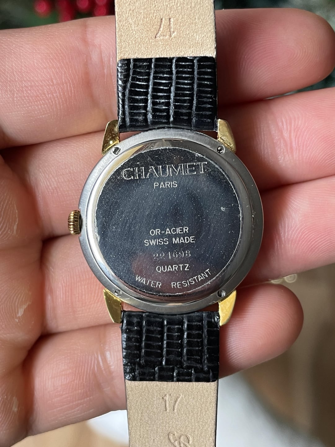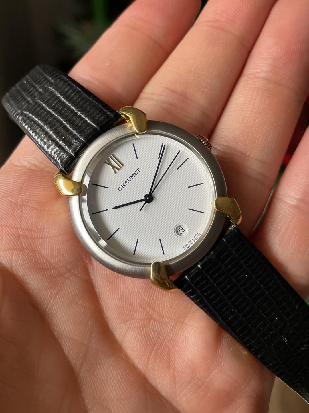 Up for sale is this dressy two tone Chaumet Griffith - Swiss Made. This watch features a 32mm case diameter and 34mm lug-to-lug. It is powered by a Swiss quartz movement and includes a stepped date window positioned at 6 o’clock. The hands are heat-treated blue, complementing the refined two-tone case design. It comes fitted with a new generic 17mm leather strap. In terms of condition, the watch keeps good, accurate quartz time. The date changes precisely at 12 and quicksets as intended. The case is unpolished and great condition (refer to photos). Timestamp - https://imgur.com/a/IzD1SX5 **Price - $400 incl. shipping (Wise, PP f&f or g&s +3%)** Please comment on the post before dm’ing with any further questions. Thanks for looking! To see more interesting timepieces visit https://www.instagram.com/moments_in_motion_/