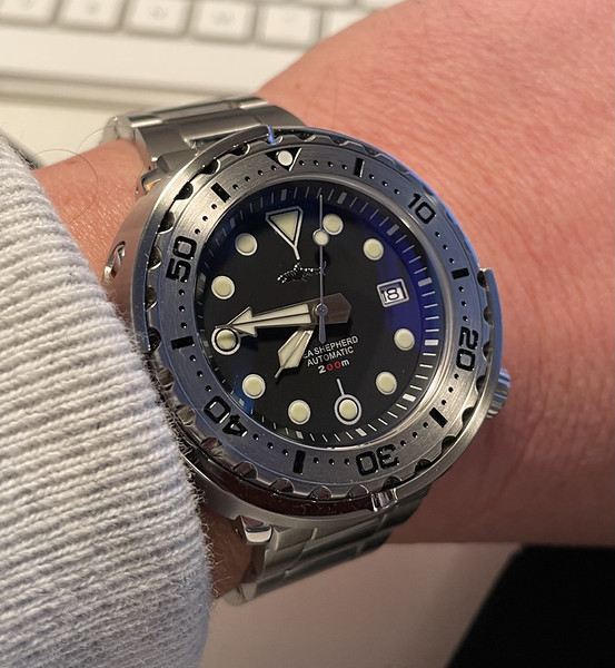 This is a very well done homage to the Seiko tuna, build quality is impressive at this price point. The sale will include everything as if purchased new. Any marks seen in photos are just dust, watch is in "like new" condition.