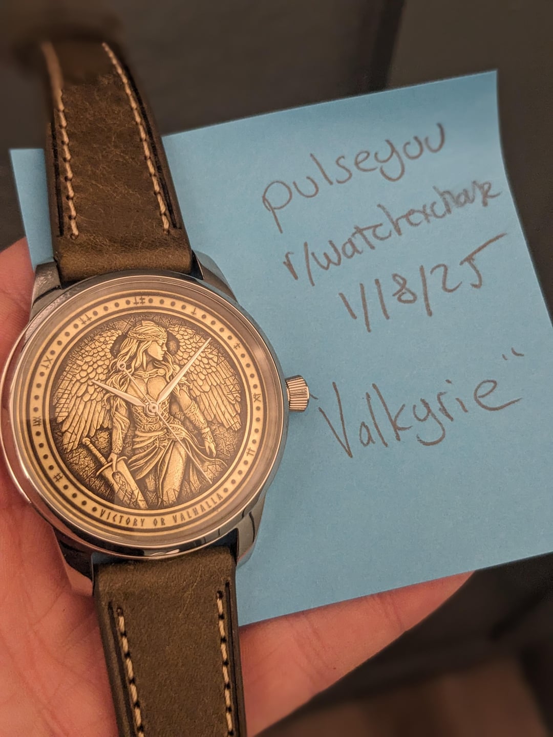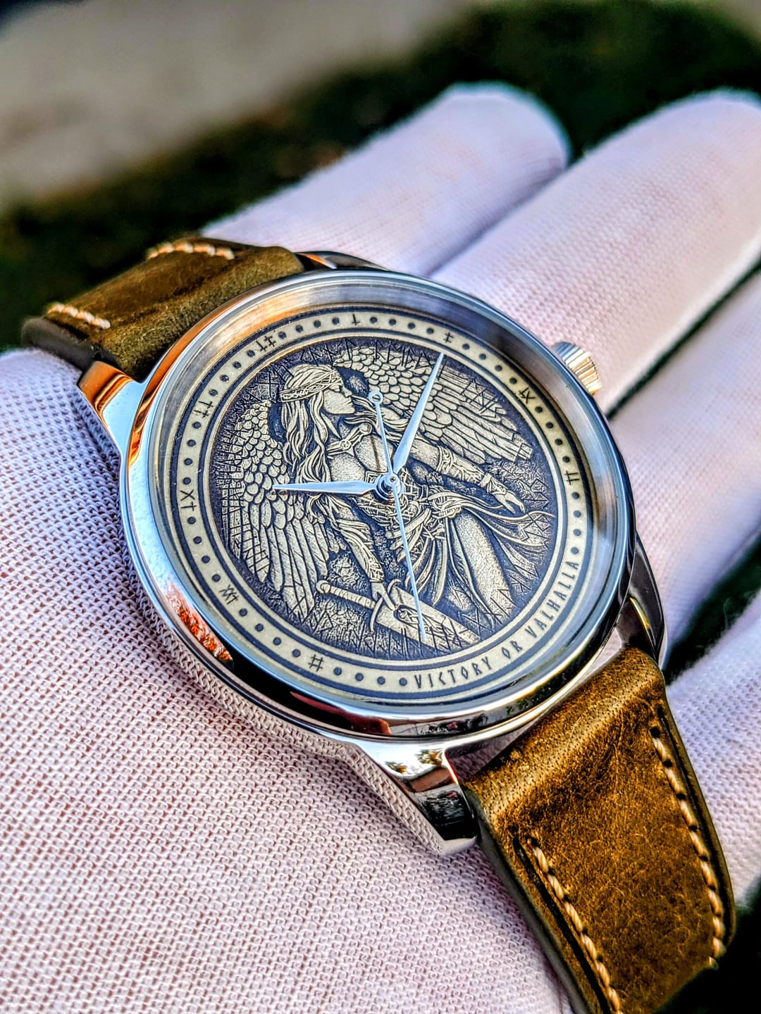 # VICTORY OR VALHALLA Videos, Photos, Timestamp: [https://imgur.com/a/IHMWQpY](https://imgur.com/a/IHMWQpY) [For a video of this dial being made click here.](https://www.instagram.com/reel/DExOkEVp1Fr/?utm_source=ig_web_copy_link&igsh=MzRlODBiNWFlZA==) Good morning. For sale today we have a 1 of 1 "Valkyrie." This dial was made by me on my 50w fiber laser. It has 256 layers to create a 3d effect on the dial, cut out of a 0.5mm sheet of bronze and then hand finished, polished, and waxed. The dial is 35mm which is a gorgeous size, a standard dial is 28.5mm so this dial is about 50% bigger. I have housed the dial in a beautiful 39mm dress watch case and it runs on a new Seiko NH38 automatic movement. The watch features an open caseback with a gold adorned rotor, and there is space for a text engraving of your choice. I am really happy with how this warrior came out. *All of my watches are completely customizable so if you would like to change anything about the watch please shoot me a message and would be happy to create something custom to fit your needs, or customize this dial further.* **Specs** Case Size: 39mm stainless steel dress case. Open caseback with the possibility of an engraving around the movement if you would like (complimentary). Strap Option: 20mm green leather strap with steel buckle. Dial: Custom designed, lasered, and hand finished 35mm dial featuring the "Valkyrie" 256 layers, please see the video linked of the 28.5mm version being made. She is a beauty. Movement: NH38 Seiko Movement w/ 41+ hour power reserve, hacking, 24 Jewels, Open caseback with adorned rotor. 12.5mm Thickness Comes with a travel watch pouch for safekeeping :\] **Condition** Everything is brand new and ready to be shipped. Watch was custom-built by me to the highest quality. Message me if you have any questions. **Asking** $299 shipped to CONUS. Will ship to other countries please contact me with location and I'll see what I can do. Payment via Venmo, Zelle, Cashapp, or Paypal+3%. [Other Custom Watches on my IG](https://www.instagram.com/cacustomwatches/)