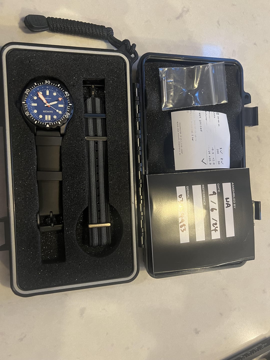 Asking **$600** (shipped) for a Sangin Instruments Professional (Sea Blue) w/ full box and papers that was just purchased directly from Sangin a few months ago. The watch is in like new condition and was worn only 3 or 4 times. Also, both the rubber and NATO straps are in new unworn condition (it was on an aftermarket NATO for the few days I wore it). Sangin is a very cool micro-brand that is owned and operated by a former Marine Raider. Their watches are super rugged/capable and have a strong following across military and first responder communities. You can read about them in this[ Watches of Espionage article](https://www.watchesofespionage.com/blogs/woe-dispatch/sangin-instruments-the-marine-owned-raider-rolex?srsltid=AfmBOoqq-E1DYB7ZgHiZ36UV7Ol69KDvIz4drA7Iv3SB2K_CE7G57KM-). Although it's a beautiful watch, it was a bit of an impulse purchase for me as I already have a quartz diver that I regularly wear. I'm hoping to pass it on to another owner who will enjoy wearing it more often. **General Specs** *Movement*: The Ronda quartz w/ GMT complication has been highly accurate as expected. *Case*: 43.5mm width x 49.5mm lug to lug x 12mm thickness w/ lug width of 20mm. It comes factory finished with a durable DLC coating. *Water Resistance:* Tested to 300m *Dial*: Very bright Superluminova indices and hands. Bezel is also luminous. Looking for payment via PP F&F or wire. I am also happy to jump on a video chat and show you the watch and answer any questions you might have. Thanks for looking!