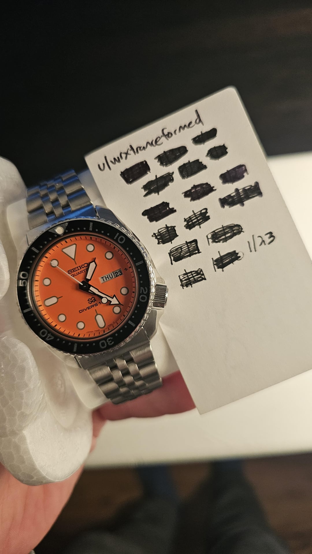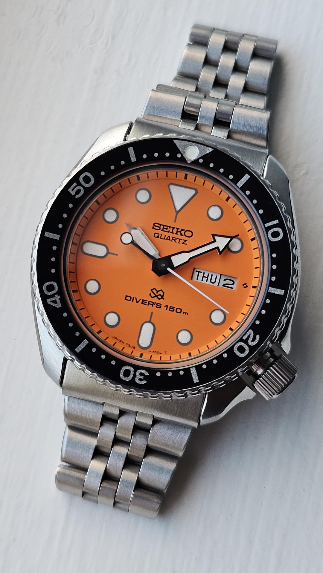 Hello again! I am very excited to offer up an extremely rare, near flawless condition vintage Seiko 7548-700A in the extremely rare “SQ Dial” variant from January 1986. According to a vintage Seiko enthusiast, this would have been very, very late in the model's run and this could be one of the very last of these that came off of Seiko's line. These watches are notorious for being dead nuts reliable and very capable watches even among modern watch standards. This example has the additional value of having been sold by and had a fully documented tear down service and quartz regulation by Tempo Prima! This watch is easily the nicest example of a 7548 that I’ve ever come across - I don't throw around "NOS" condition often but this fits the description. The case is flawless and does not appear to have been polished – all of the lines are super crisp. The bracelet is in incredible condition, I can’t find any significant marks on it at all. The watch functions as you expect it would having been fully serviced, I can provide pictures of the service process for the future buyer! The only thing to note is that the printing on the OEM date wheel was slightly off from the factory, so the number aligns just a hair toward the bottom of the date window. This was documented and pointed out by David at Tempo Prima, which is barely noticeable and imo makes it even more unique. The watch will come as “watch only” on its SQ bracelet and in a protective case from Tempo Prima. The bracelet is currently sized for about a 6.75” wrist and t will also include two extra links which should give it up to about a 7.5” wearability. Timestamp for Reddit: [https://preview.redd.it/wts-nos-condition-vintage-seiko-7548-700a-sq-dial-diver-v0-zjywcznxgree1.jpg?width=2252&format=pjpg&auto=webp&s=fcdfffd547528c6da03c77cbd0f0771265e9413a](https://preview.redd.it/wts-nos-condition-vintage-seiko-7548-700a-sq-dial-diver-v0-zjywcznxgree1.jpg?width=2252&format=pjpg&auto=webp&s=fcdfffd547528c6da03c77cbd0f0771265e9413a) This is a very rare variant and there don’t seem to be any other comps on the market other than when this sold from Tempo Prima for $1,550. With that, the price for this one is $1,300 which includes fully insured shipping to the US. Not interested in trades at this time, trade offers will be ignored. Please message me with any questions or interest and thanks for looking!