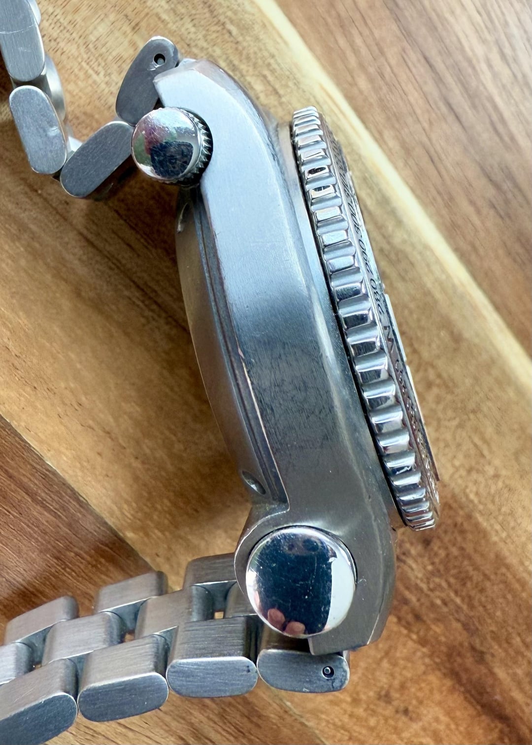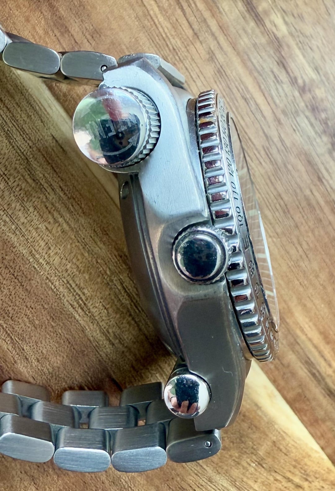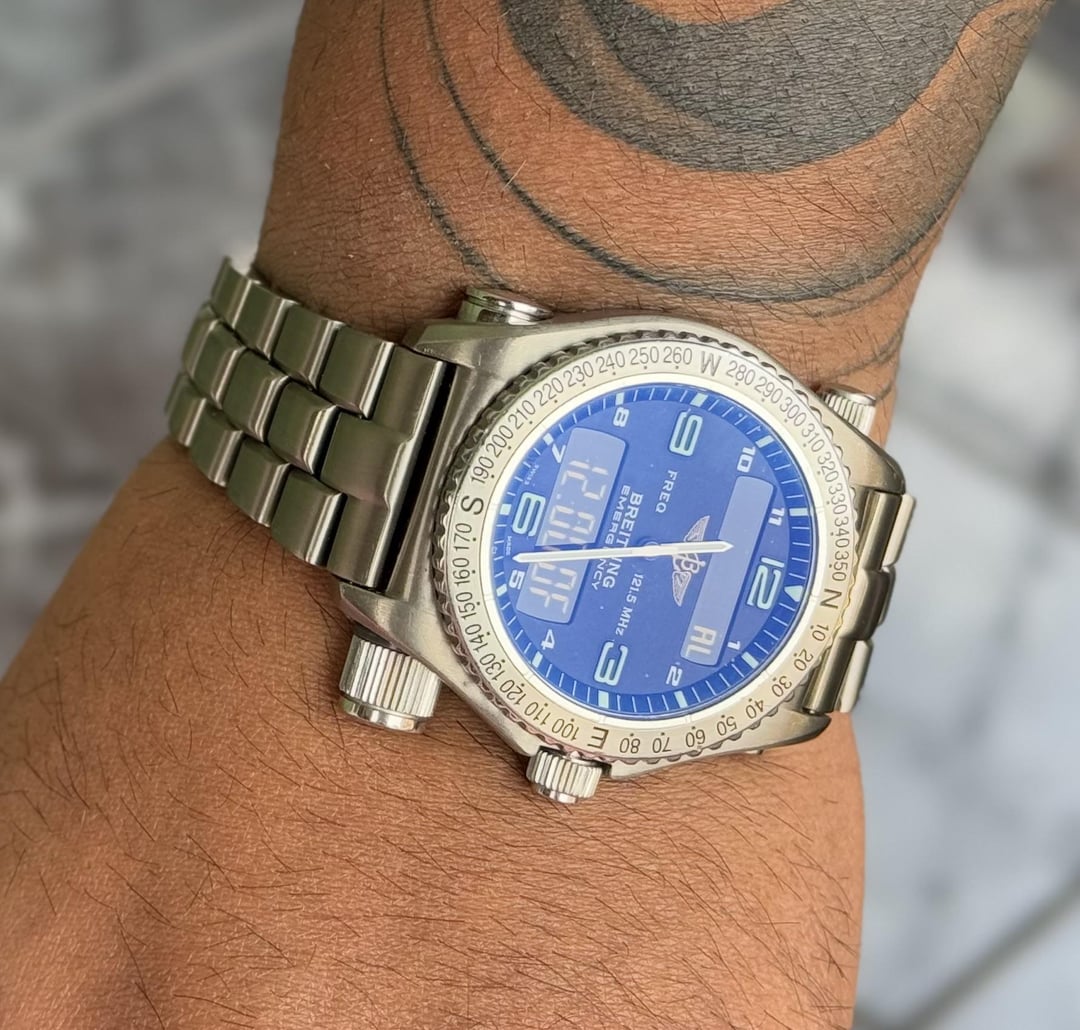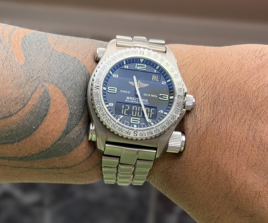 Hey Folks Up for grabs is my Breitling Emergency in excellent used condition. Sized a bit loose for my 7.5” wrist it’s perfectly wearable as a daily piece with a multitude of usable features from date, day, alarm to chrono and timer. At 43mm, the watch seems larger than it is, wearing closer to a 41mm sizing owing also to the titanium feather weight. The dial is a bluish hue, though it appears black in a lot of lighting situations This model includes the watch, service box and tester, though you will also need a walkie talkie to tune in to 121.5 hz frequency to benefit from the testing experience There are no dings or dents on the watch just a spattering of hairlines throughout the case sides, bracelet case back and clasp I’m asking $2699 shipped Canada and US Watch and I are in Ontario, Canada Follow me on IG @wristrolls for other unposted items