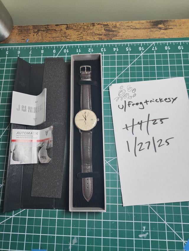 Hello WatchExchange Long-time buyer here, first time seller. Looking to finally trim down my watch collection and I'll be putting up a few other items over the weeks. Mostly lower cost affordable beginner watches perfect for someone getting into the hobby. Today I am putting up my Junkers Bauhaus 6060-5 This watch was purchased in 2019 and I am the original owner. It was worn a few dozen times throughout 2019 but has mostly sat in a watchbox ever since. Full Information: Brand: Junkers Model: Bauhaus 6060-5 Movement: Miyota 9132 - Automatic, hacking, handwinding, 40 hour power reserve Case diameter: 40mm Thickness: 12,5mm Lug-to-lug: 43mm Lug width: 20mm Service History: Has not been serviced but has had very little active wear. Condition: Case and acrylic crystal are in very good condition consistent with normal wear. No major scratches. Some minor scuffs here and there. Watch has spent the majority of its life in a watchbox. The crystal can be easily buffed with polywatch if it ever gets scuffed. Strap: Comes with the original leather strap The watch comes in the original box with documentation. Shipping Method: CONUS via USPS Priority Payment Method: I accept Paypal F&F or Zelle Price: $285 Photos/Video/Timestamp: [https://imgur.com/a/jwJj6Hg](https://imgur.com/a/jwJj6Hg) Wrist shot included, 7 inch and change wrist for reference. This watch is great, and a cool alternative to other more pricey Bauhaus type watches. The tan dial is clean as heck and ultra readable. It's got two sub-dials, one showing the power reserve (40 hours) and the other showing a full 24 hour tracker, which I always found super useful when setting the date so I know if I was in AM or PM. I'm selling this watch since my tastes have changes and it doesn't really appeal to me anymore. Hoping someone else will wear it and love it! Please PM if you're interested or have questions!