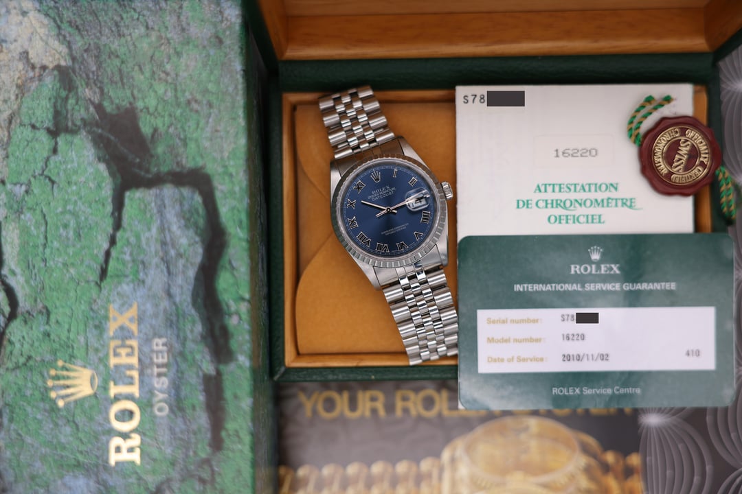 [WTS] 1997 Rolex Datejust Ref. 16220 | Blue Roman Numeral Dial | Box and Papers