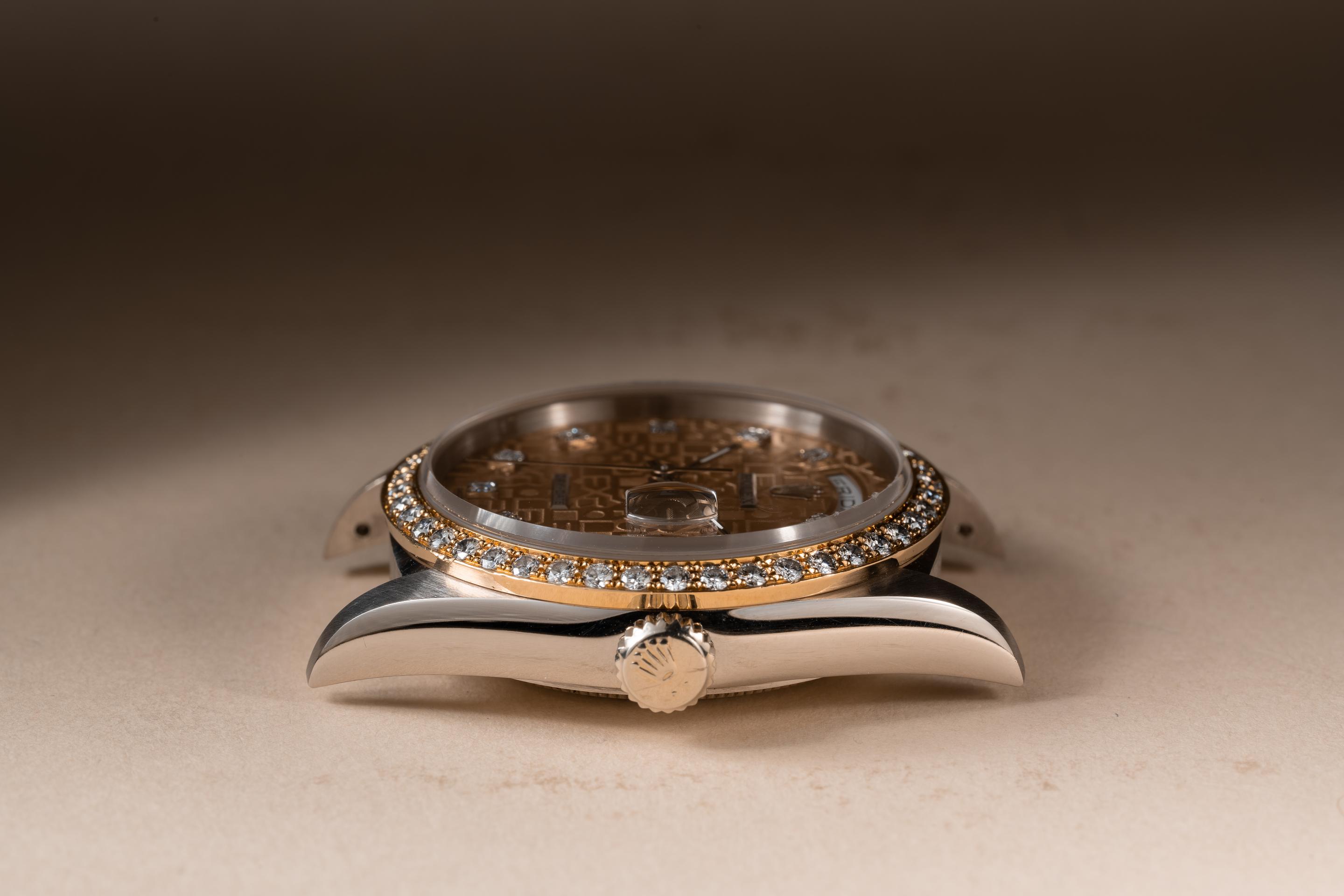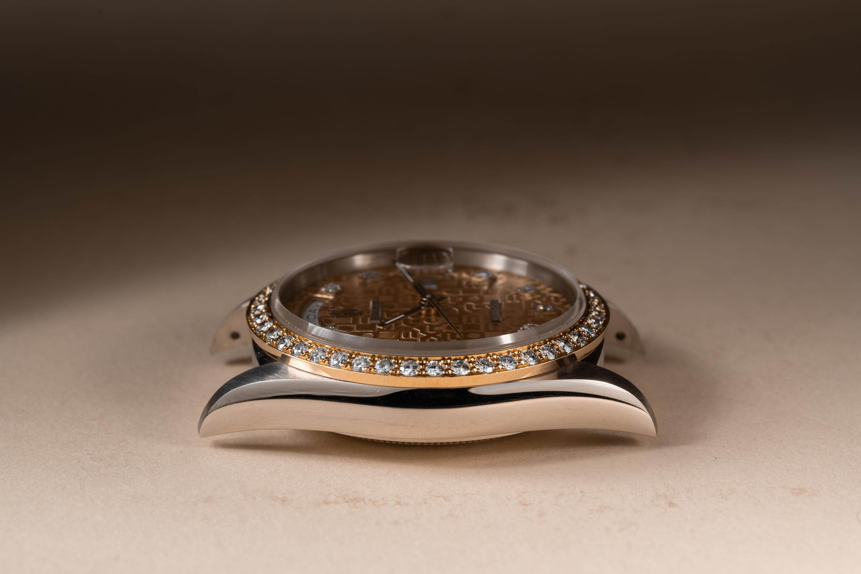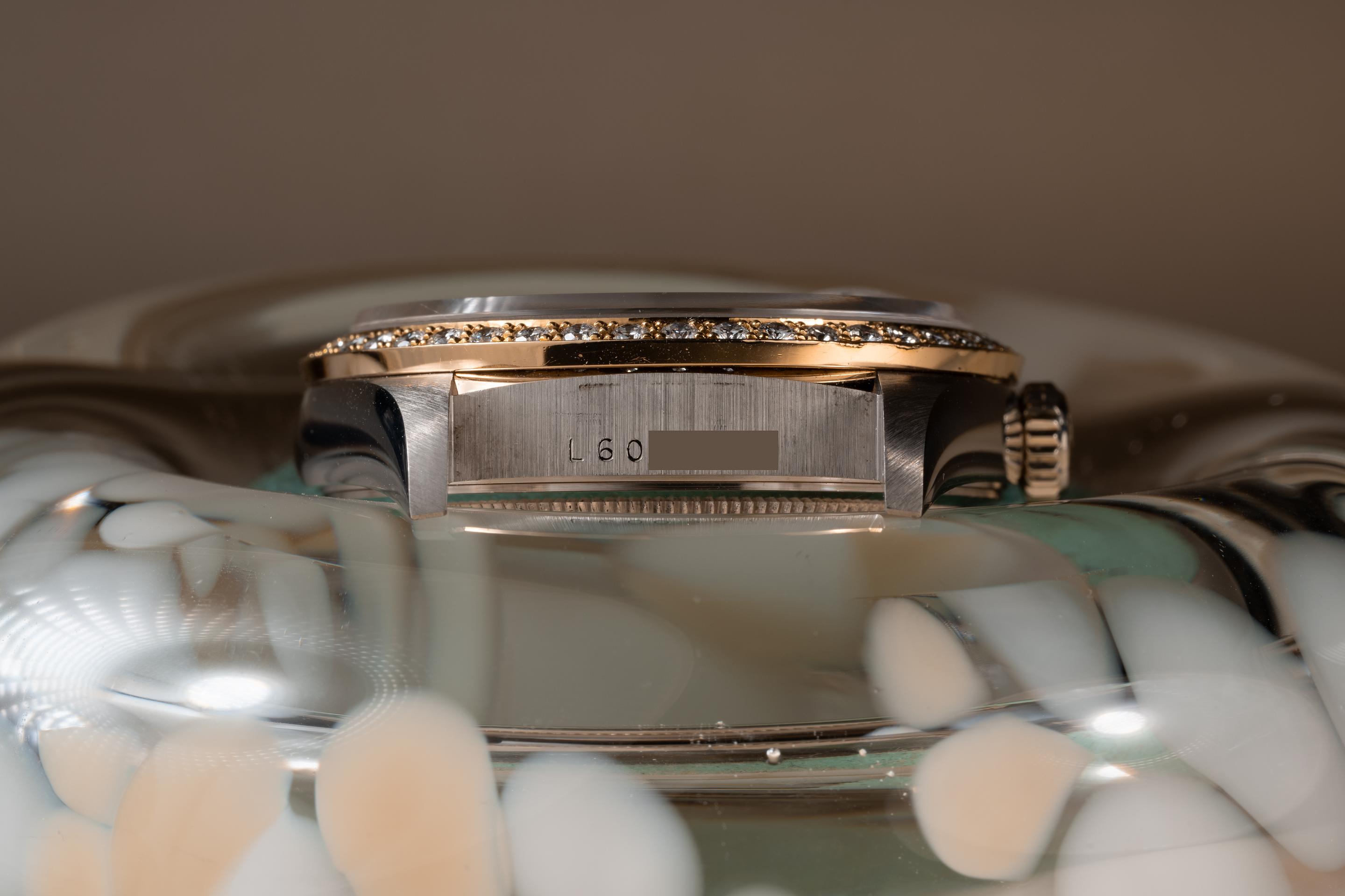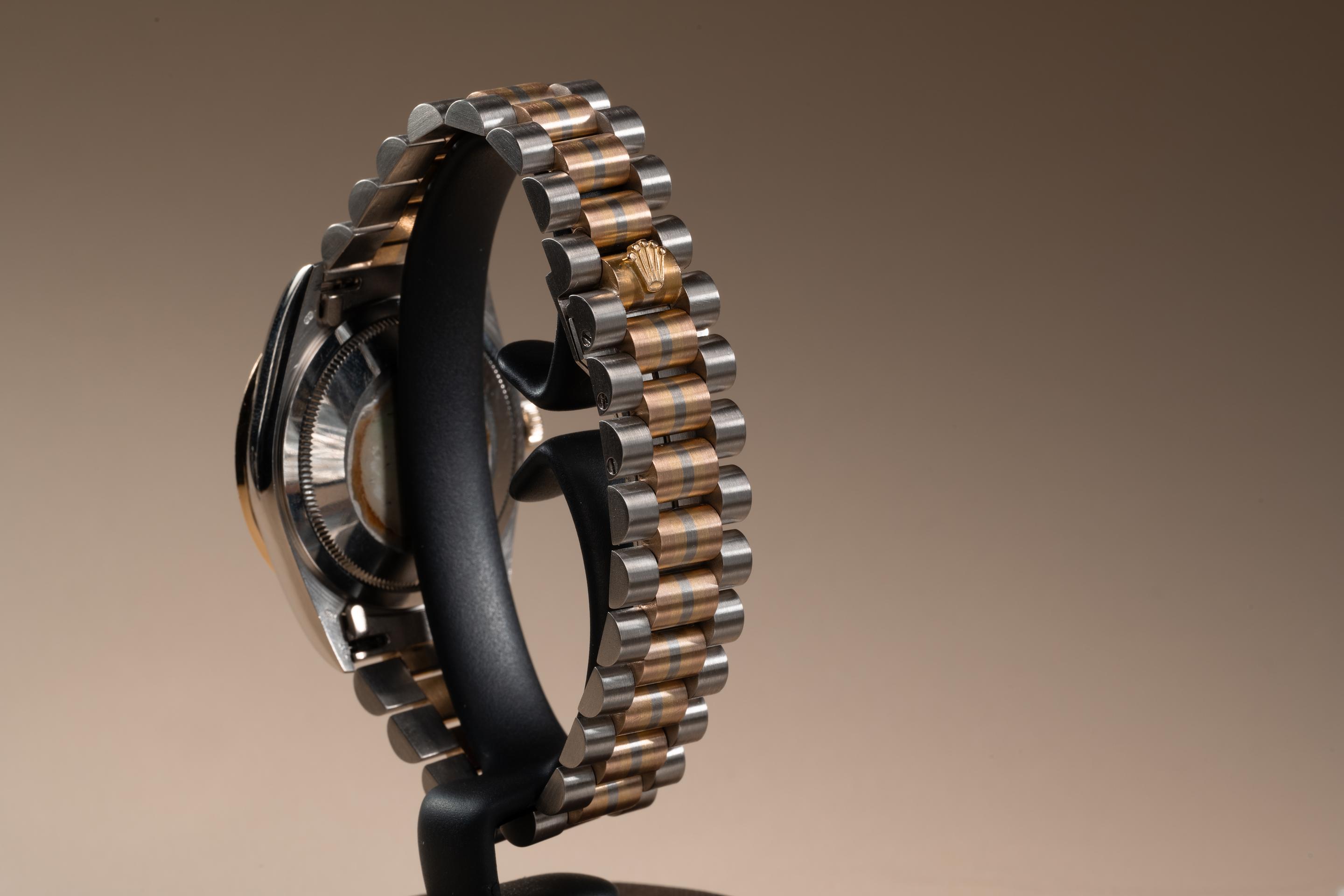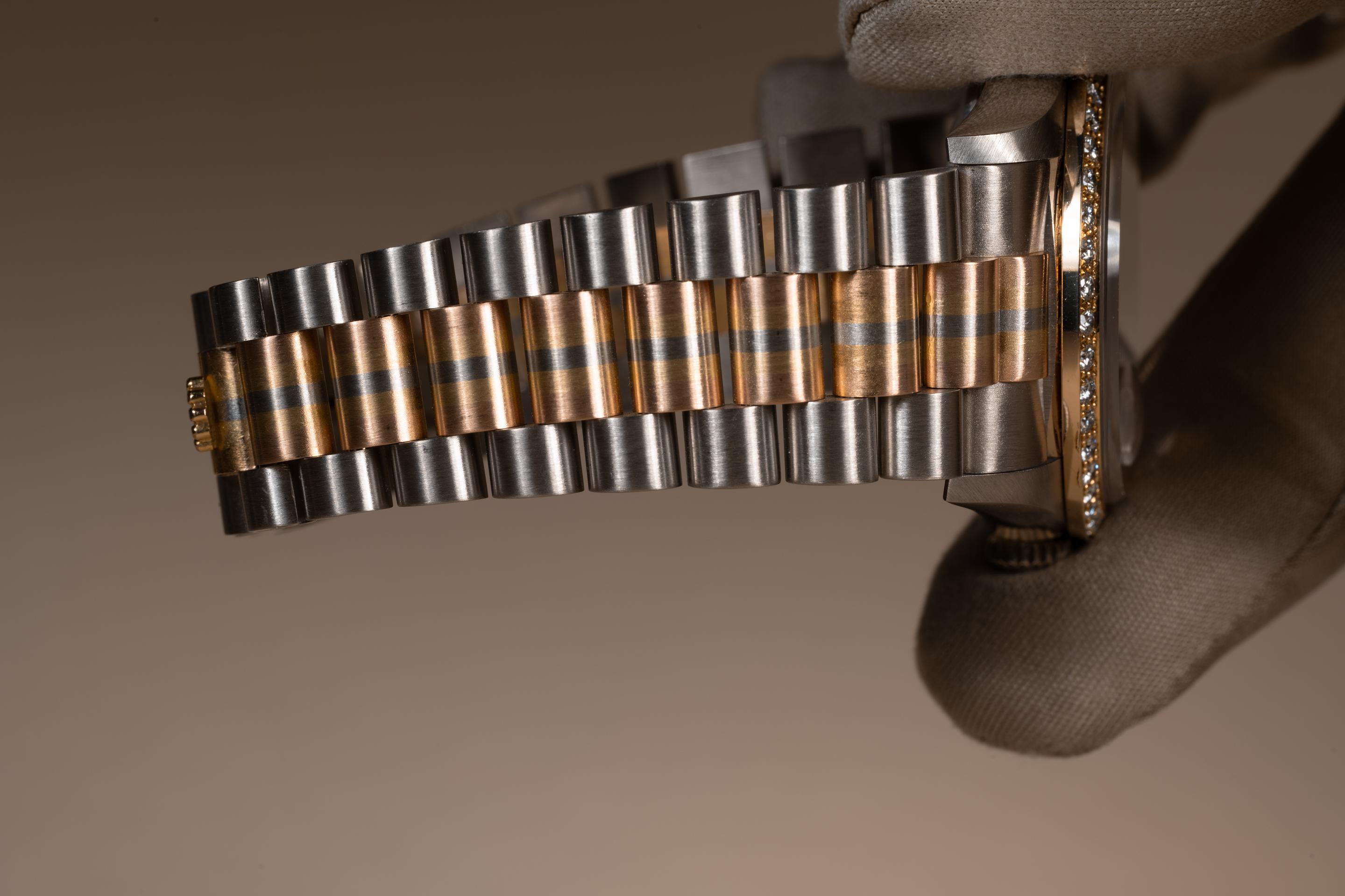 Description: Case: The thick and even 18k white gold case is excellent showing only very light wear from use. The 18k rose gold and diamond bezel is also in excellent condition showing only very light wear from use. Dial: The rose gold square set diamond jubilee dial is excellent showing no visible wear. The 18k white gold hands are also in excellent condition and appear to be original to the watch. The tritium lume on the hands has aged to a clean creamy hue. Bracelet: The 22 link 18K white, yellow & rose gold President bracelet is excellent showing only light stretch for its age. The clasp is stamped with a matching 1989 date code. The bracelet will fit up to a 17.5 cm. / 6.88" wrist. Accessories: None.