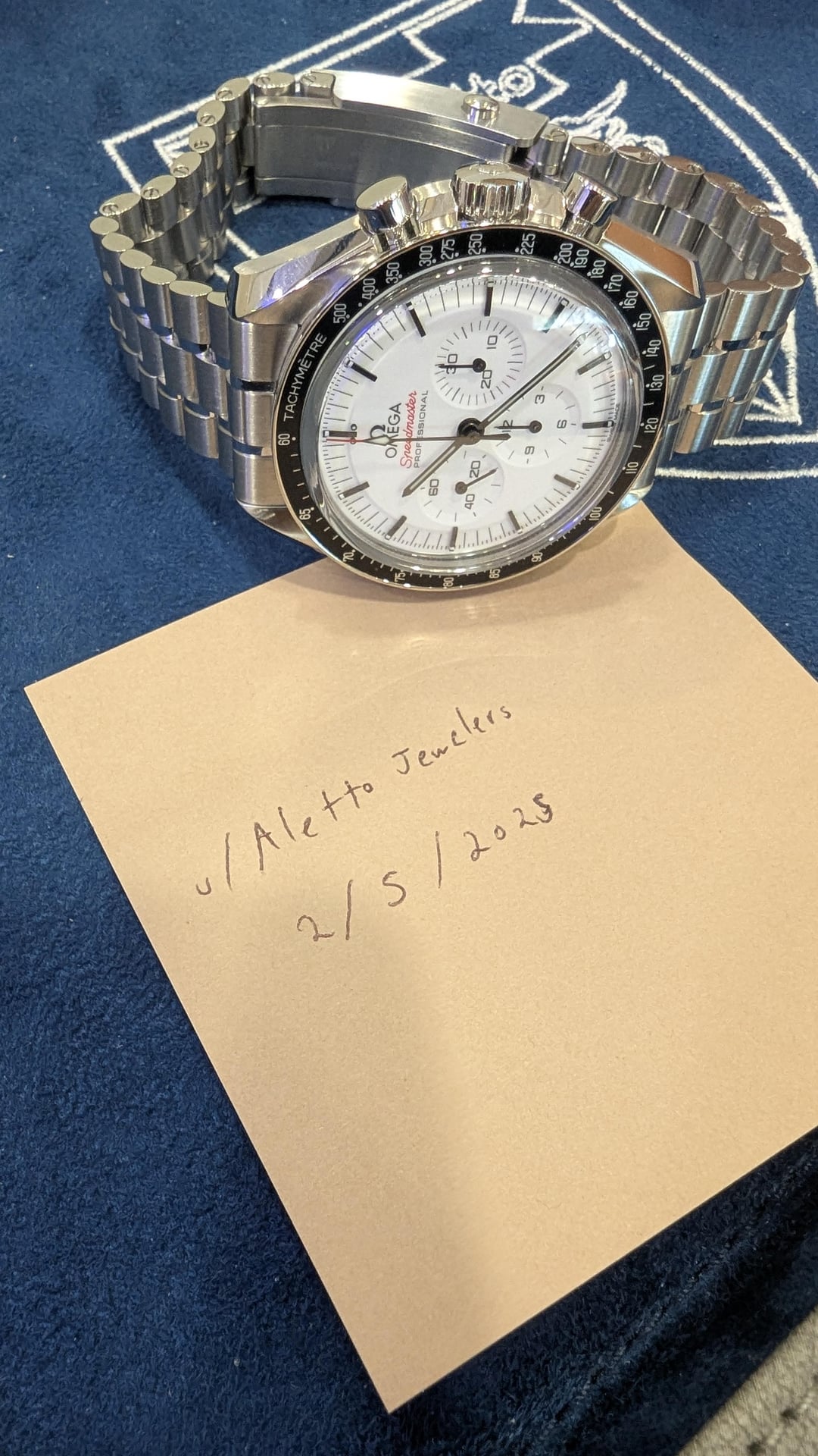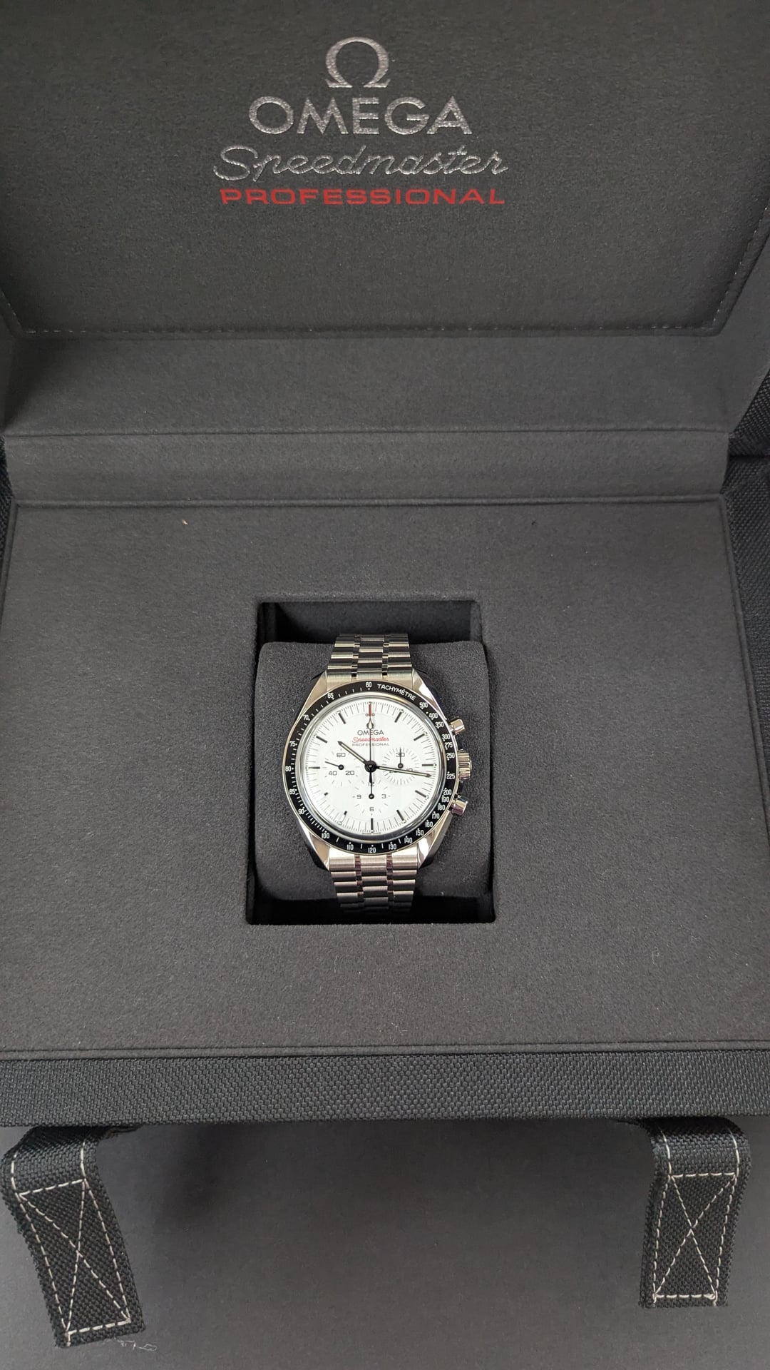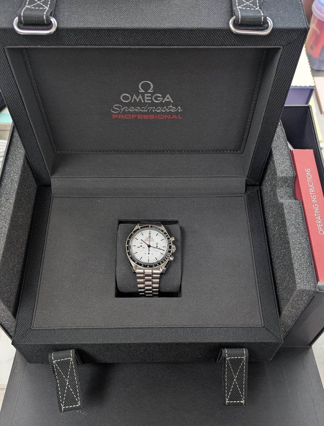 My last speedy left the shop a week ago, so I had to have another, this time in white. It’s pristine and in new condition, and we have it on offer here for Reddit. Price $7,900. Inquiries about offers are welcome. Case * Material: Stainless Steel * Diameter: 42 mm * Thickness: 13.2 mm * Crystal: Scratch-resistant sapphire crystal with anti-reflective treatment inside * Water Resistance: 5 bar (50 meters / 165 feet) Movement * Caliber: Omega Co-Axial Master Chronometer Calibre 3861 * Power Reserve: 50 hours Shipping Domestic (USA): Complimentary FedEx Priority Overnight (Morning Delivery) Payment Methods Wire and Zelle for first time buyers. Service History The watch has been inspected to confirm it is in excellent mechanical and cosmetic condition and is brand new.. Any routine maintenance or servicing is covered under a two-year service warranty (details available upon request). About Us Aletto Jewelers is a family-owned business with five generations of heritage, offering a selection of premier watch brands, GIA-certified diamonds, and estate jewelry. For over two decades, our showroom in the heart of Boca Raton, Florida has showcased timeless pieces with enduring style. Our commitment to quality and impeccable craftsmanship informs everything we do, ensuring that each piece you select meets the highest standards. Please follow us on Instagram, Youtube, or Tiktok if you’d like to see more of our selection: * [https://www.](https://www.tiktok.com/@alettojewelers?lang=en)[instagram.com/alettowatches/](http://instagram.com/alettowatches/) * [https://www.tiktok.com/@alettojewelers](https://www.tiktok.com/@alettojewelers?lang=en) * [https://www.youtube.com/channel/UC83BfOrE3zlpyk9kg5dSJjg](https://www.youtube.com/channel/UC83BfOrE3zlpyk9kg5dSJjg)