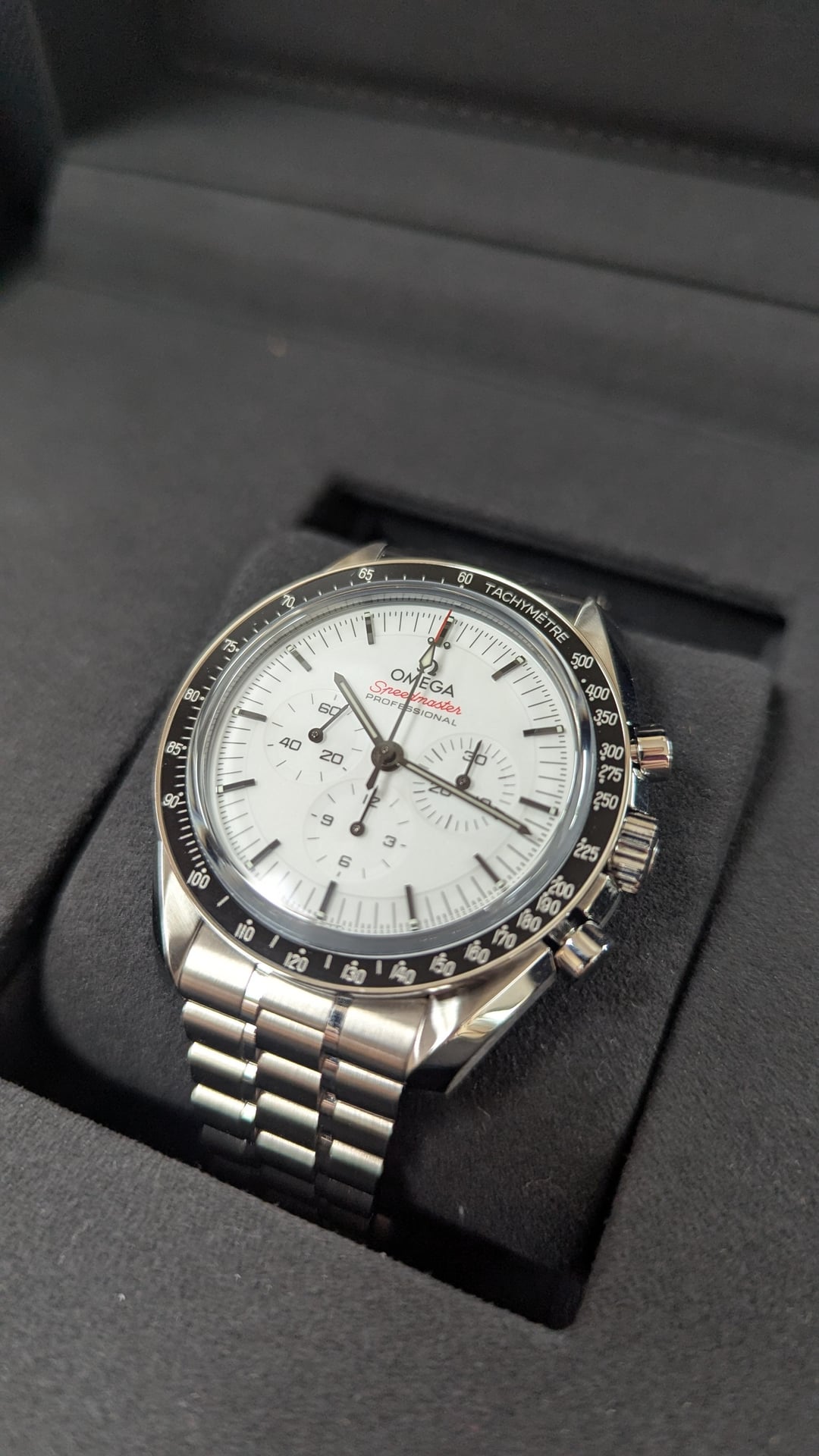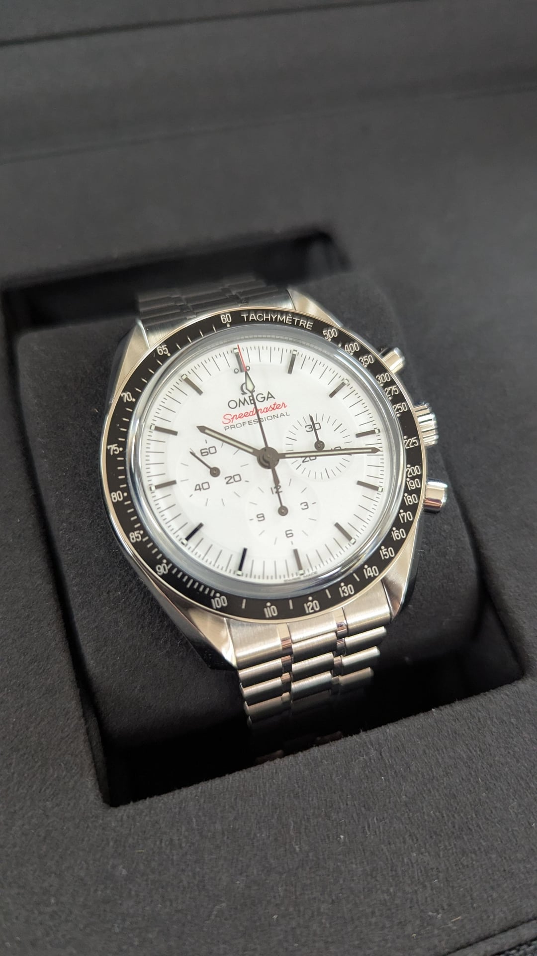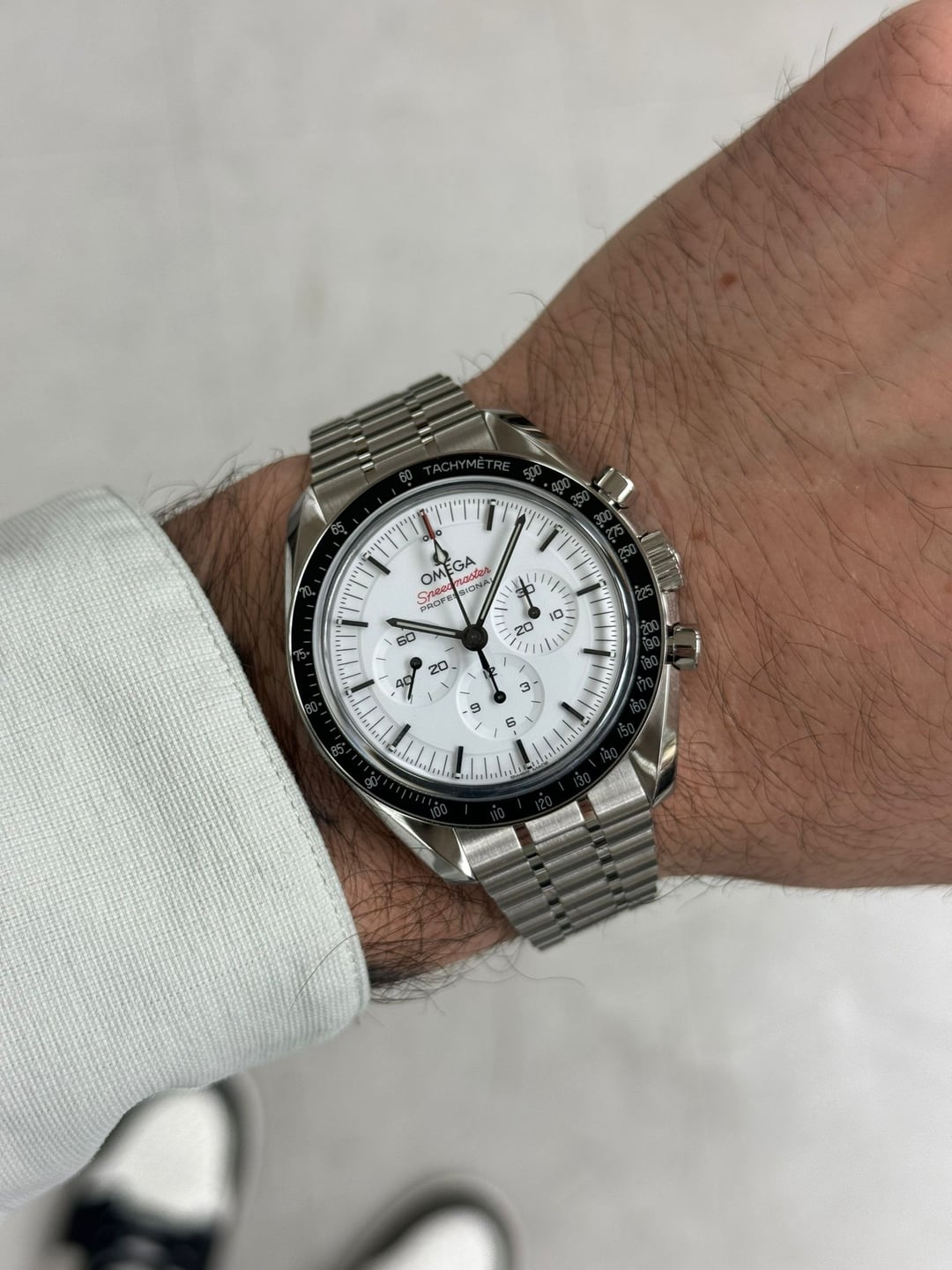 My last speedy left the shop a week ago, so I had to have another, this time in white. It’s pristine and in new condition, and we have it on offer here for Reddit. Price $7,900. Inquiries about offers are welcome. Case * Material: Stainless Steel * Diameter: 42 mm * Thickness: 13.2 mm * Crystal: Scratch-resistant sapphire crystal with anti-reflective treatment inside * Water Resistance: 5 bar (50 meters / 165 feet) Movement * Caliber: Omega Co-Axial Master Chronometer Calibre 3861 * Power Reserve: 50 hours Shipping Domestic (USA): Complimentary FedEx Priority Overnight (Morning Delivery) Payment Methods Wire and Zelle for first time buyers. Service History The watch has been inspected to confirm it is in excellent mechanical and cosmetic condition and is brand new.. Any routine maintenance or servicing is covered under a two-year service warranty (details available upon request). About Us Aletto Jewelers is a family-owned business with five generations of heritage, offering a selection of premier watch brands, GIA-certified diamonds, and estate jewelry. For over two decades, our showroom in the heart of Boca Raton, Florida has showcased timeless pieces with enduring style. Our commitment to quality and impeccable craftsmanship informs everything we do, ensuring that each piece you select meets the highest standards. Please follow us on Instagram, Youtube, or Tiktok if you’d like to see more of our selection: * [https://www.](https://www.tiktok.com/@alettojewelers?lang=en)[instagram.com/alettowatches/](http://instagram.com/alettowatches/) * [https://www.tiktok.com/@alettojewelers](https://www.tiktok.com/@alettojewelers?lang=en) * [https://www.youtube.com/channel/UC83BfOrE3zlpyk9kg5dSJjg](https://www.youtube.com/channel/UC83BfOrE3zlpyk9kg5dSJjg)